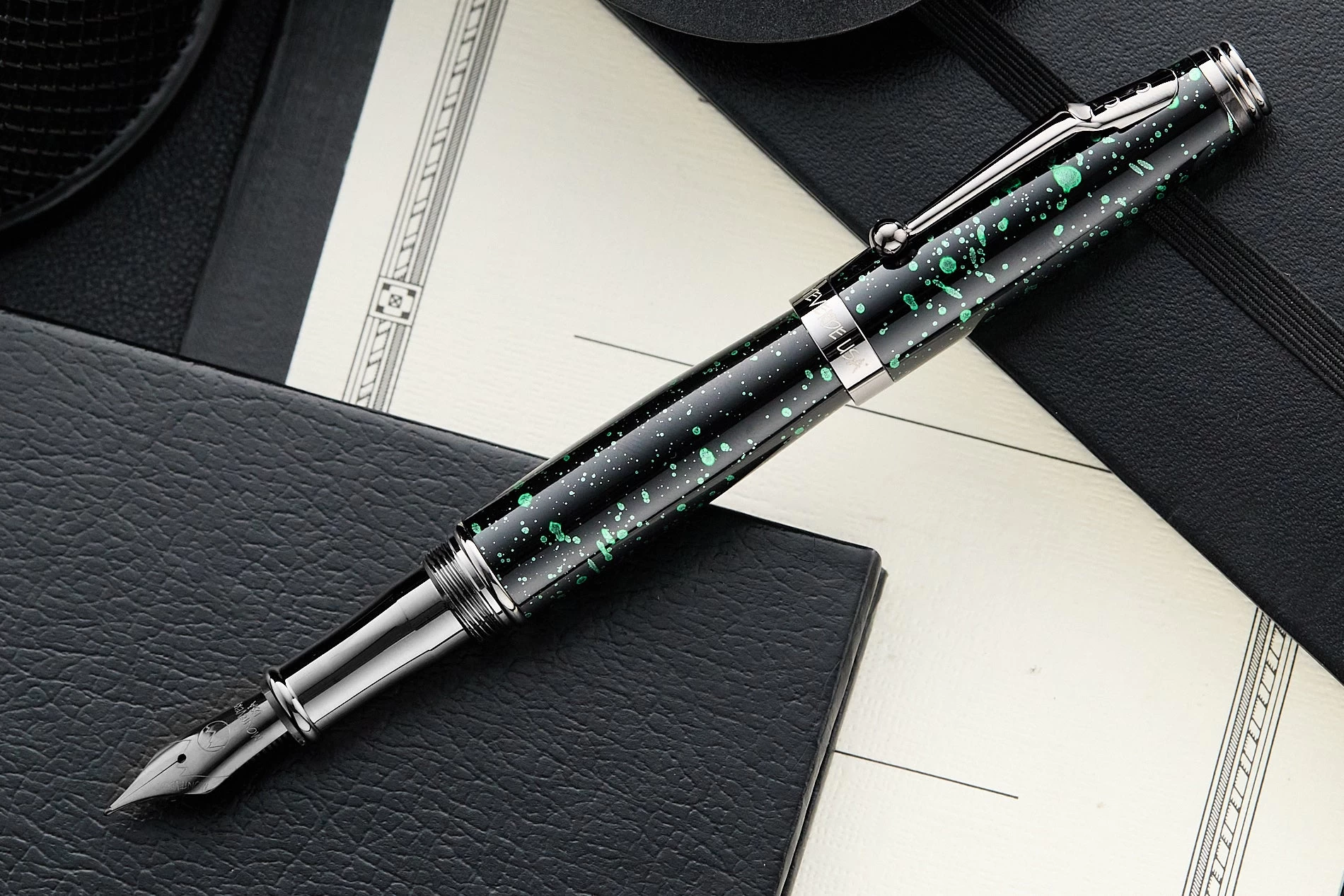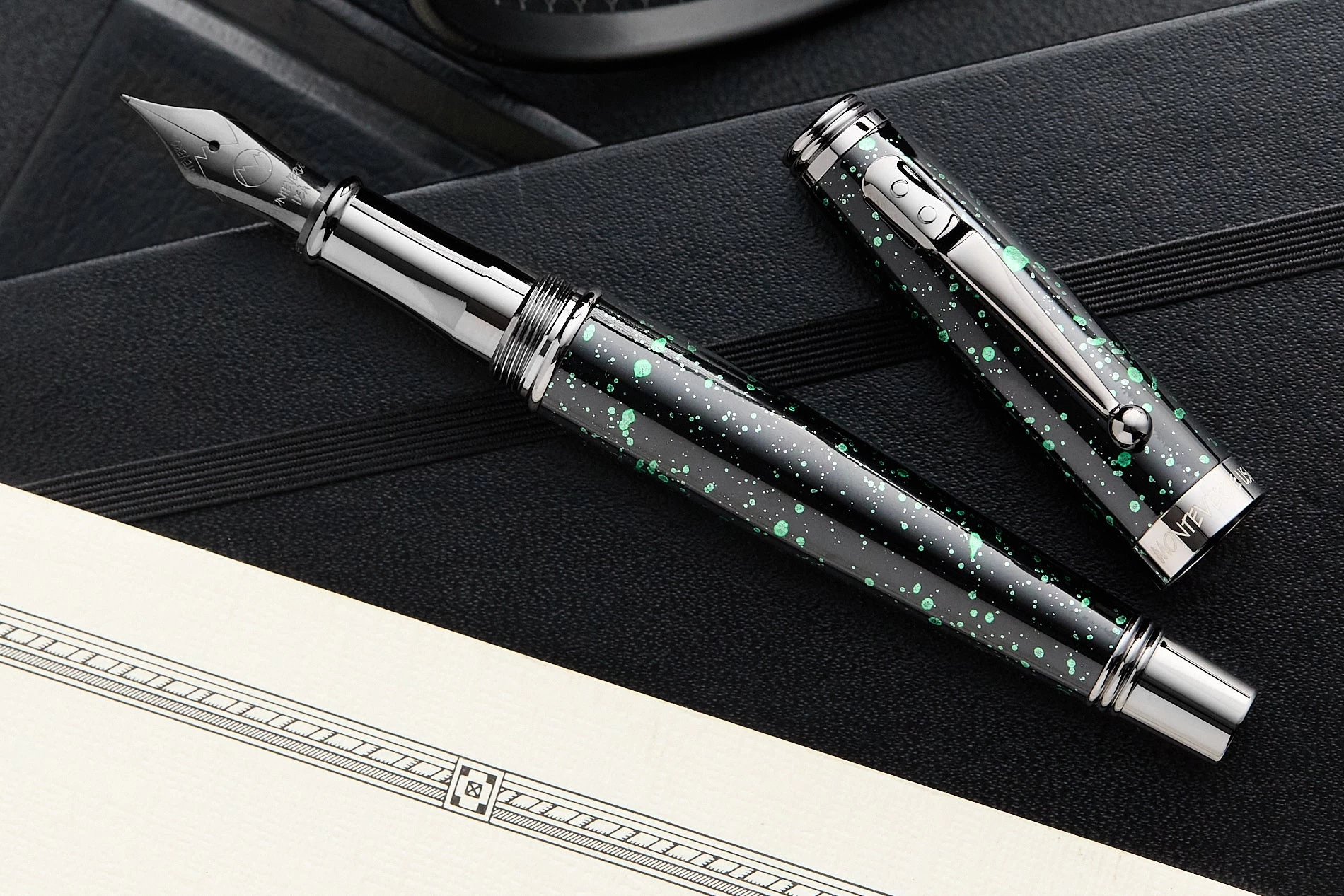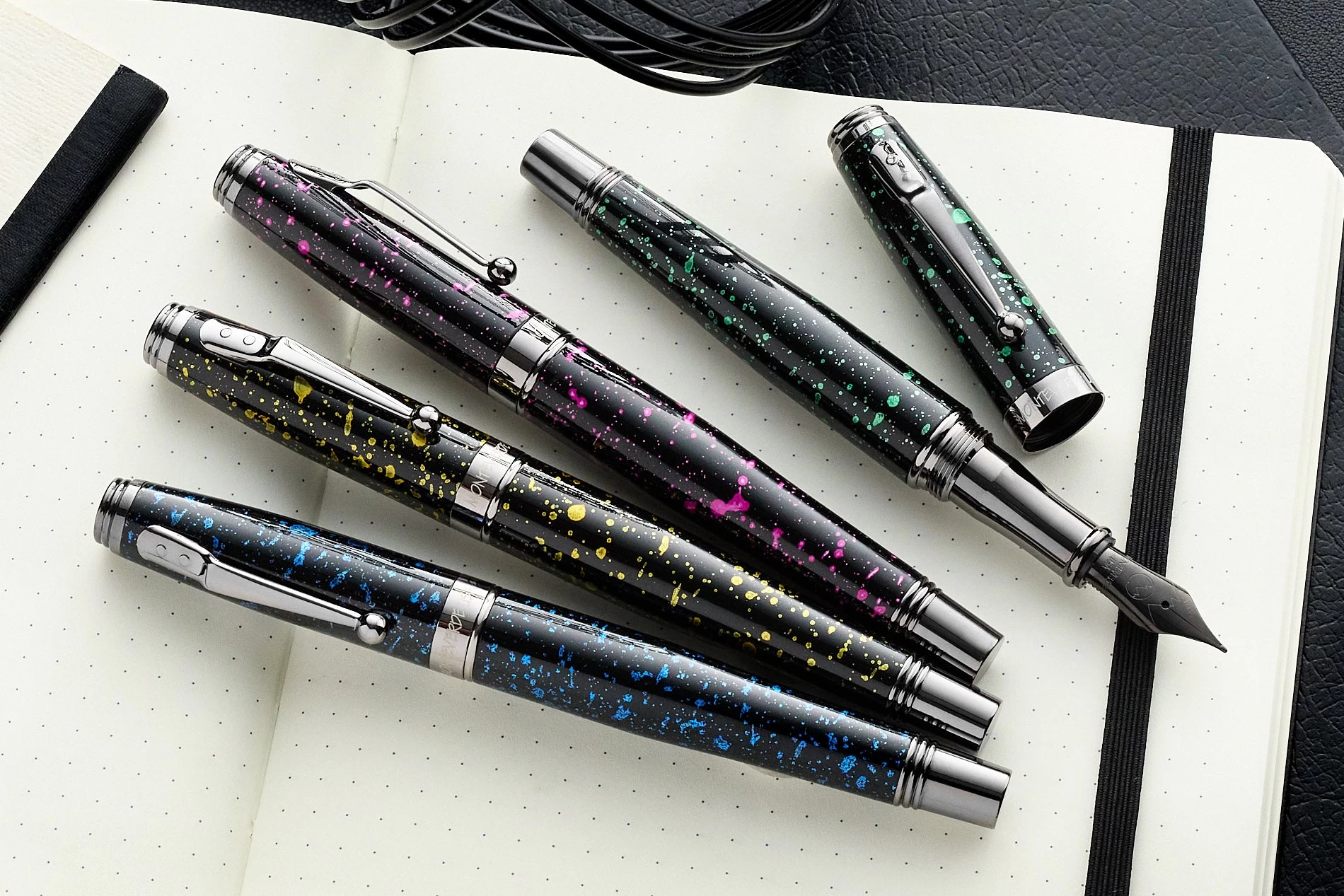 The Vega Collection brings a splash of color to Montverde’s flagship Invincia collection. The solid brass barrels and heavy lacquer coating with green splatter are accented with gun metal trim, making each pen fun and functional.Â