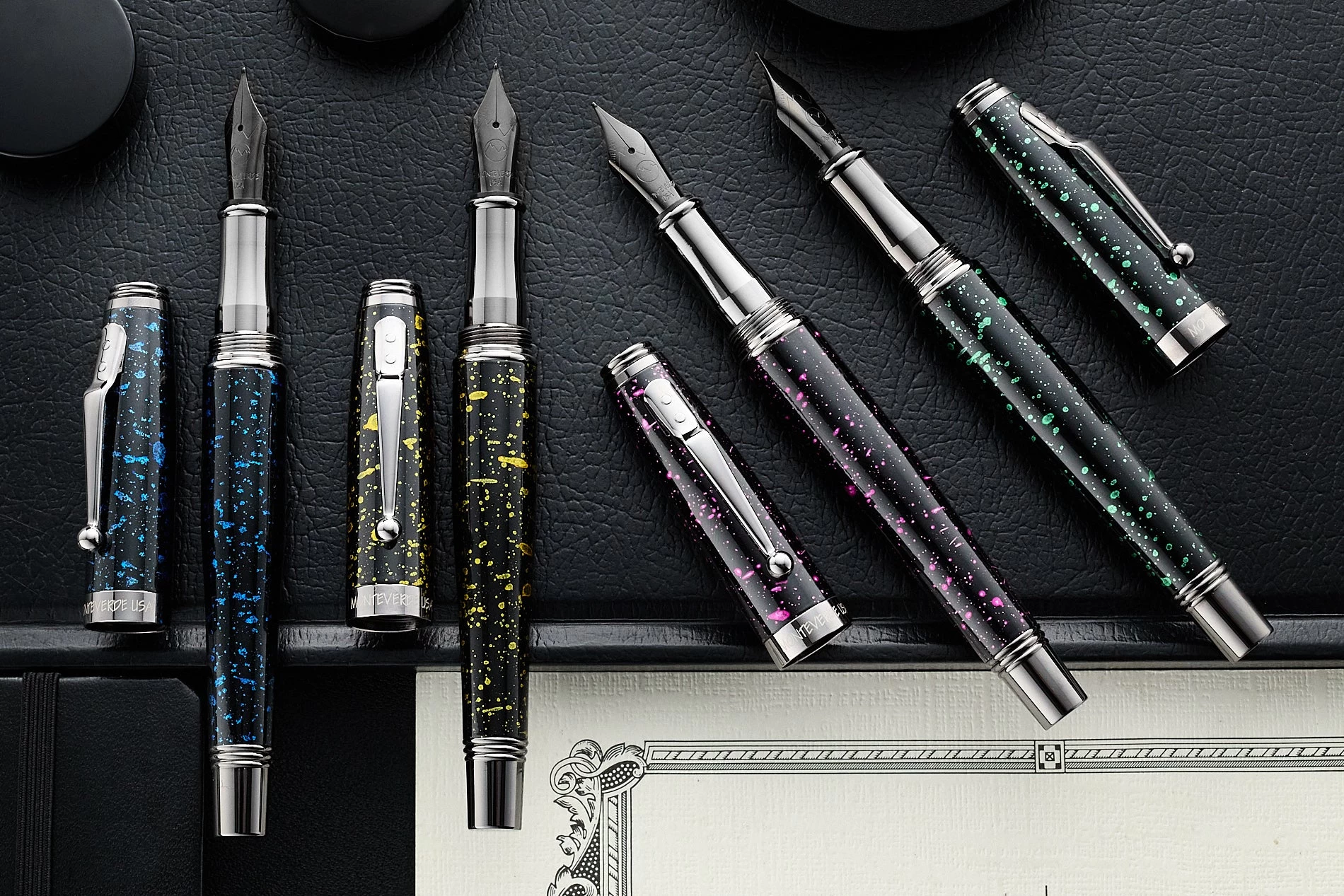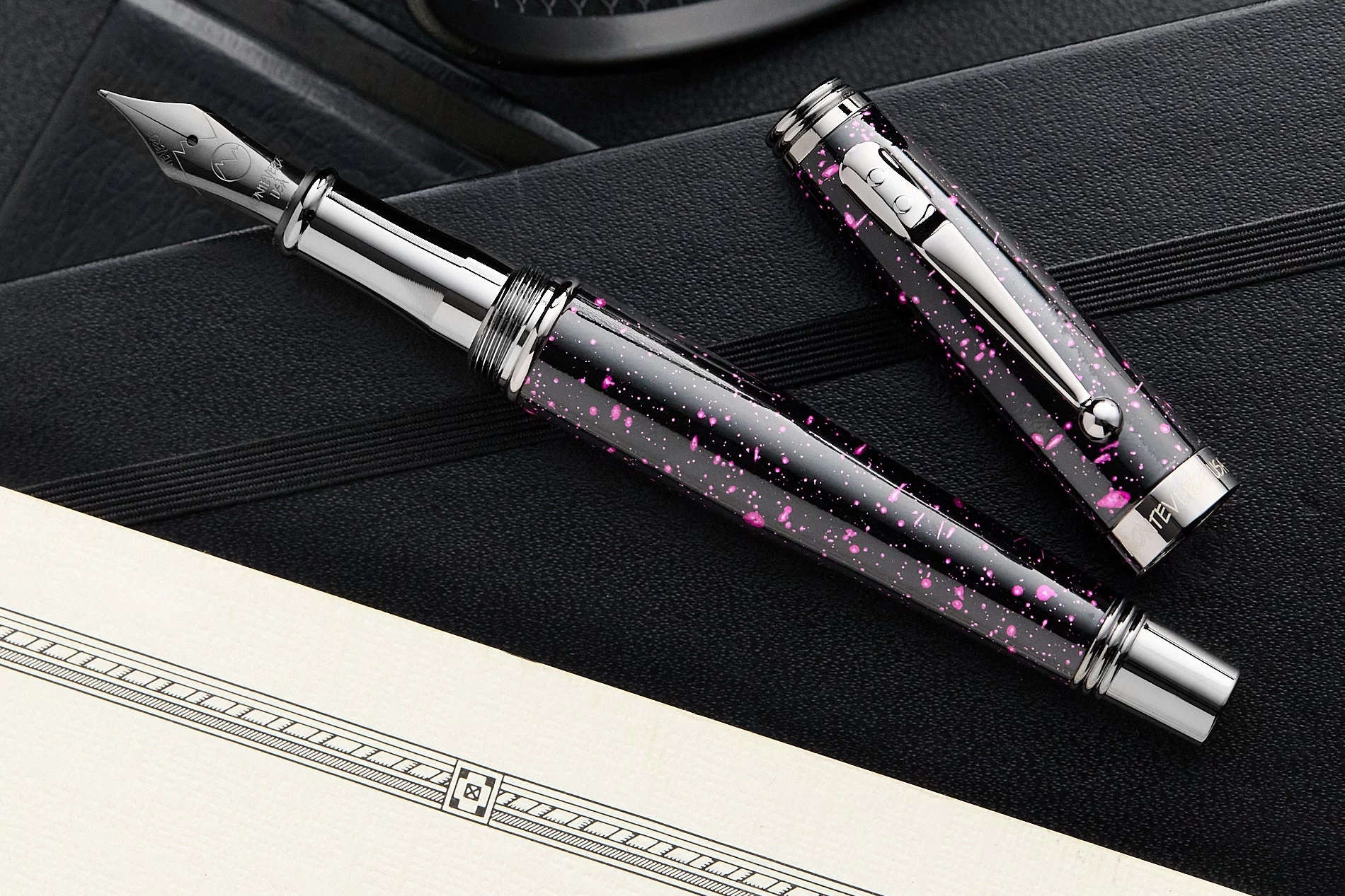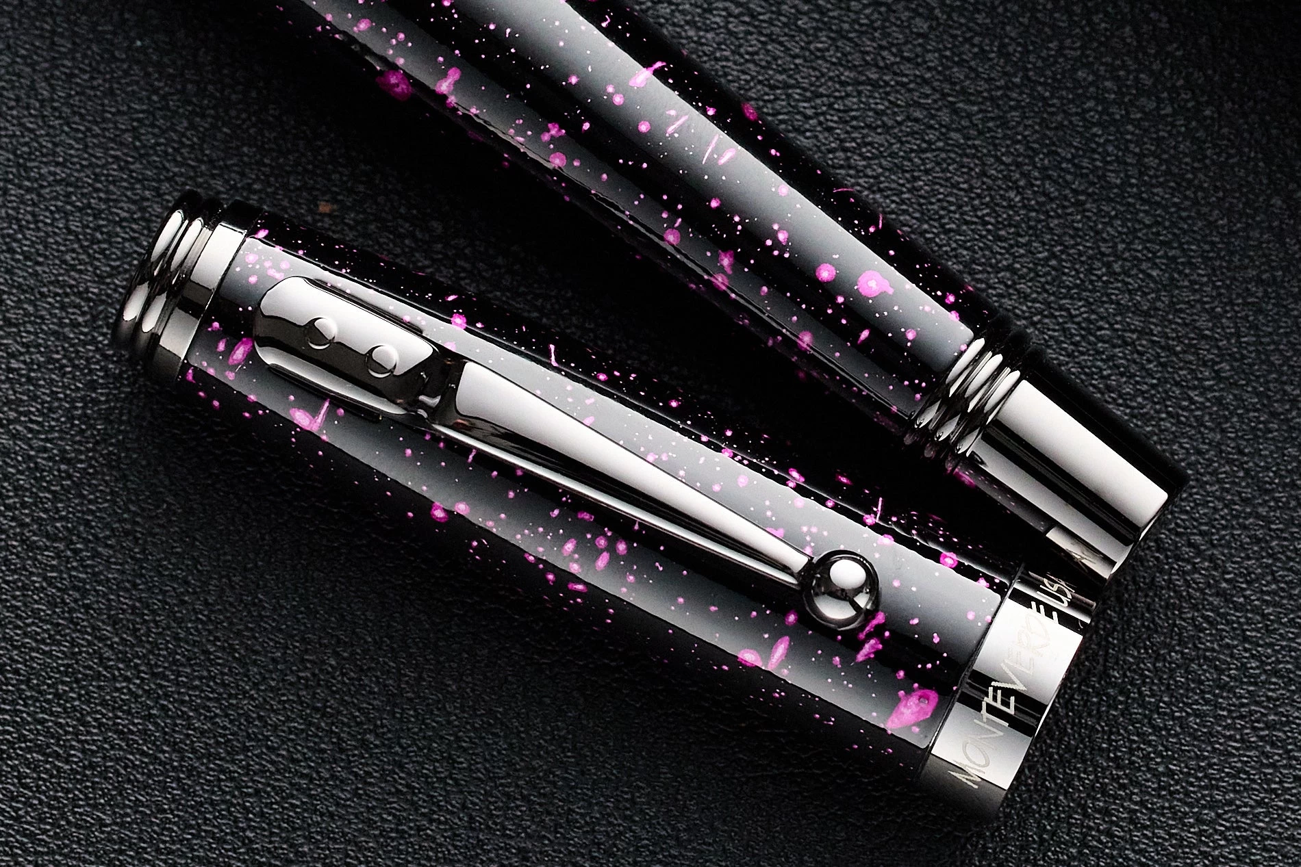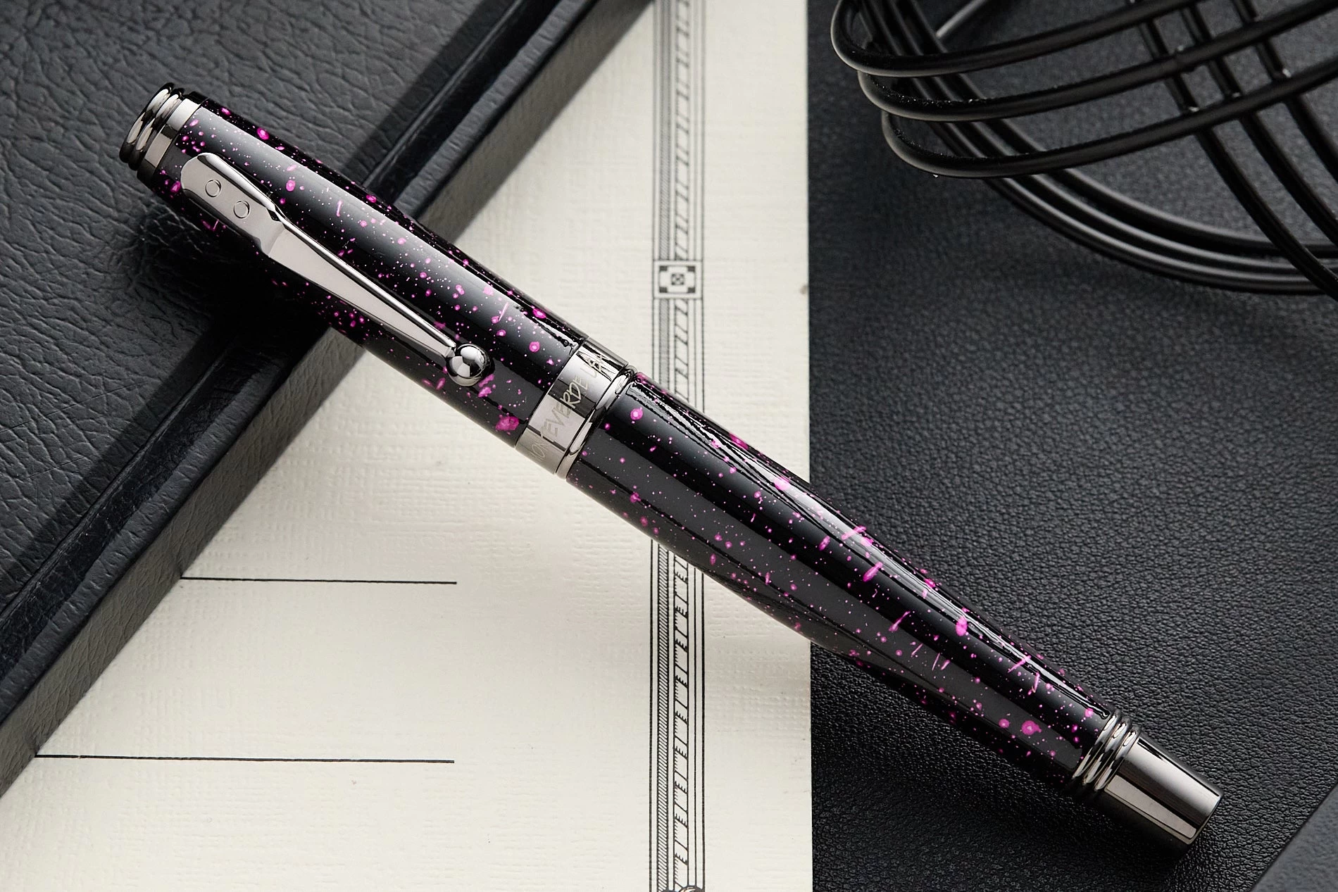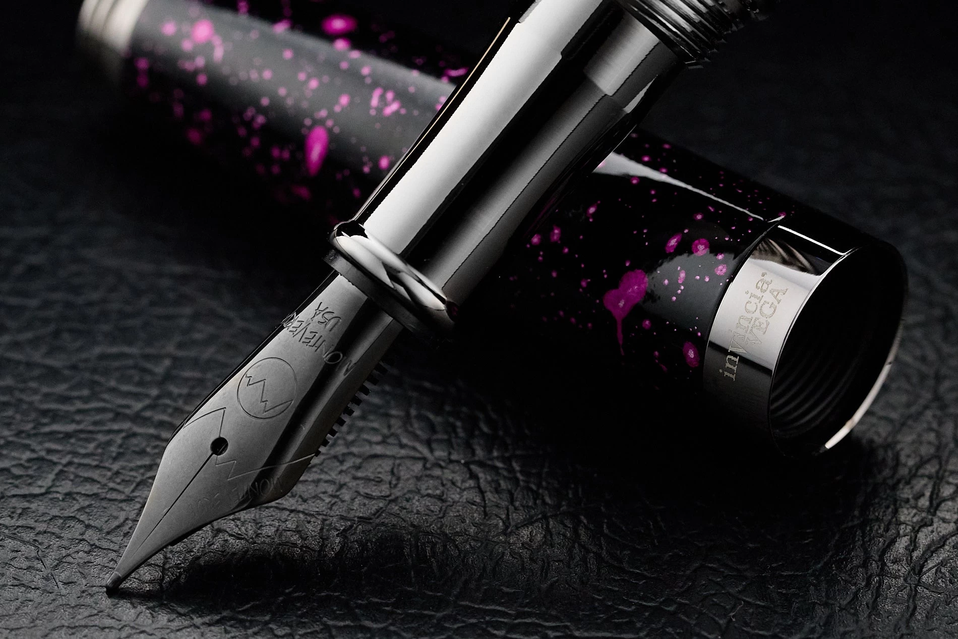The Vega Collection brings a splash of color to Montverde’s flagship Invincia collection. The solid brass barrels and heavy lacquer coating with purple splatter are accented with gun metal trim, making each pen fun and functional.