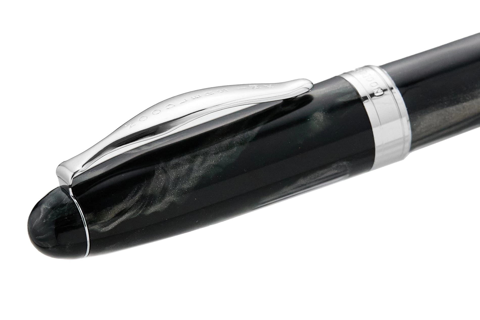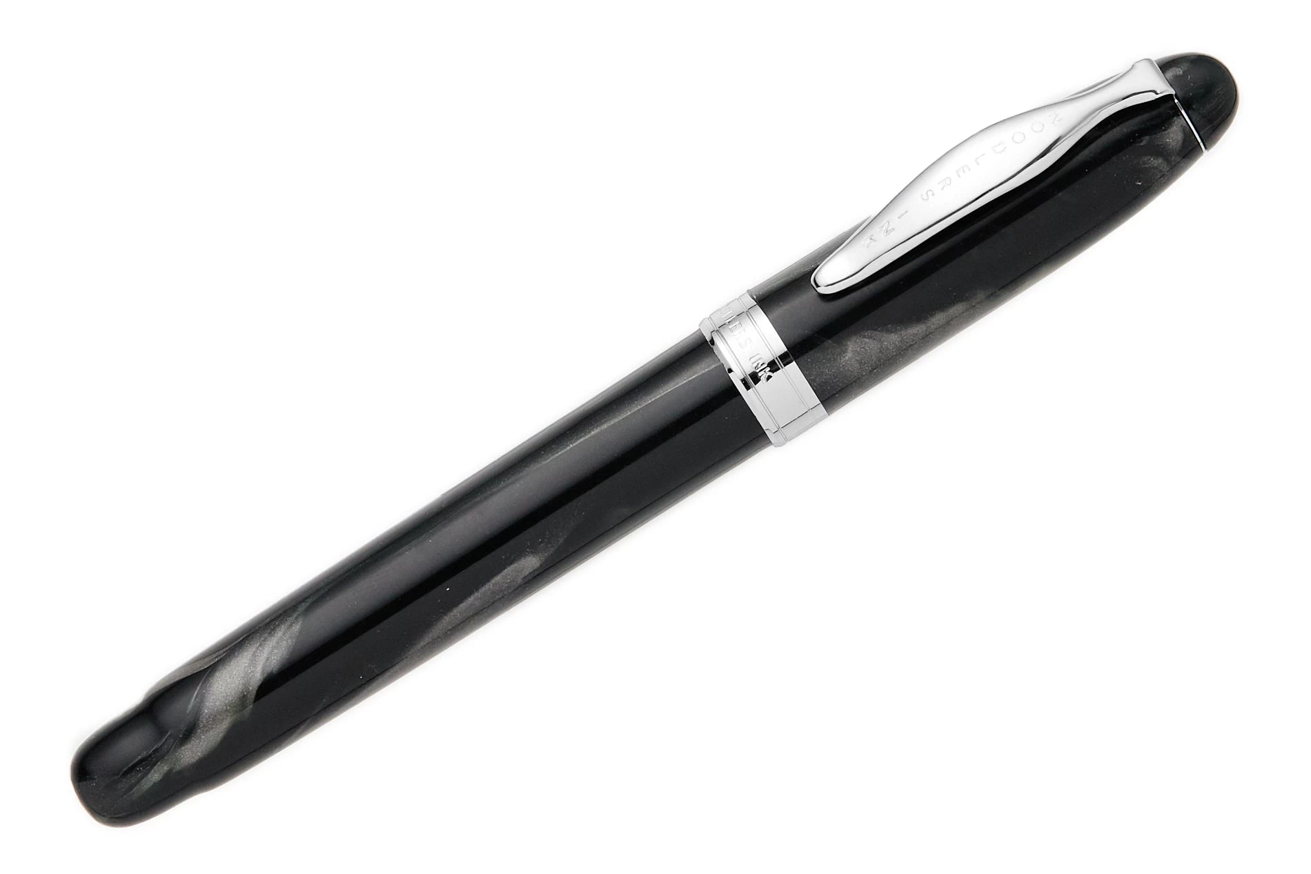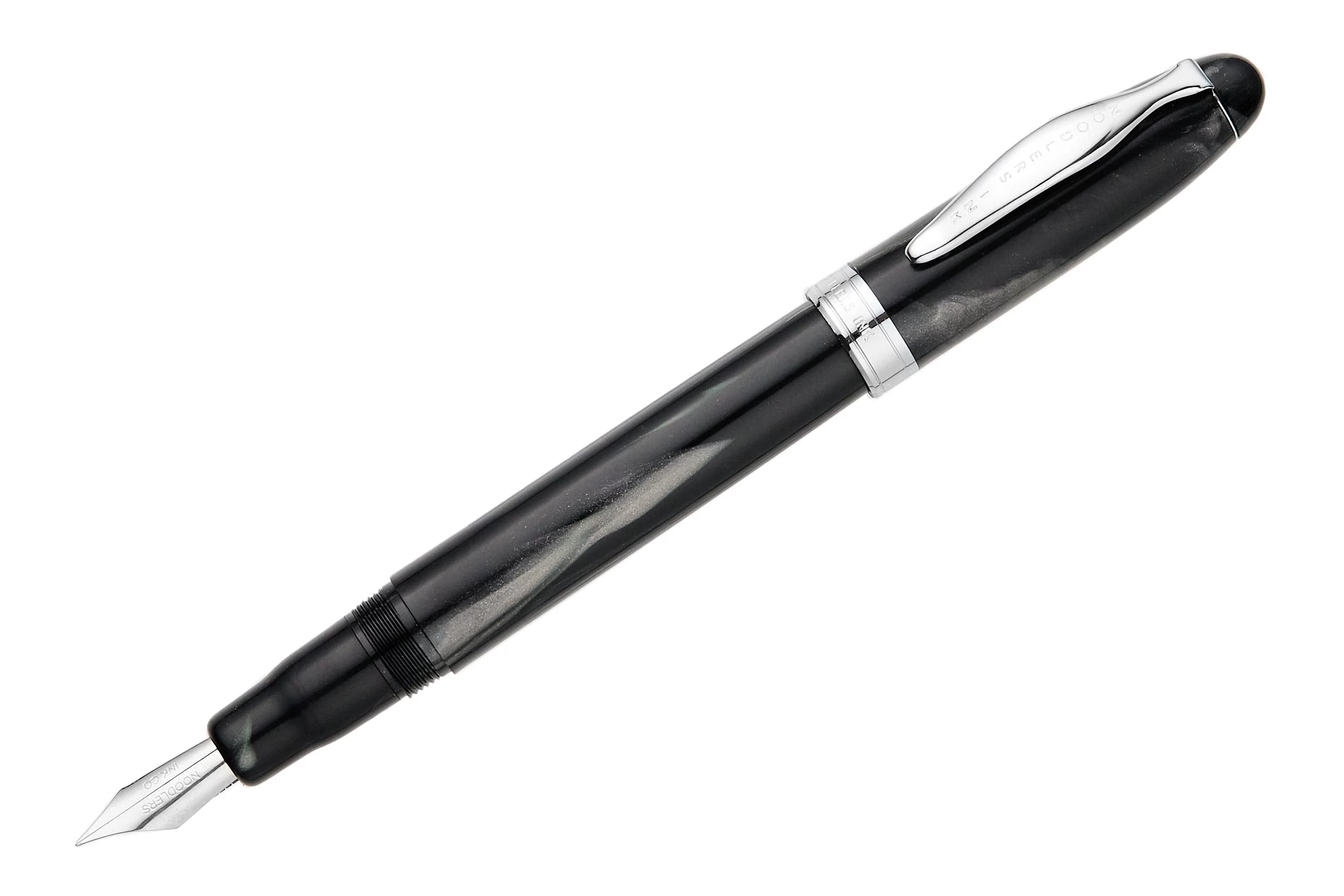 The Noodler’s Ahab flex pen features a steel flexible #6 nib and a slide piston mechanism. If you’d like, you can even remove the piston mechanism and use the pen as an eyedropper for a massive 6ml ink capacity. This pearlescent grey-black Ahab is made of a celluloid derivative and is technically biodegradable and formed from a “renewable resource”. The vegetal resin body of this pen may show particles or striations within the material. This is most noticeable in demonstrators and bright colors.