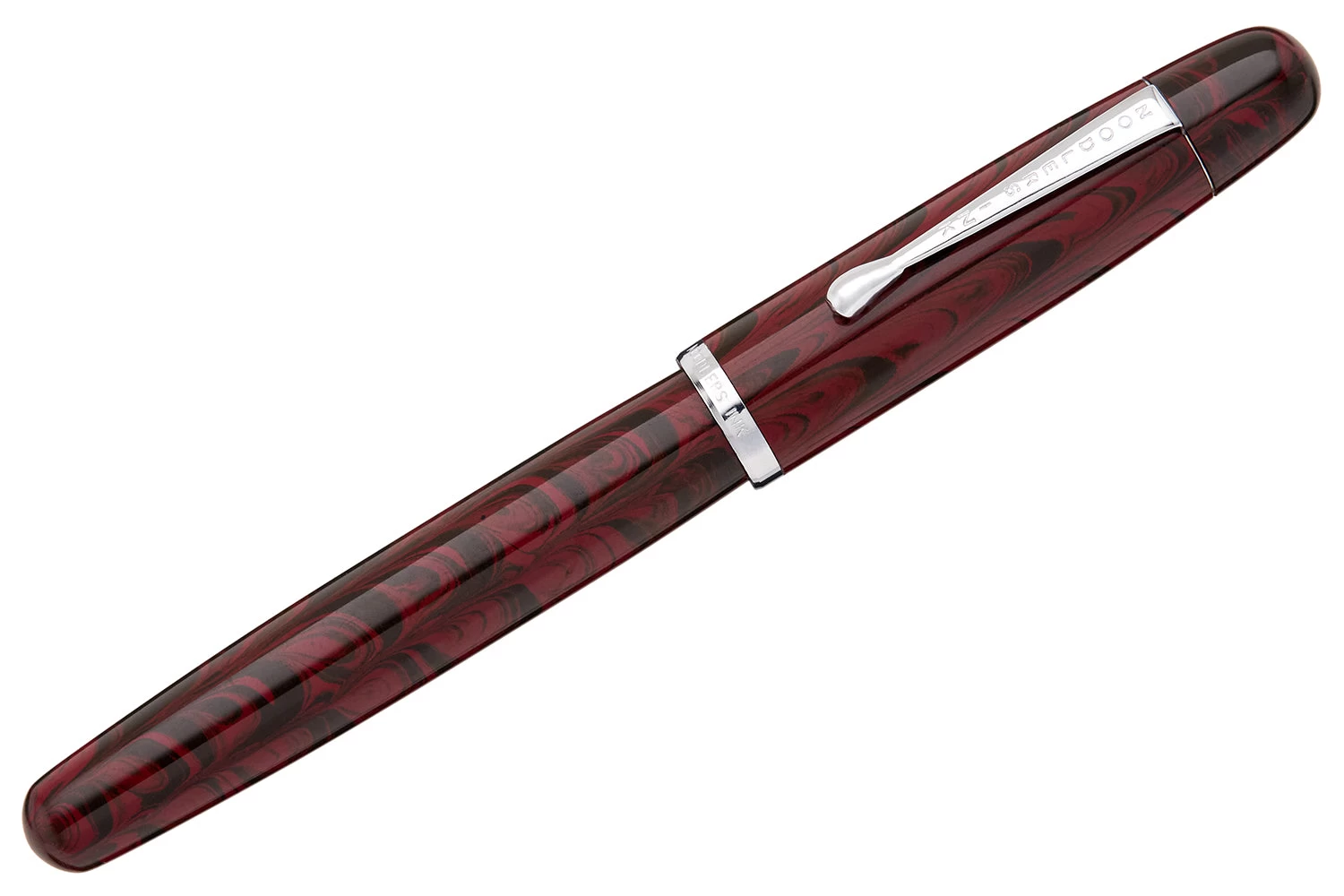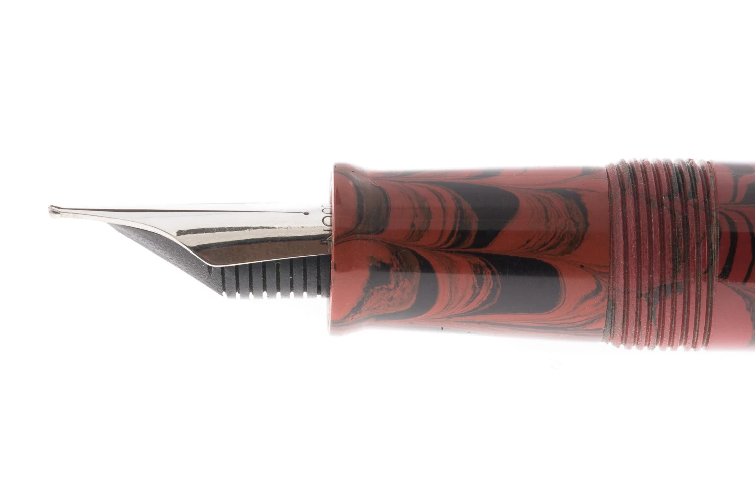 This red ebonite Noodler’s Neponset fountain pen is fitted with a flexible three-tined music nib, which has a velvet pen stroke with the ability to greatly vary the line width to the users liking. It has a built-in slide piston mechanism for use with bottled ink.