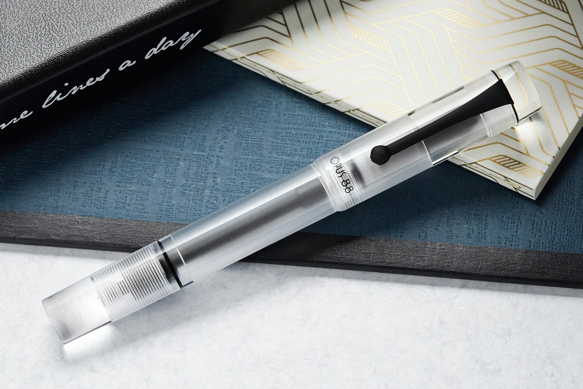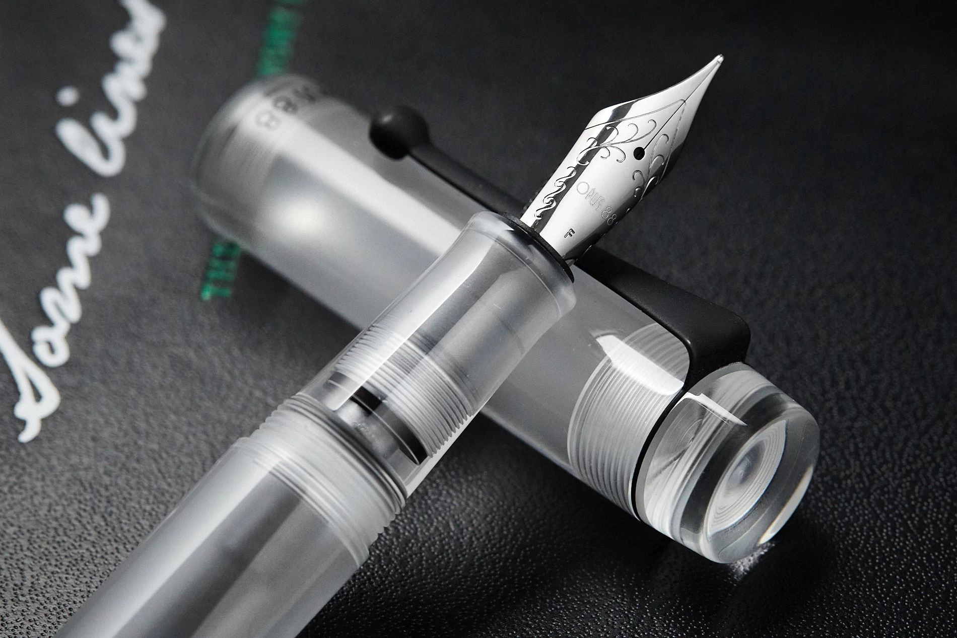 An ebonite piston and rubber gasket seals the feed off from the barrel when fully depressed, reducing the risk of leakage and burping. By unscrewing the blind cap and loosening the rod at the rear of the barrel, you open up the ink flow to the feed. During long writing sessions, leave the shut-off valve open to take advantage of the impressive ink capacity. Having a completely clear pen body allows you to see both your current ink level and your nib while capped.
