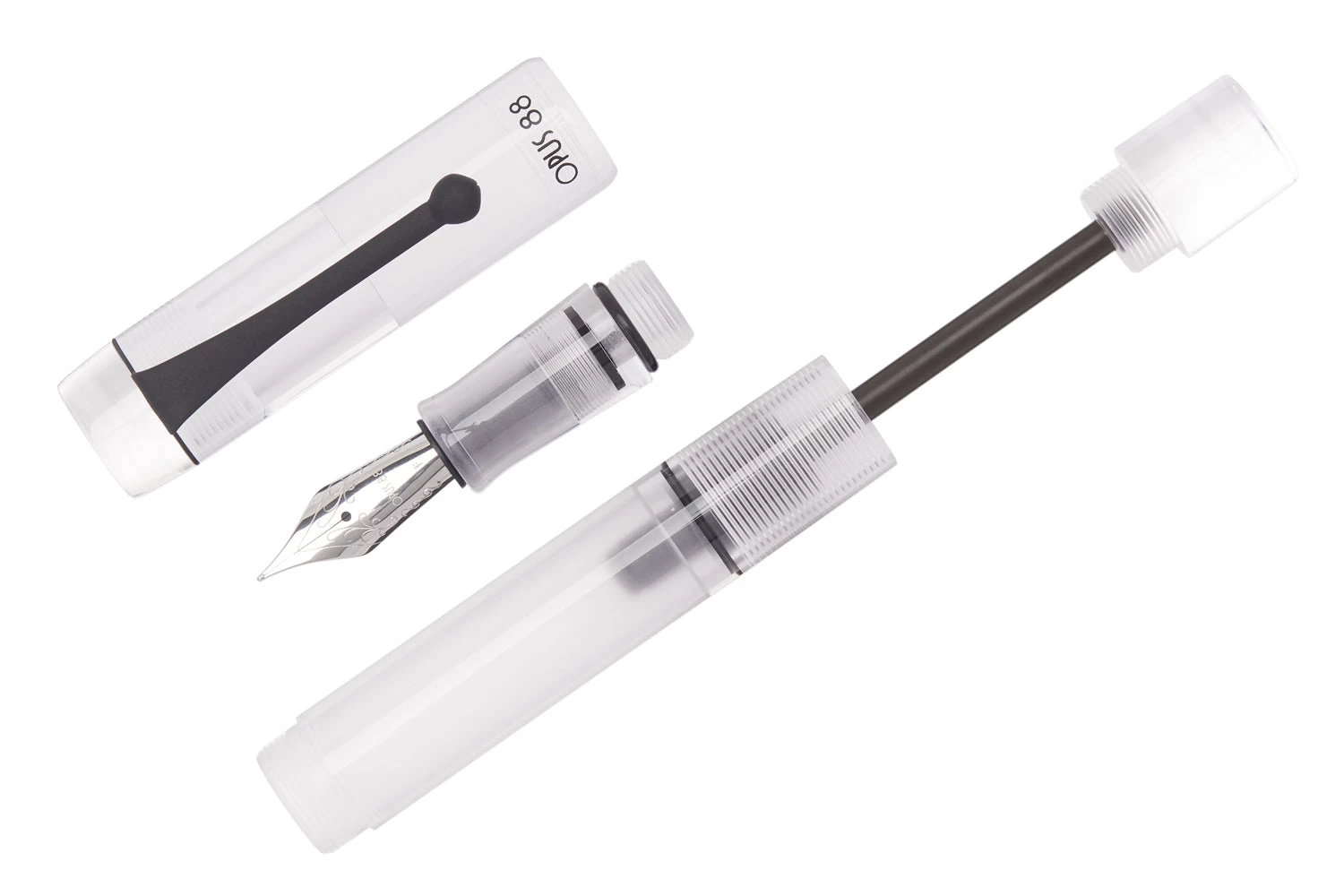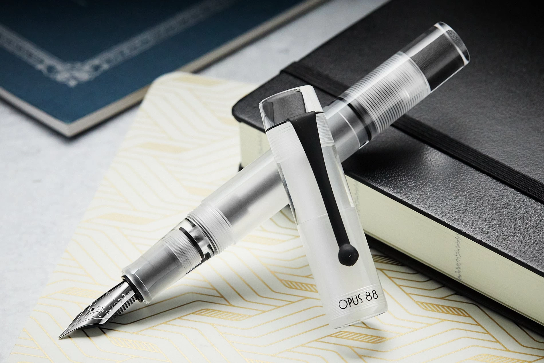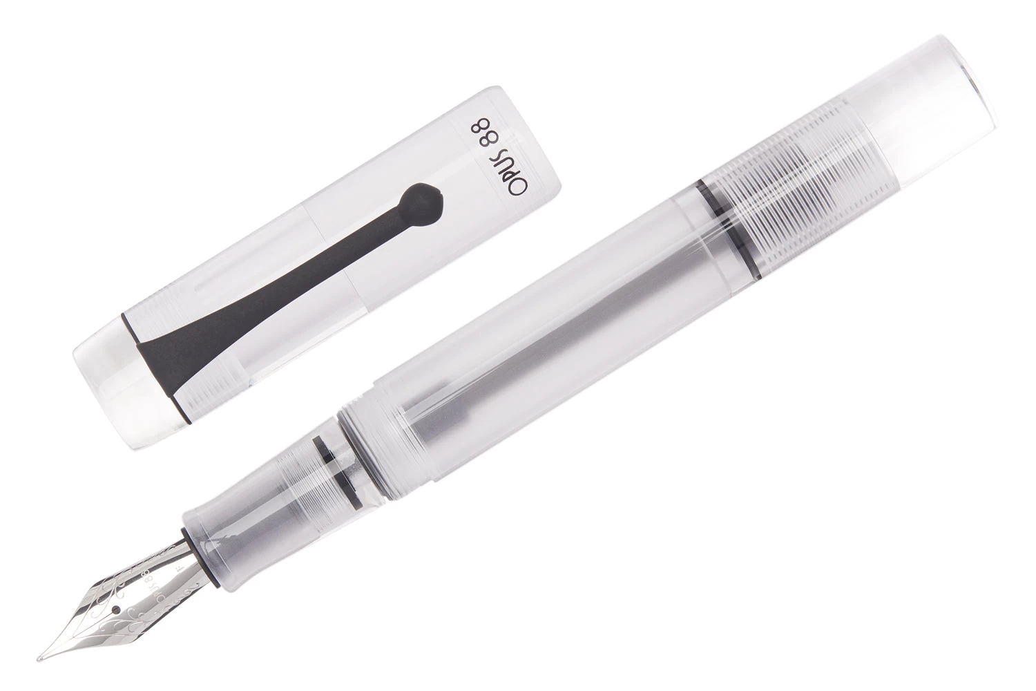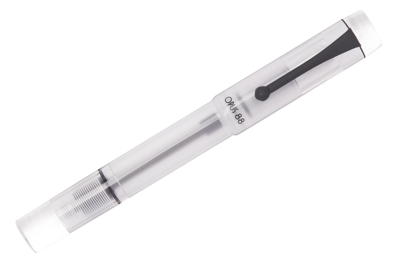 The Opus 88 Demonstrator fountain pen is a truly unique writing instrument. This large non-postable pen is an eyedropper-filled pen with a piston operated shut-off valve. Featuring a sharp alternating material scheme of frosted and clear resin, this pen’s design stands on its own. It has a sleek black clip and a silver stainless steel #6 JoWo nib and includes a glass eyedropper to fill the pen with your favorite ink.