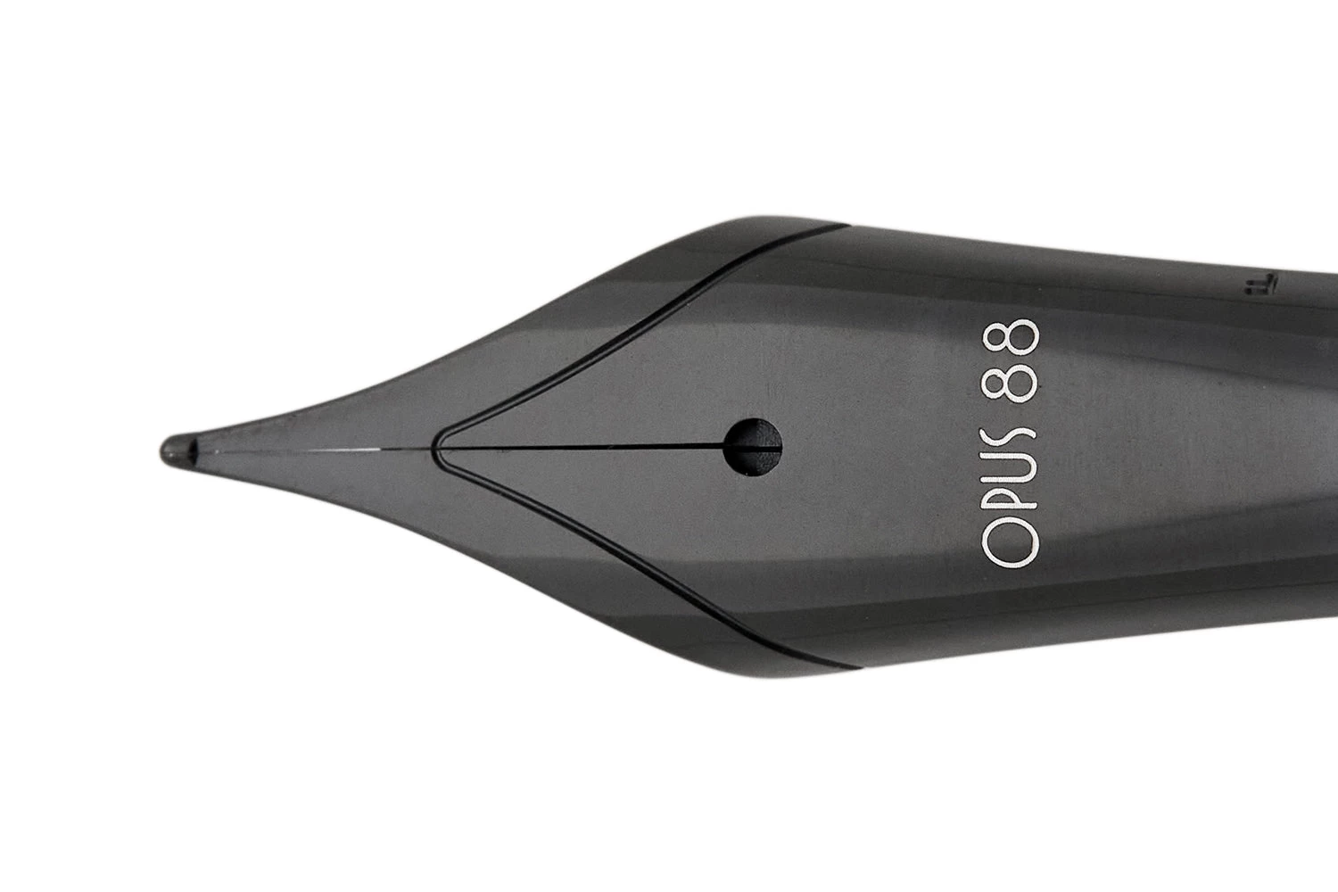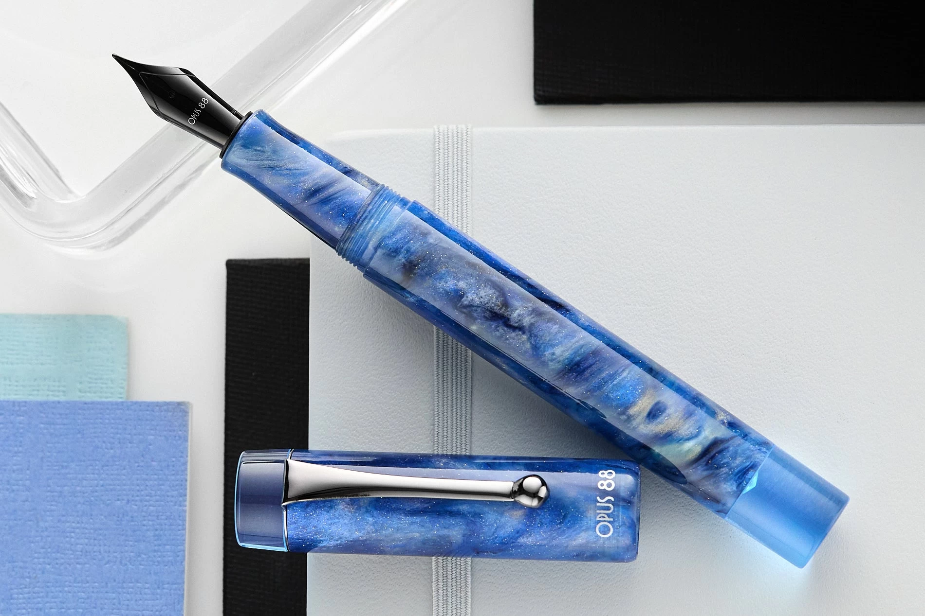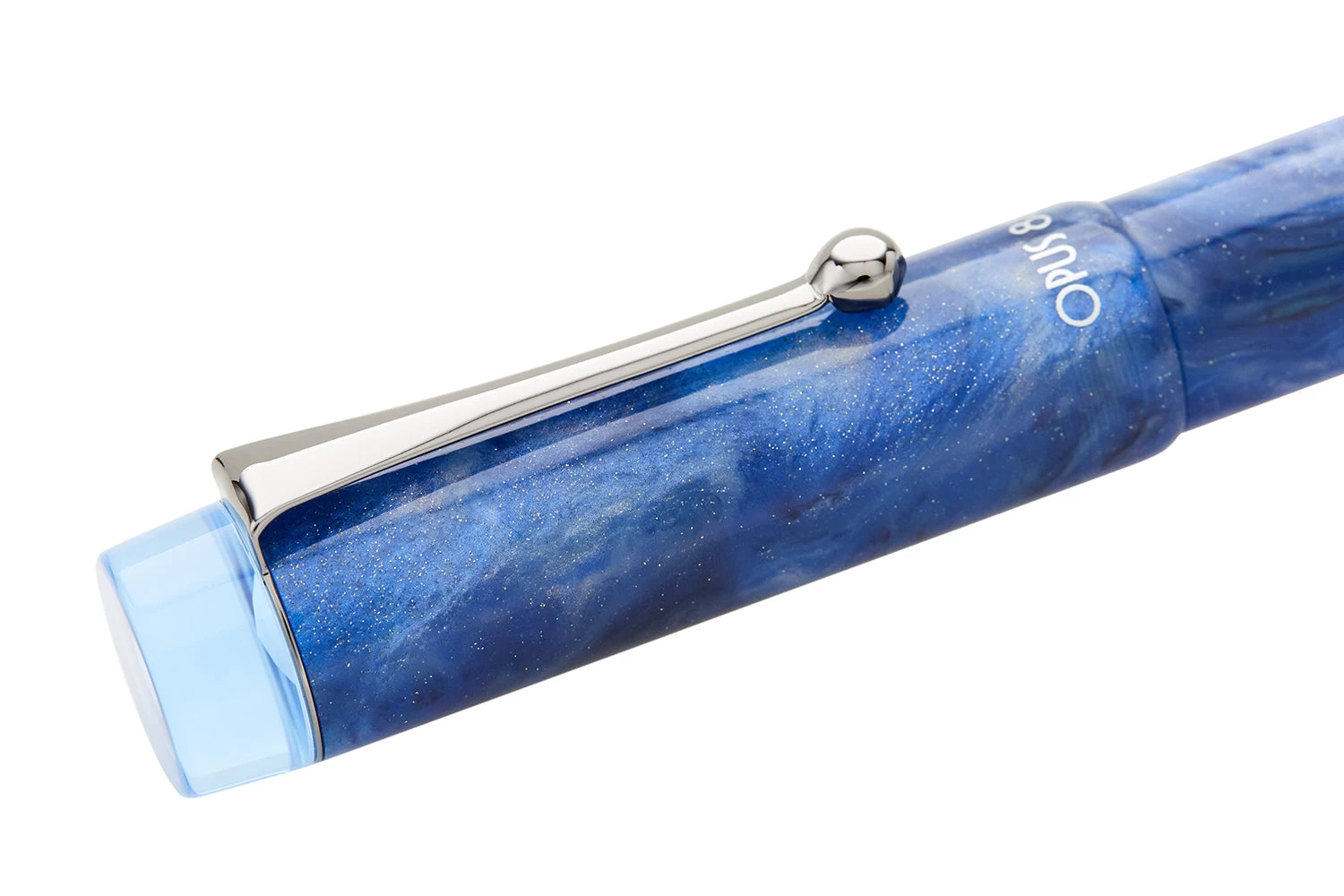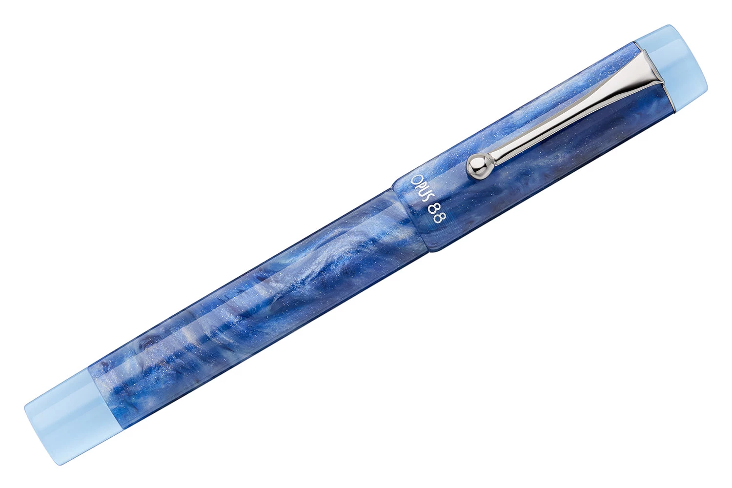 The Opus 88 Demonstrator fountain pen in Sapphire is a truly unique writing instrument. This large non-postable pen is an eyedropper-filled pen with a piston operated shut-off valve. Featuring a blue acrylic grip section and barrel, with a clear blue resin finial and end cap, this pen’s design stands on its own. It has a sleek gunmetal clip and a black stainless steel #6 JoWo nib and includes a glass eyedropper to fill the pen with your favorite ink.