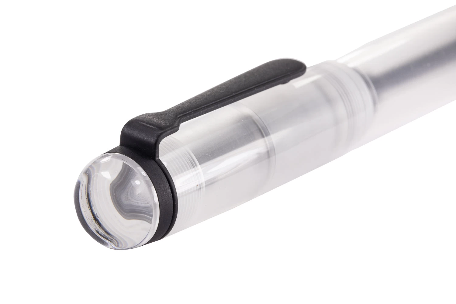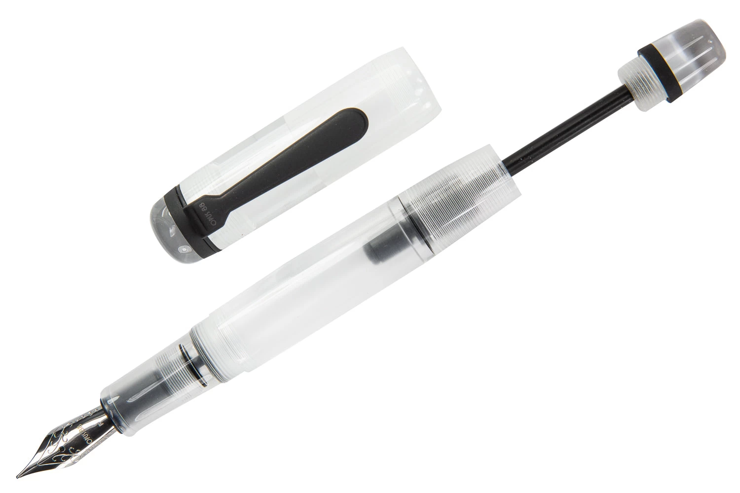 This pen is made entirely of clear resin, allowing you to see your ink level. It has a black clip, and a silver stainless steel #6 JoWo nib. It also comes with a glass eyedropper to fill the pen with your favorite ink.