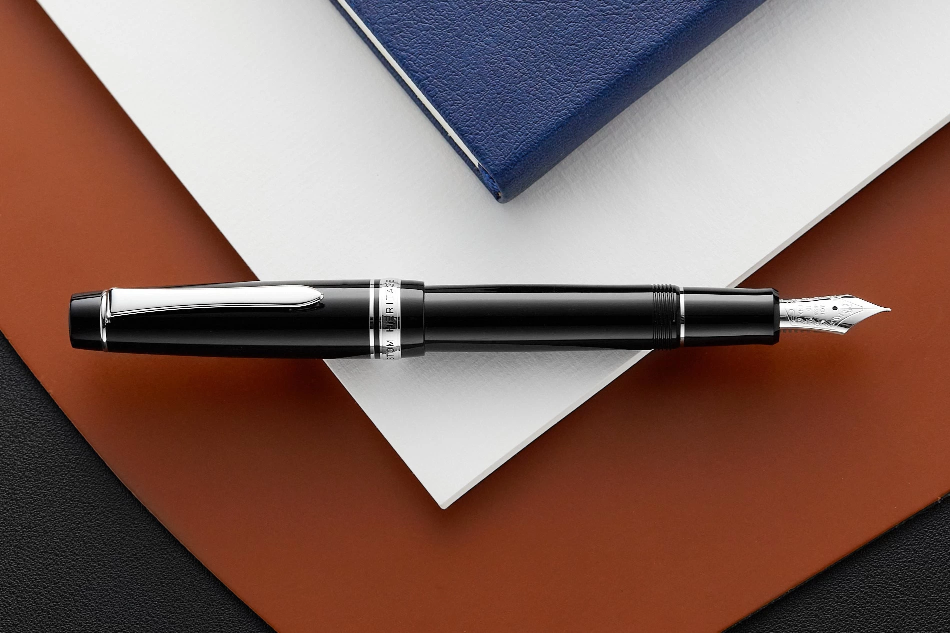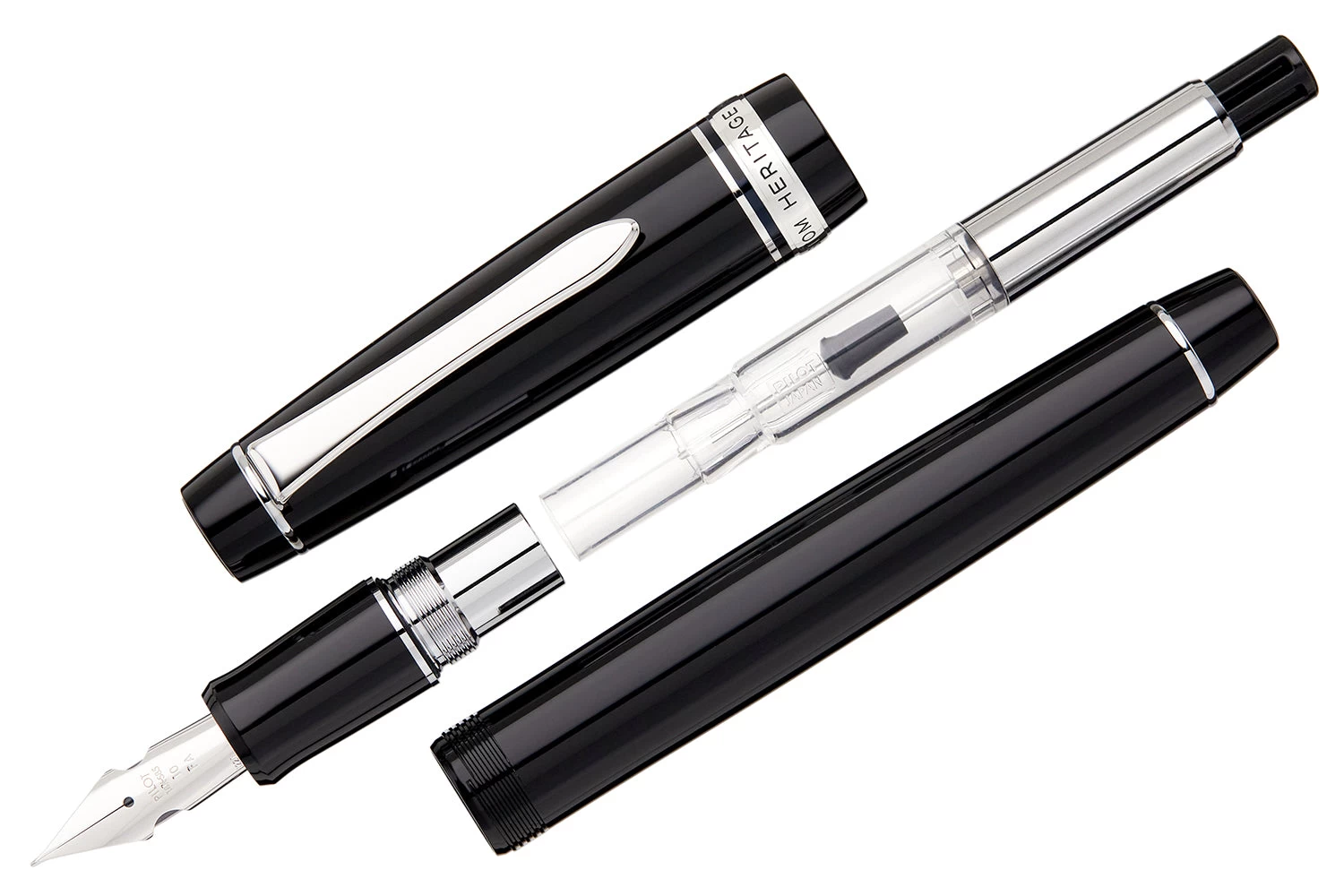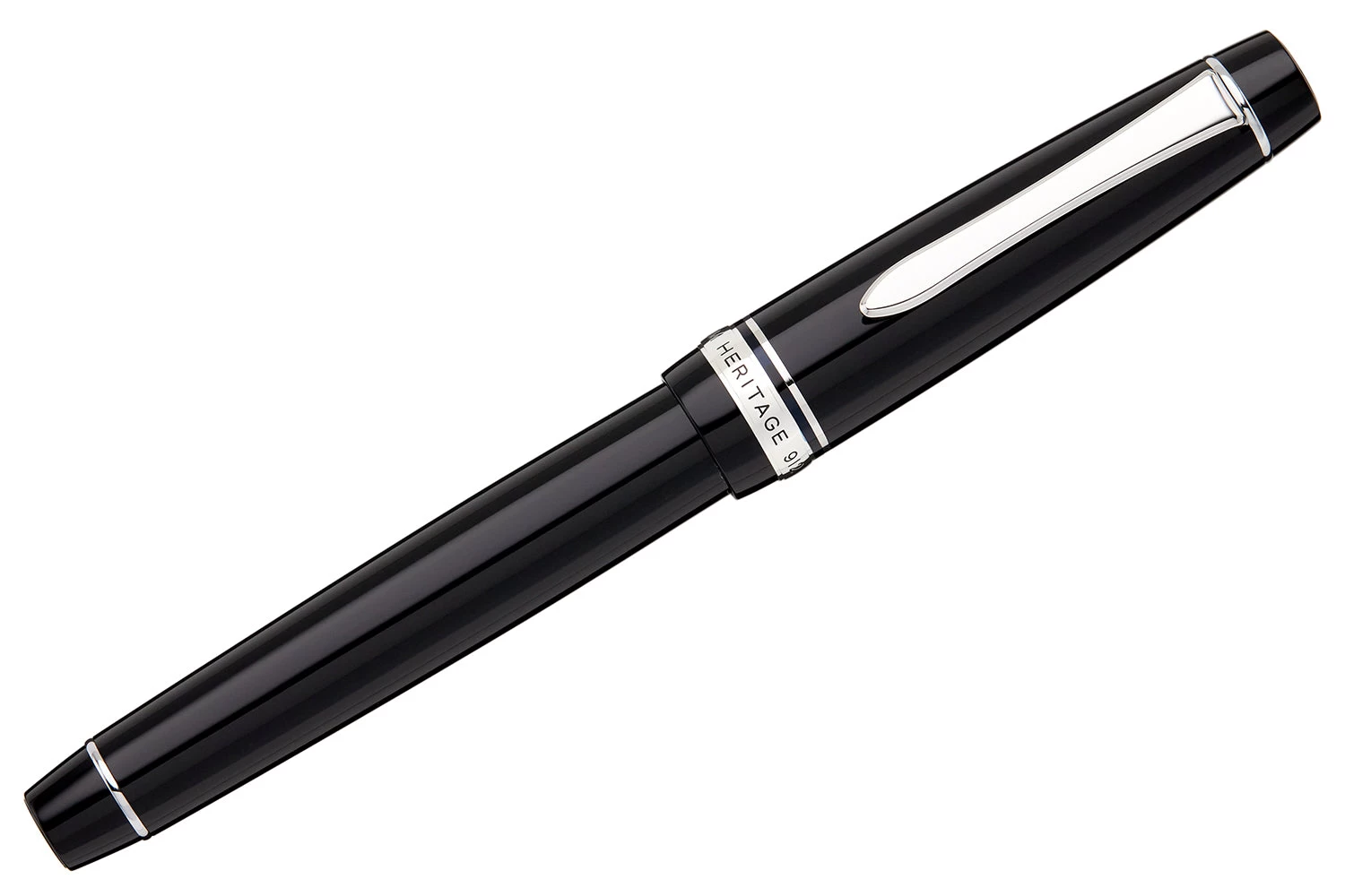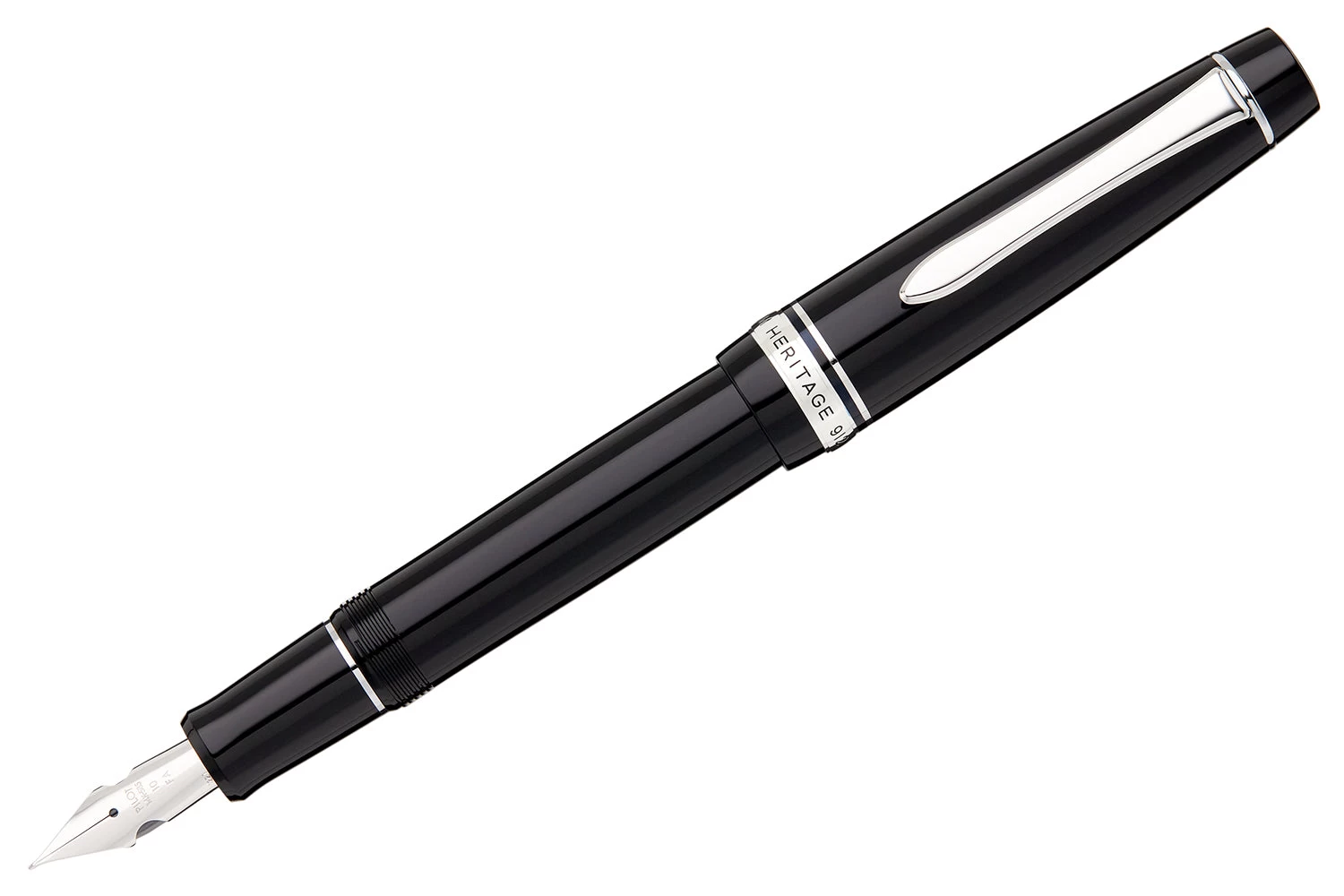 The Pilot Custom Heritage 912 fountain pen collection offers elegant classic styling and a superior, customized writing experience. This black fountain pen features a rhodium-plated 14k gold nib for a smooth writing experience and complementary silver trim.