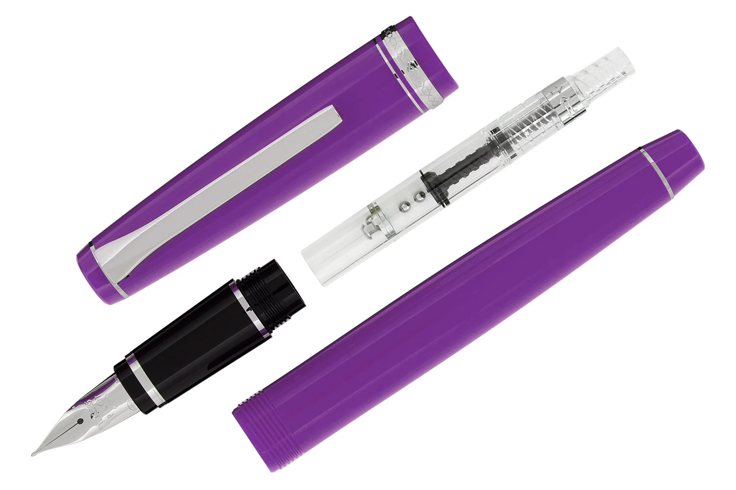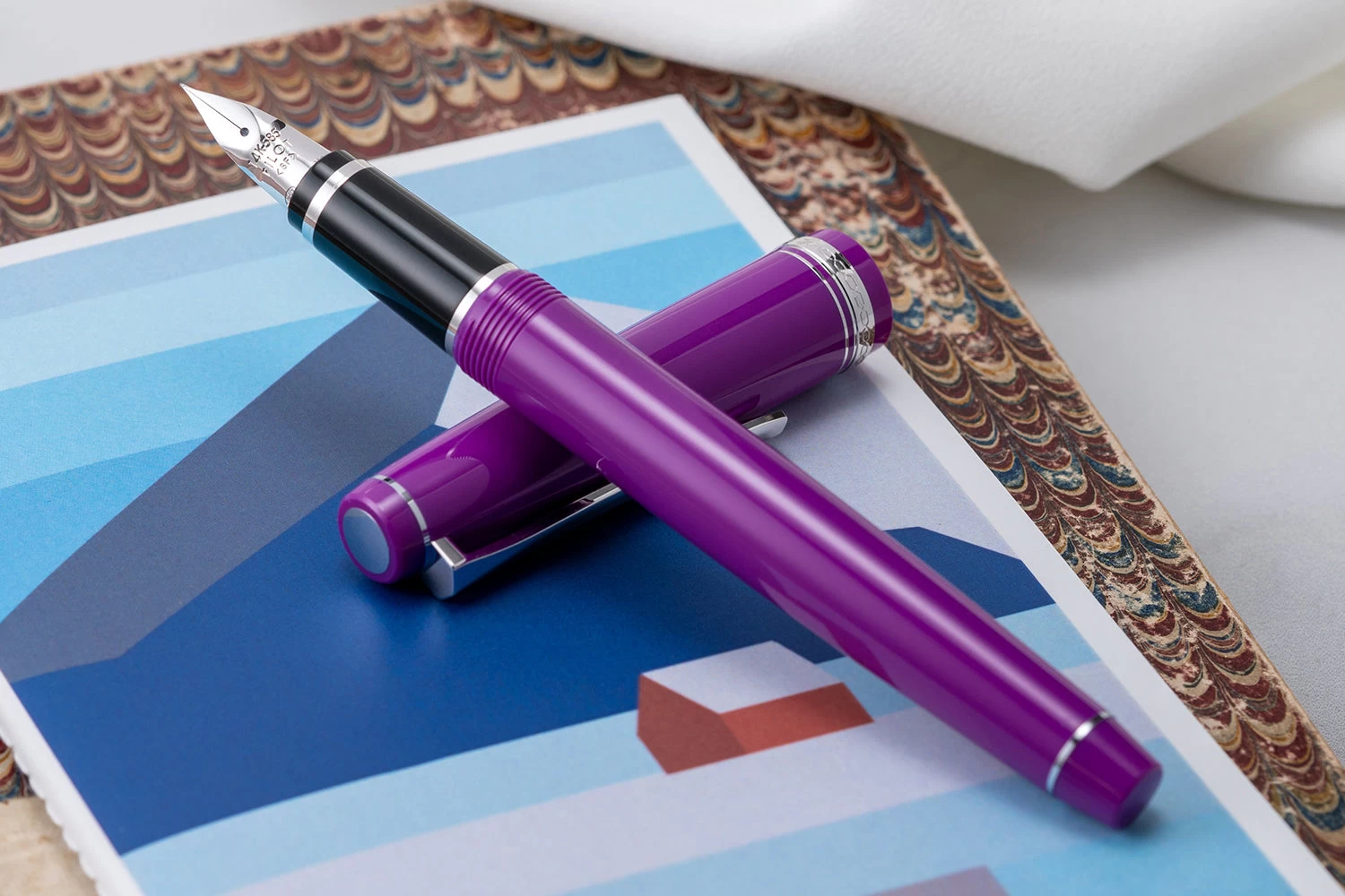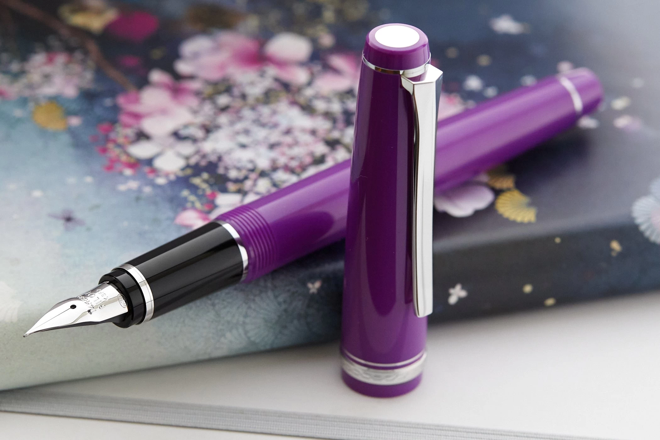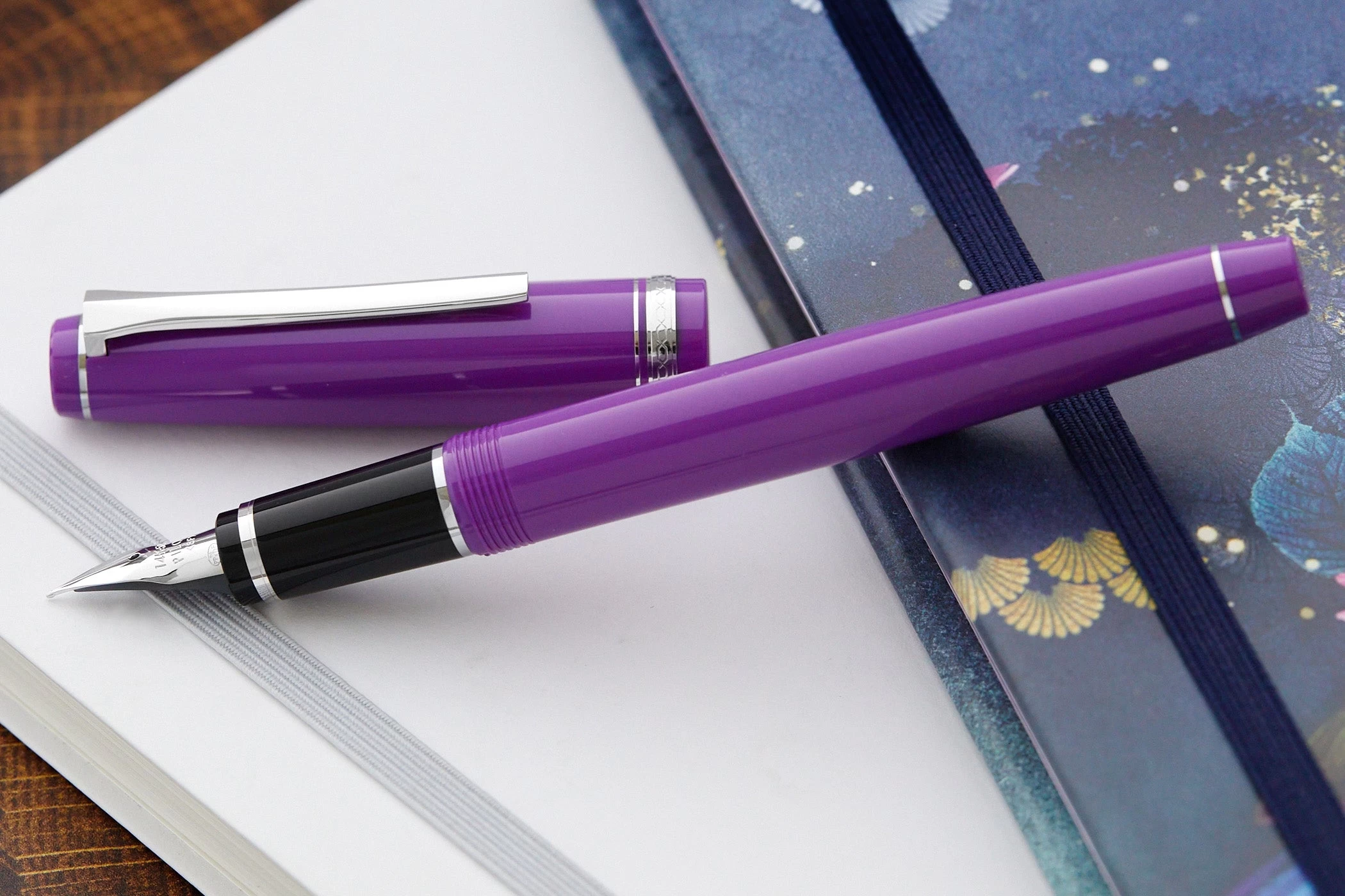 The Pilot Falcon (previously known as the Namiki Falcon) is an iconic pen in the fountain pen world. It is most famous for its rhodium-plated 14k gold soft nib, which provides line variation when you change your writing pressure. This solid purple fountain pen has rhodium trim and includes a Con-40 converter and a Pilot/Namiki ink cartridge, packaged in a Pilot gift box. This color is a US exclusive!