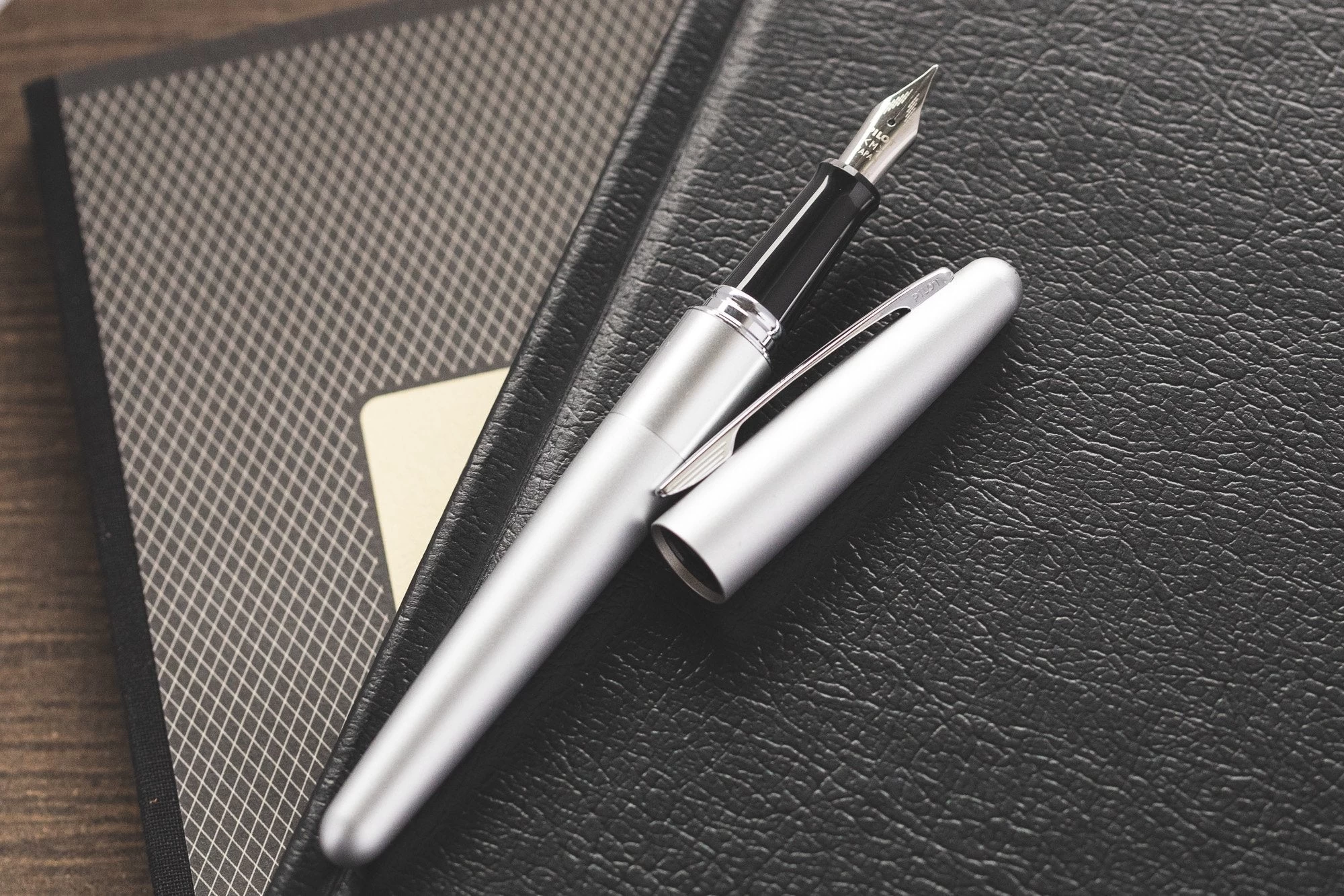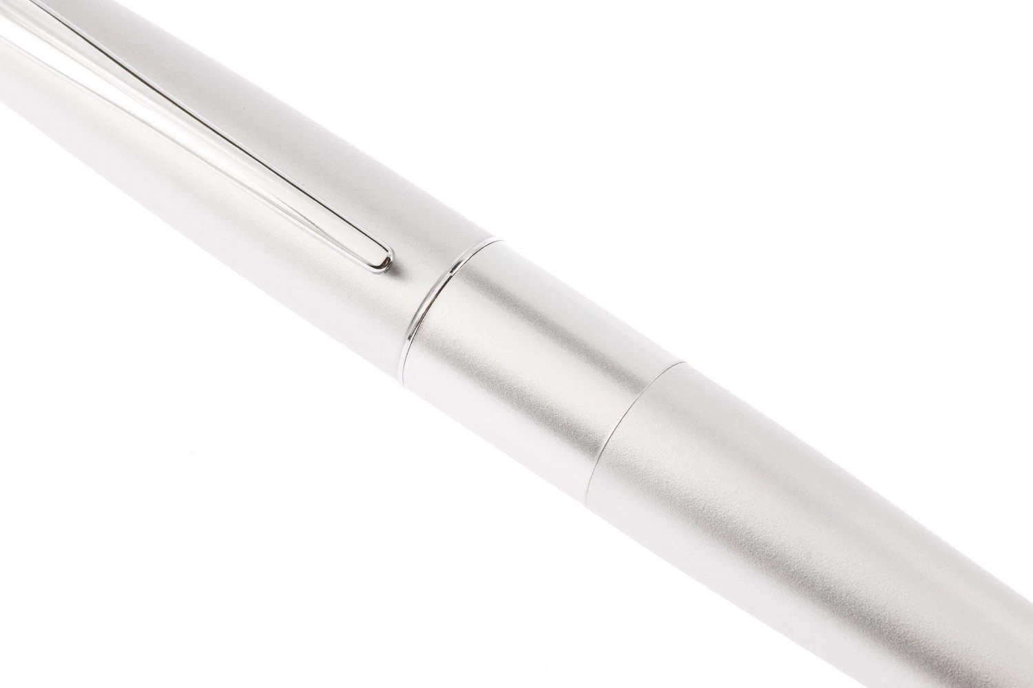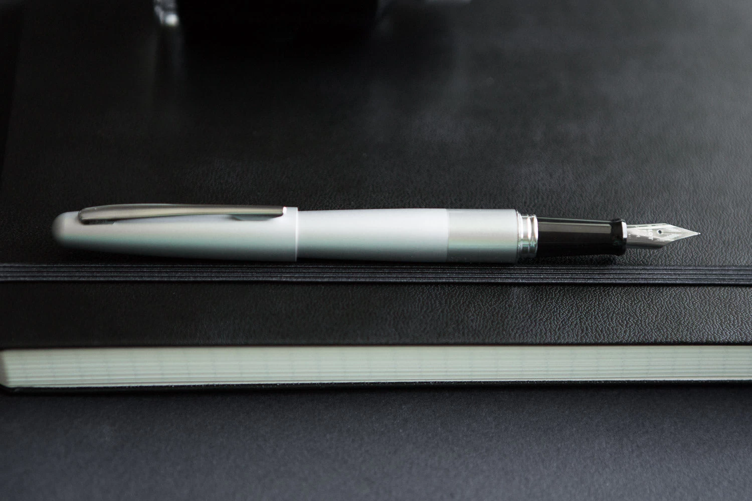 A fantastic value from Pilot, the Metropolitan is a favorite first fountain pen. This silver-colored metal bodied pen has a glossy silver accent band, silver trim, and a steel nib. It comes with a black Pilot ink cartridge and a squeeze converter to use with bottled ink, or you can upgrade to a Con-40 converter if you prefer that style.