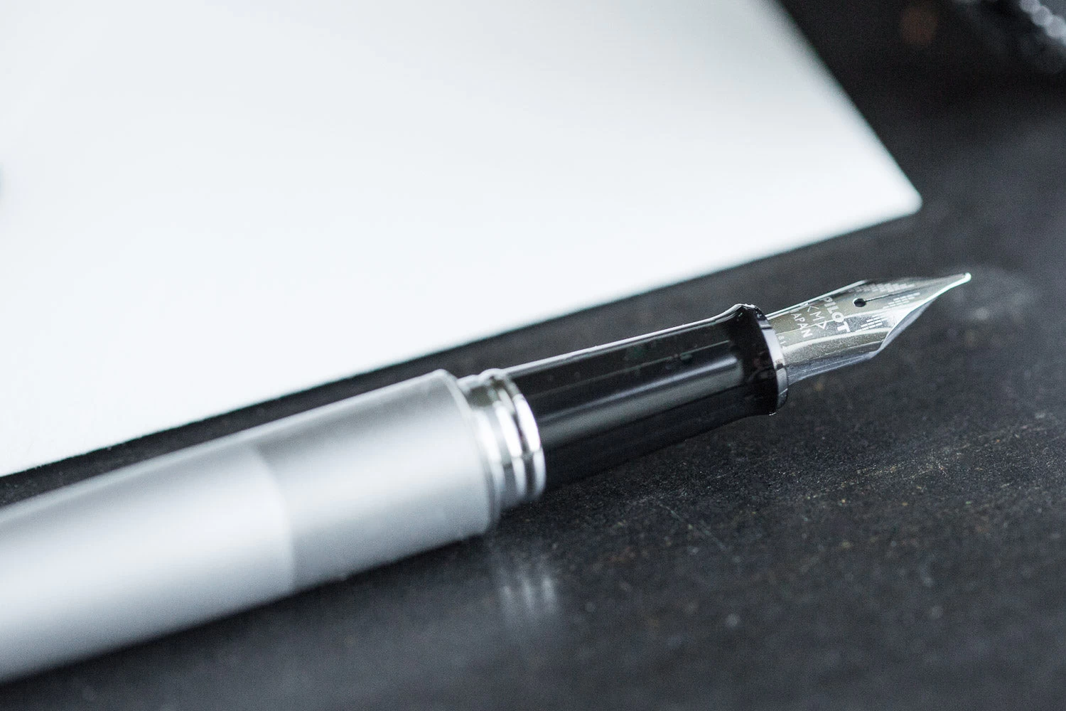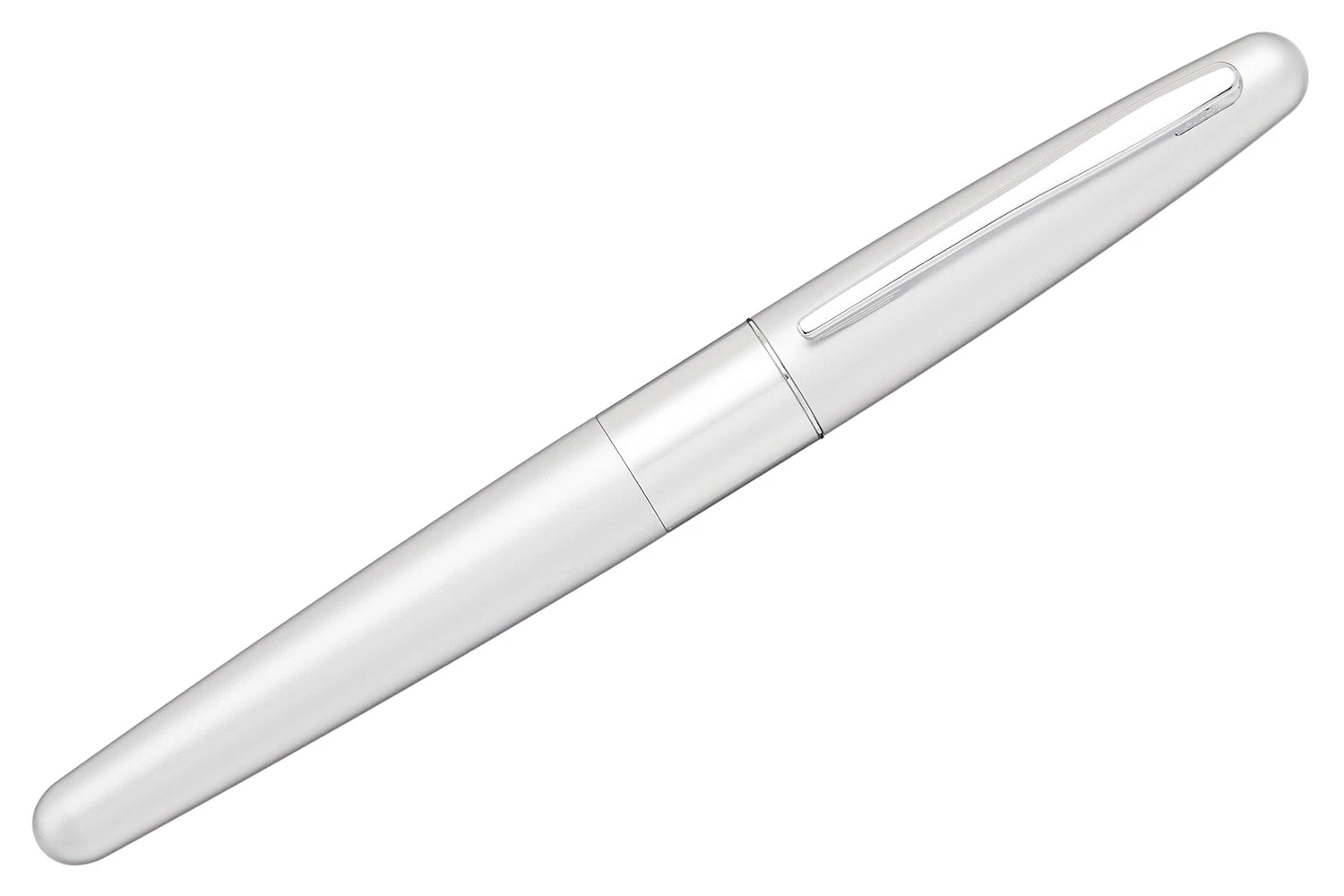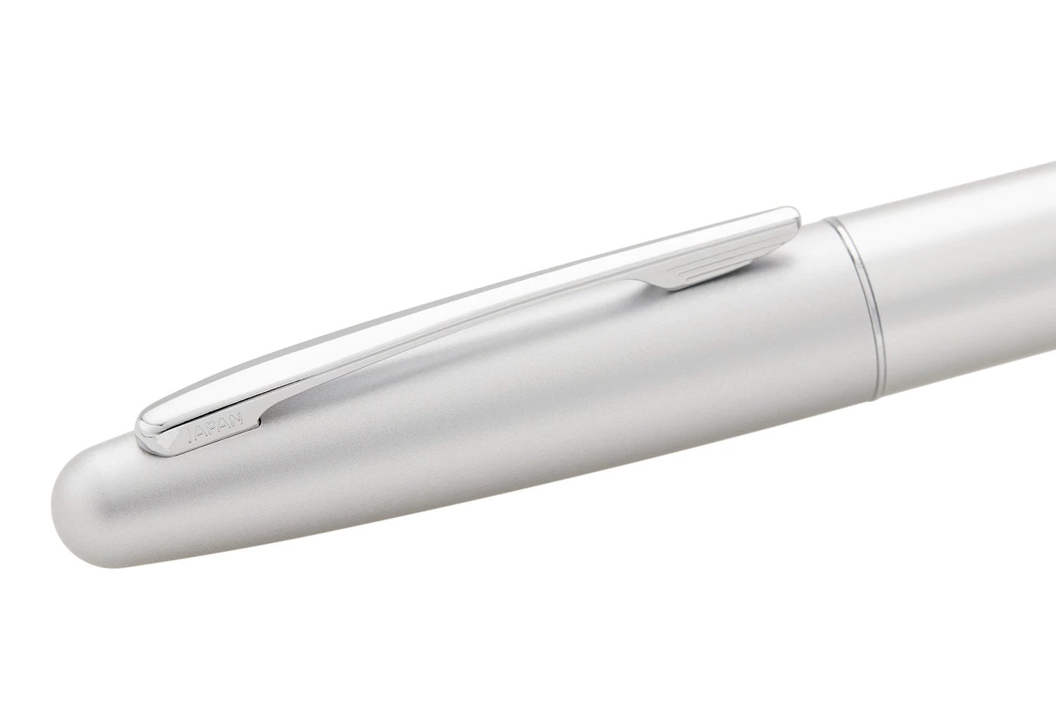 A fantastic value from Pilot, the Metropolitan is a favorite first fountain pen. This silver-colored metal bodied pen has a glossy silver accent band, silver trim, and a steel nib. It comes with a black Pilot ink cartridge and a squeeze converter to use with bottled ink, or you can upgrade to a Con-40 converter if you prefer that style.