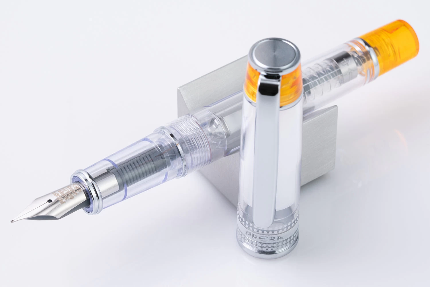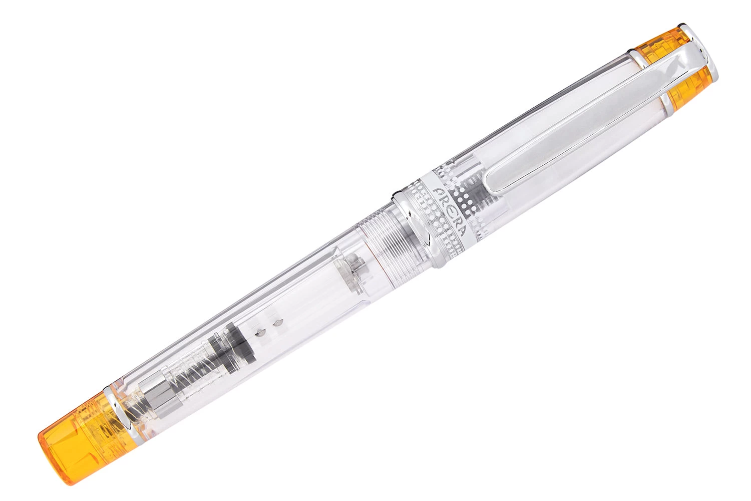 The petite Pilot Prera has a clean and simple look. This fountain pen has a crystal-like acrylic body with translucent orange colored accents. You can fill the pen with the ink of your choice by using the included converter, and the transparent body allows you to see the ink level remaining in the converter or an ink cartridge. The pen feels very well made, is ergonomically lightweight, and the steel nib is delightfully thin enough that you can use it for everyday writing. Each pen comes with a CON-40 converter and an ink cartridge to get you started writing right away.
