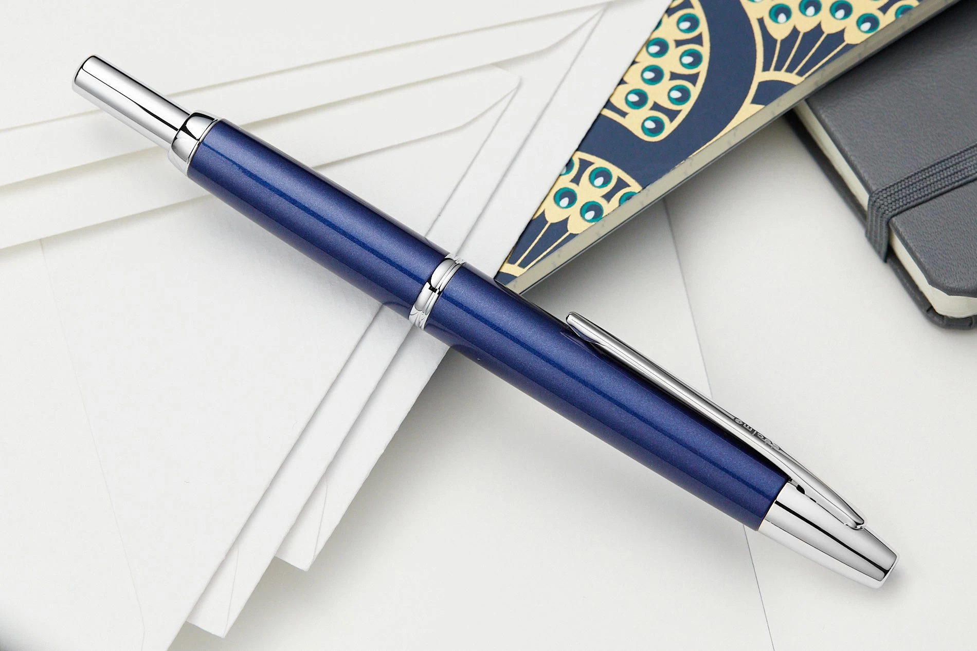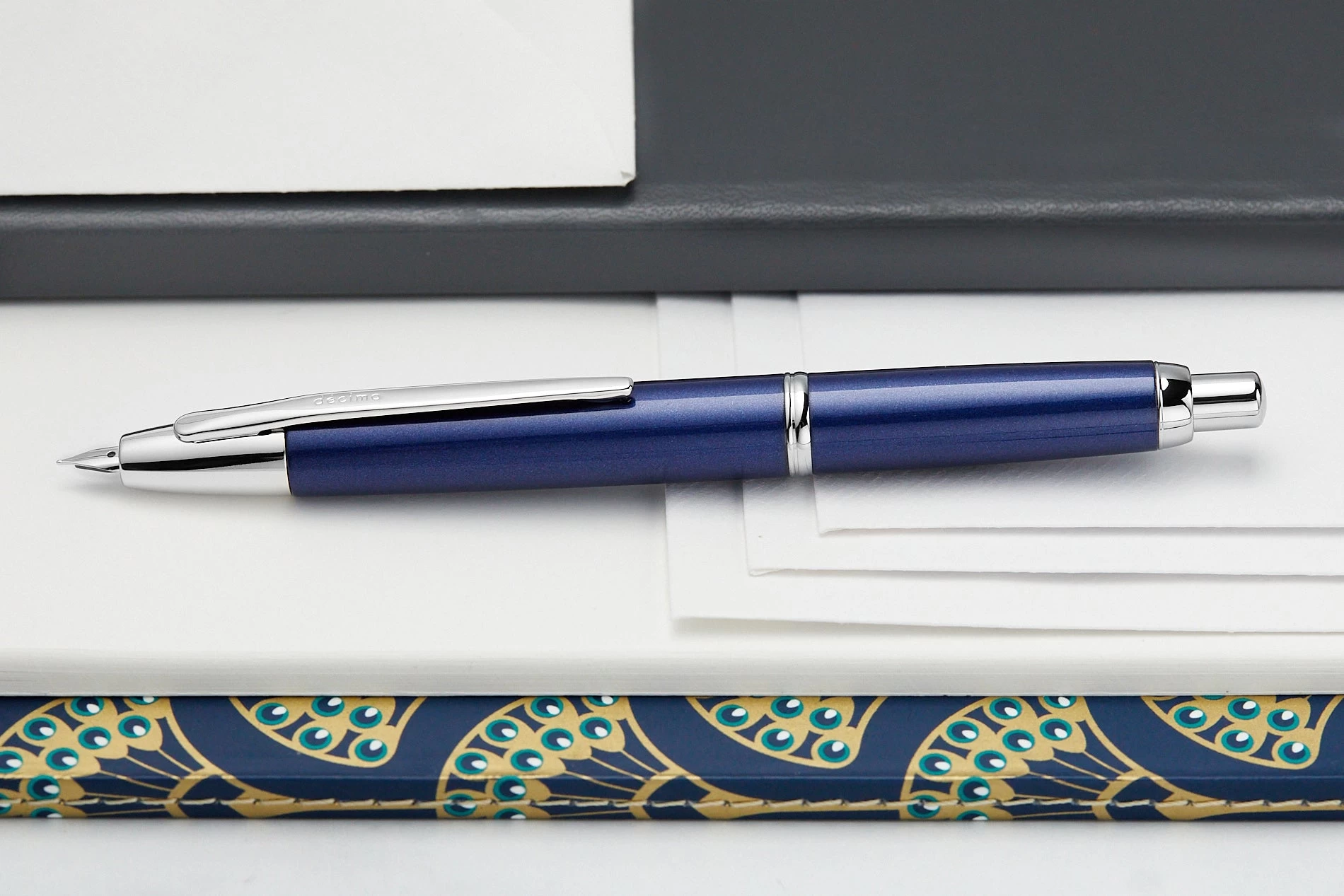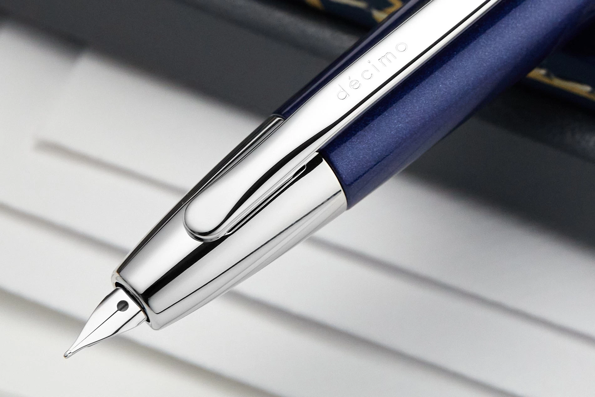 The Vanishing Point Decimo brings a new level of contemporary artistry to the Vanishing Point family. Redesigned and refined with a slimmer and lighter weight barrel, this fountain pen features a navy blue glossy lacquer finish with silver trim.