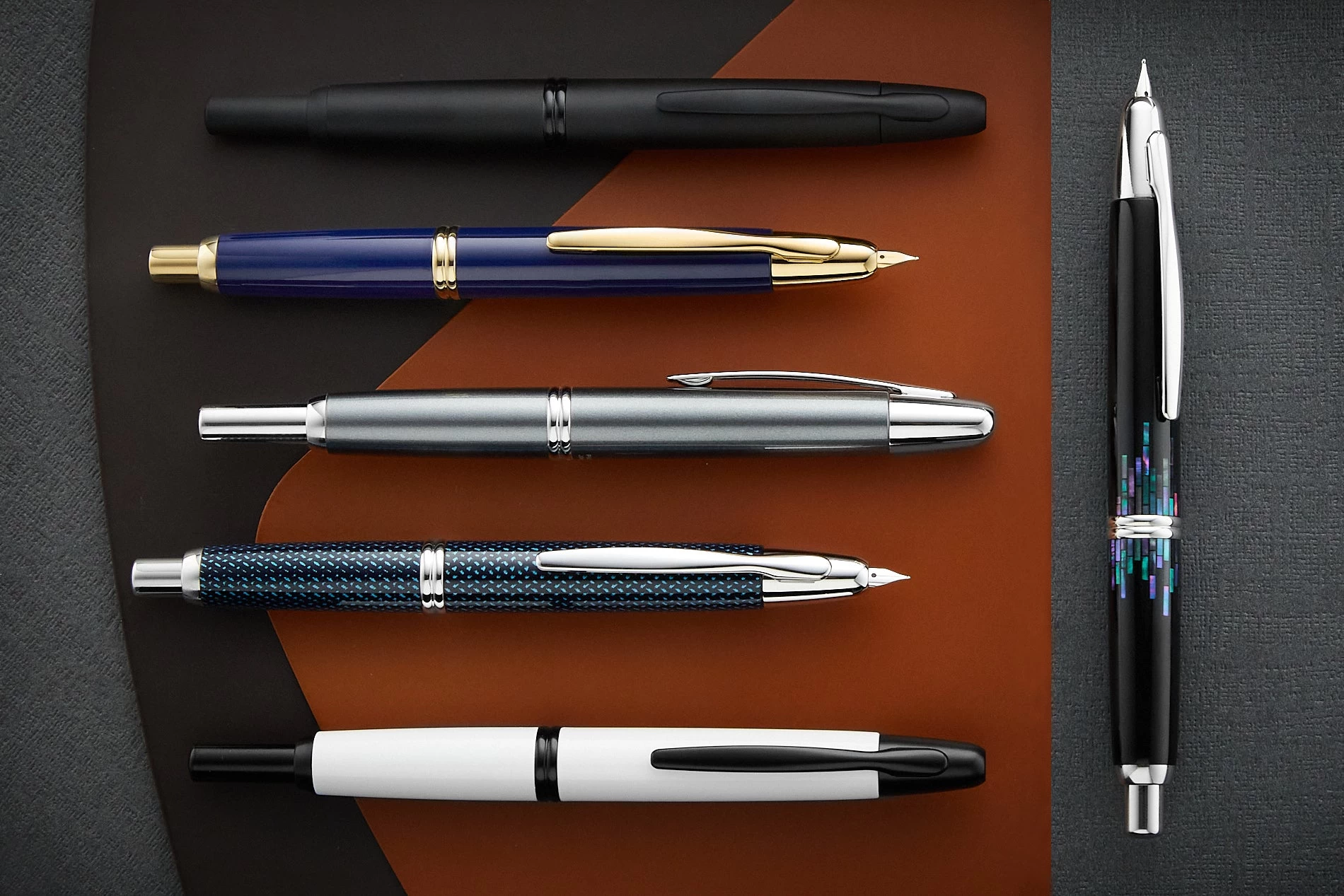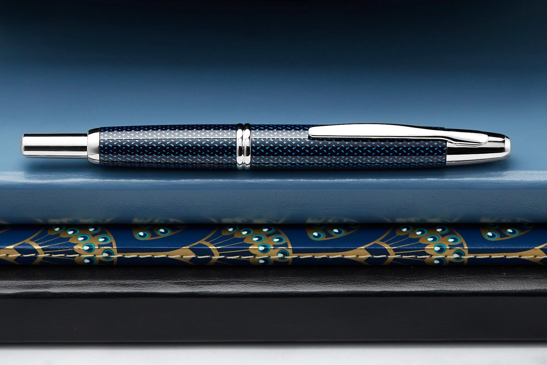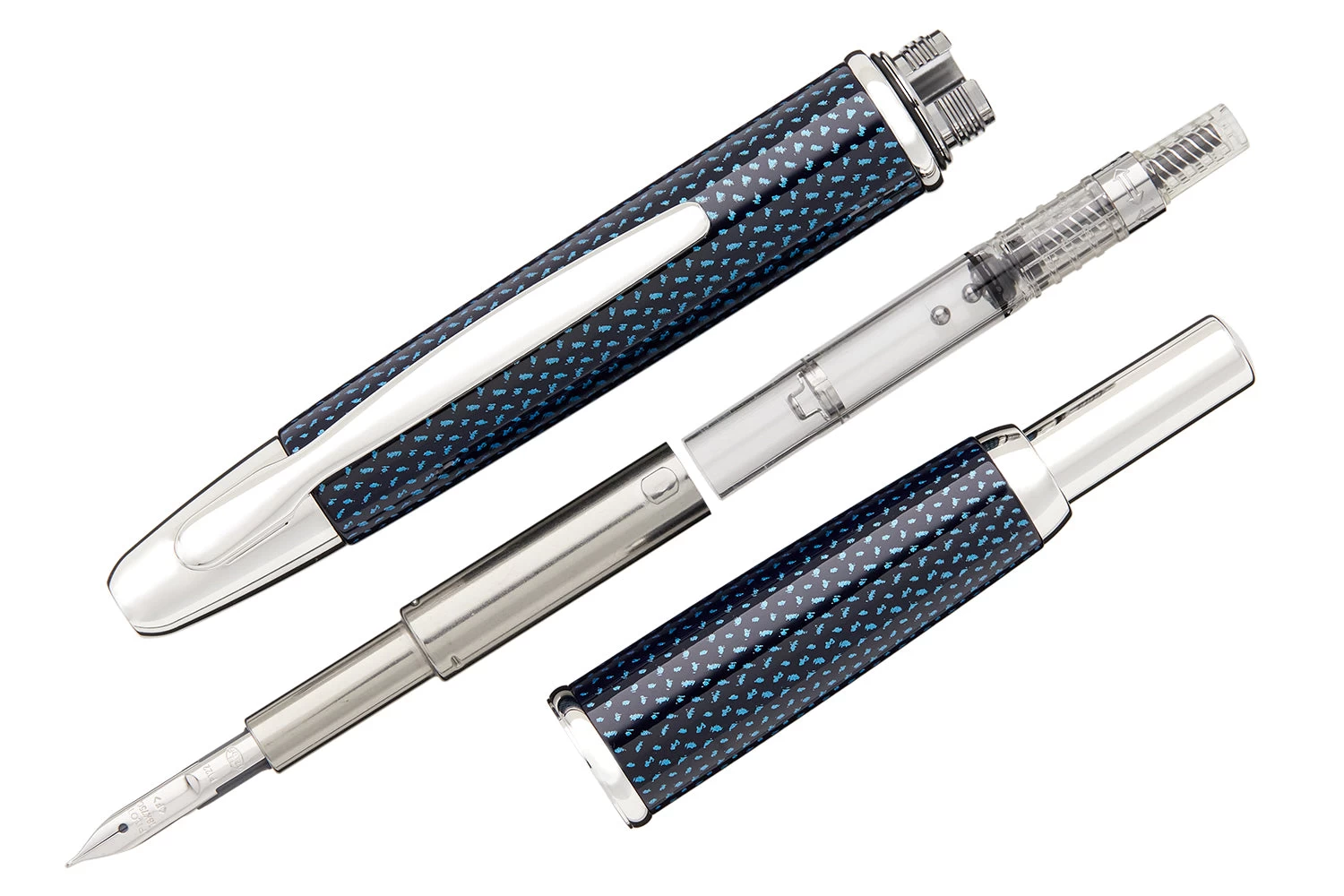 This iconic Pilot Vanishing Point fountain pen has a dark blue carbonesque barrel with rhodium accents. This fountain pen comes with a retractable rhodium-plated 18k gold nib – just click to expose or retract the nib. A hidden trap door helps keep the nib from drying out when not in use. A Pilot CON-40 converter is included with this pen, as well as a Pilot ink cartridge. A metal cartridge cap is also included for use with the ink cartridge. Each Vanishing Point fountain pen is beautifully merchandised in a black gift box.