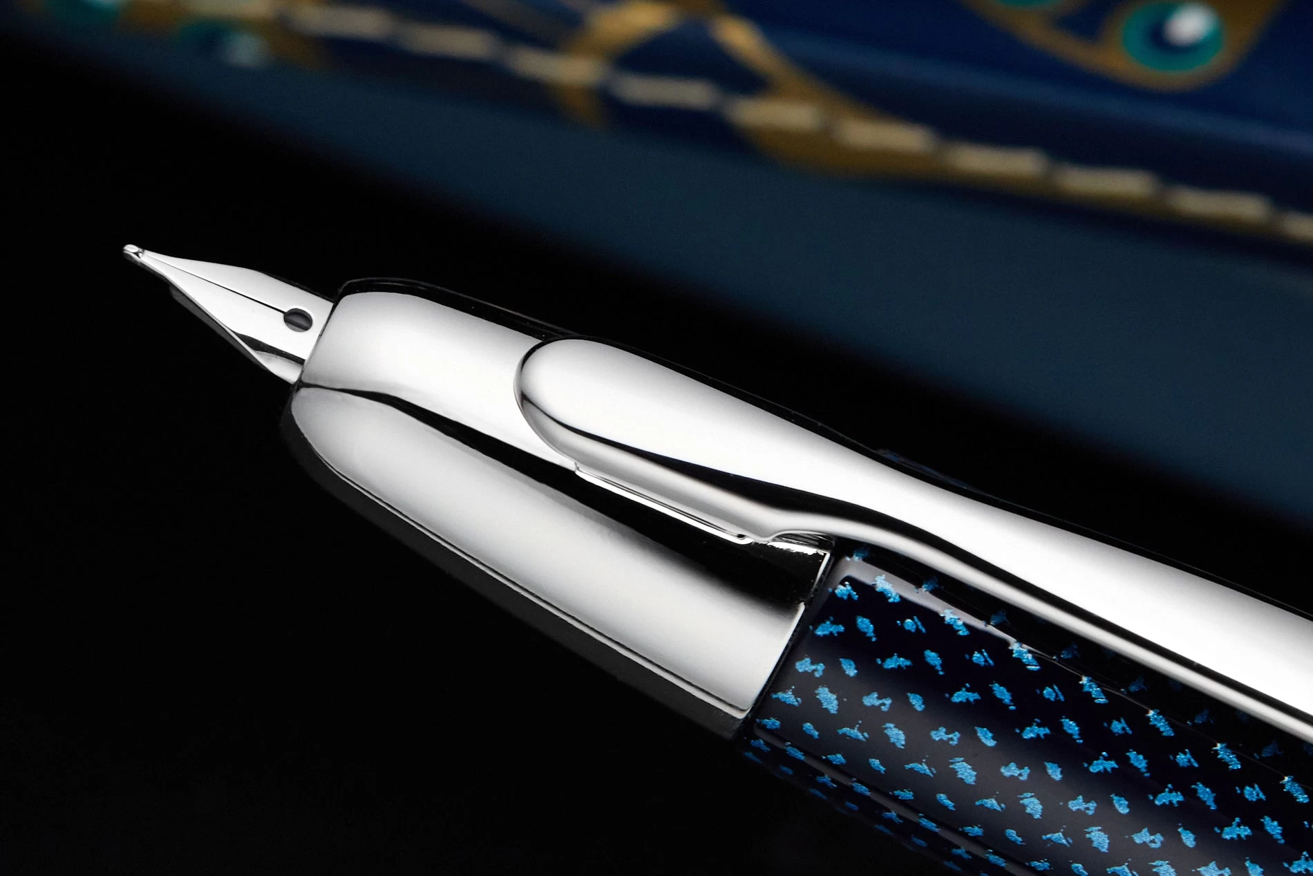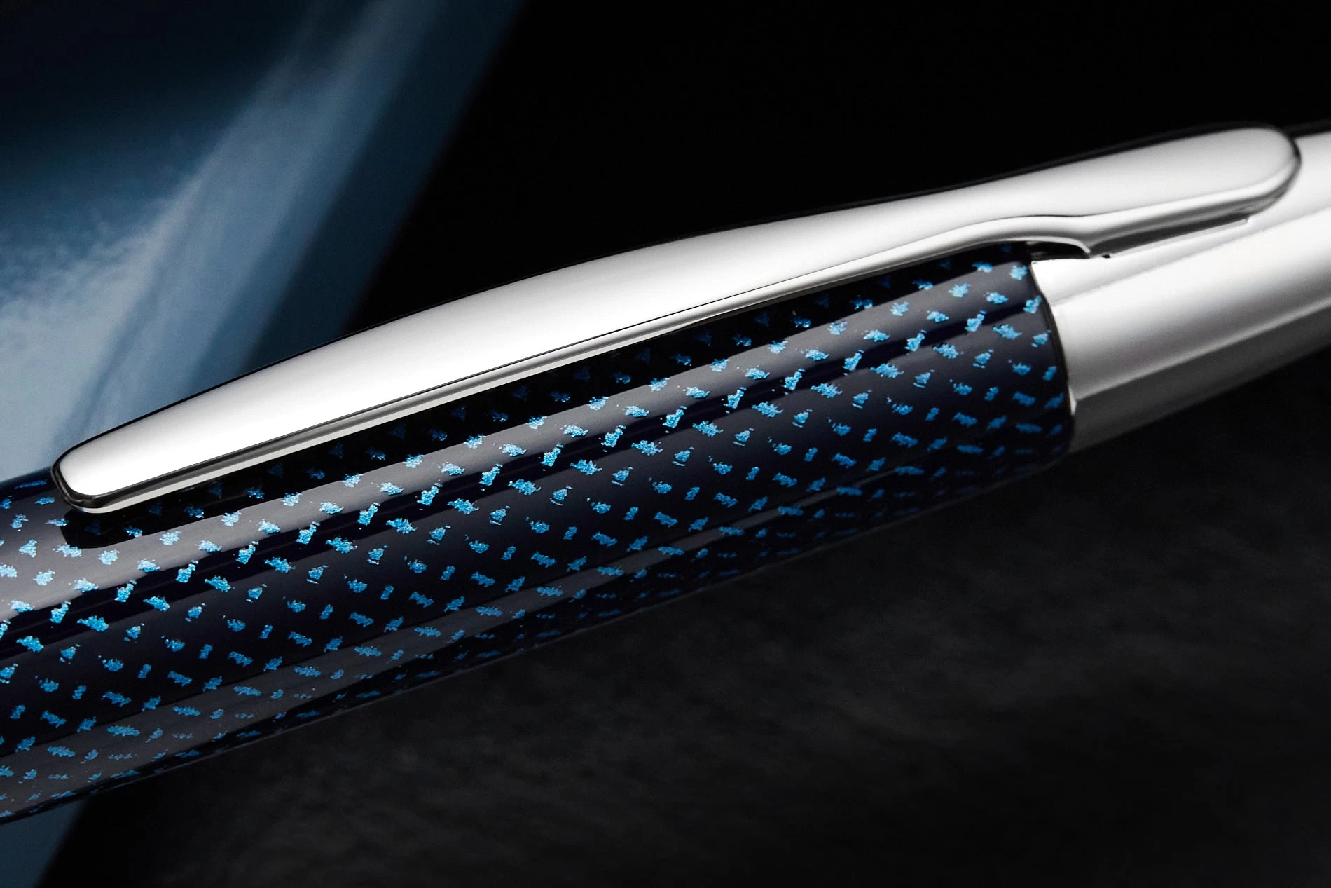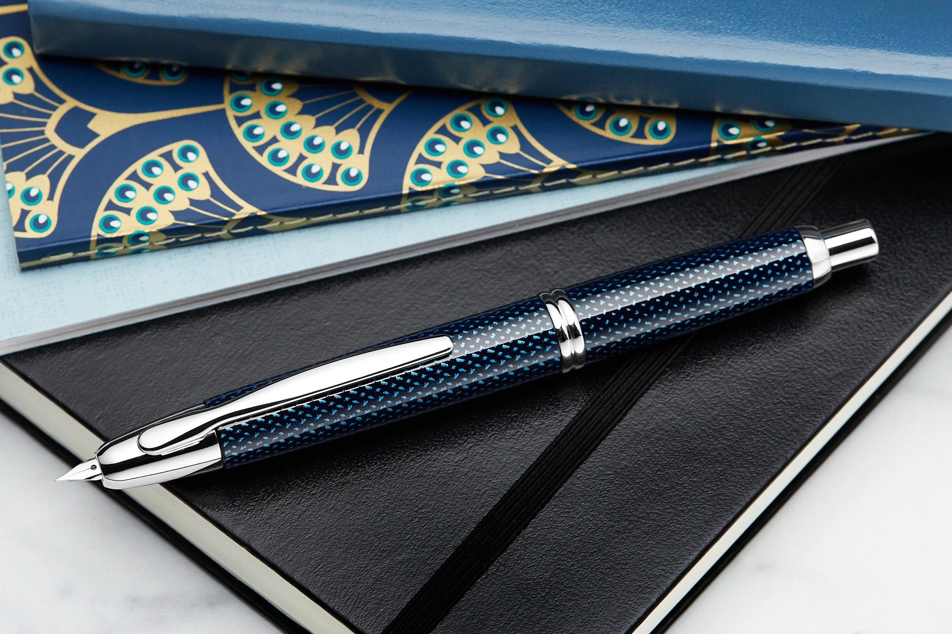 This iconic Pilot Vanishing Point fountain pen has a dark blue carbonesque barrel with rhodium accents. This fountain pen comes with a retractable rhodium-plated 18k gold nib – just click to expose or retract the nib. A hidden trap door helps keep the nib from drying out when not in use. A Pilot CON-40 converter is included with this pen, as well as a Pilot ink cartridge. A metal cartridge cap is also included for use with the ink cartridge. Each Vanishing Point fountain pen is beautifully merchandised in a black gift box.