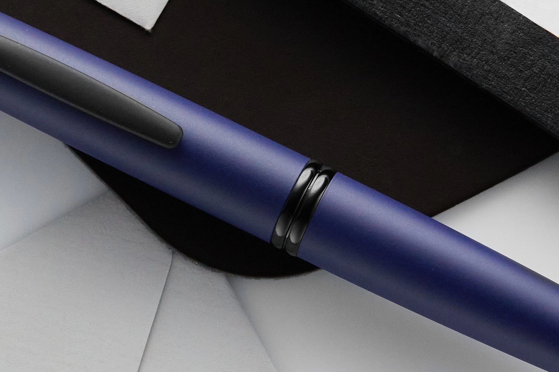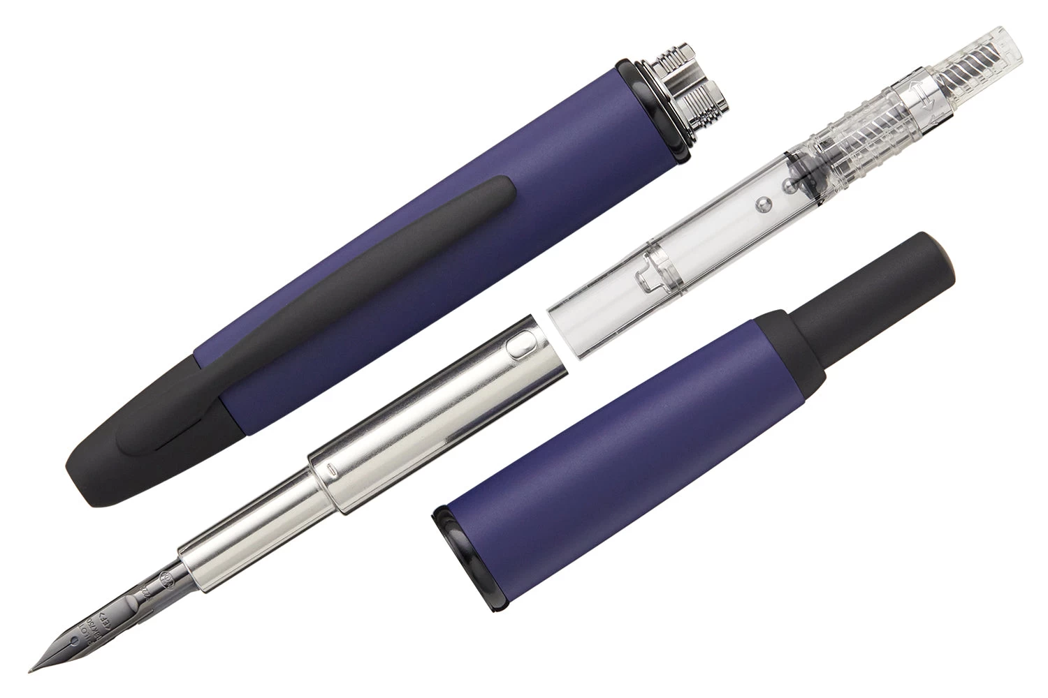 This modern Pilot Vanishing Point fountain pen has a matte blue barrel with black accents. This fountain pen comes with a retractable black ionized 18k gold nib – just click to expose or retract the nib. A hidden trap door helps keep the nib from drying out when not in use. A Pilot CON-40 converter is included with this pen, as well as a Pilot ink cartridge. A metal cartridge cap is also included for use with the ink cartridge. Each Vanishing Point fountain pen is beautifully merchandised in a black gift box.