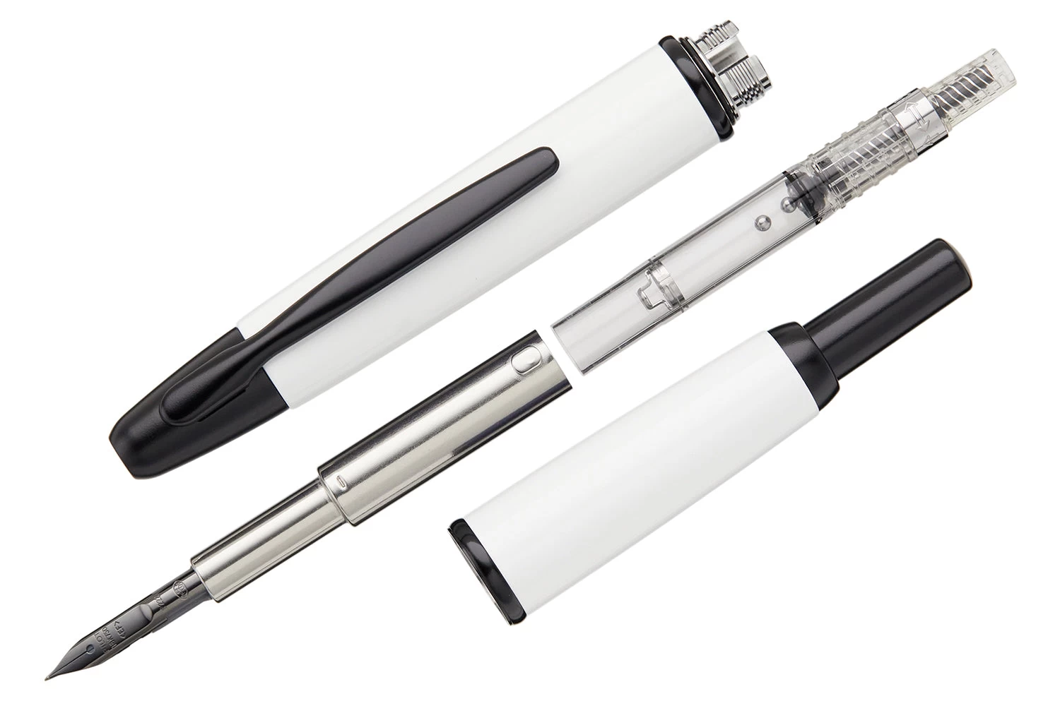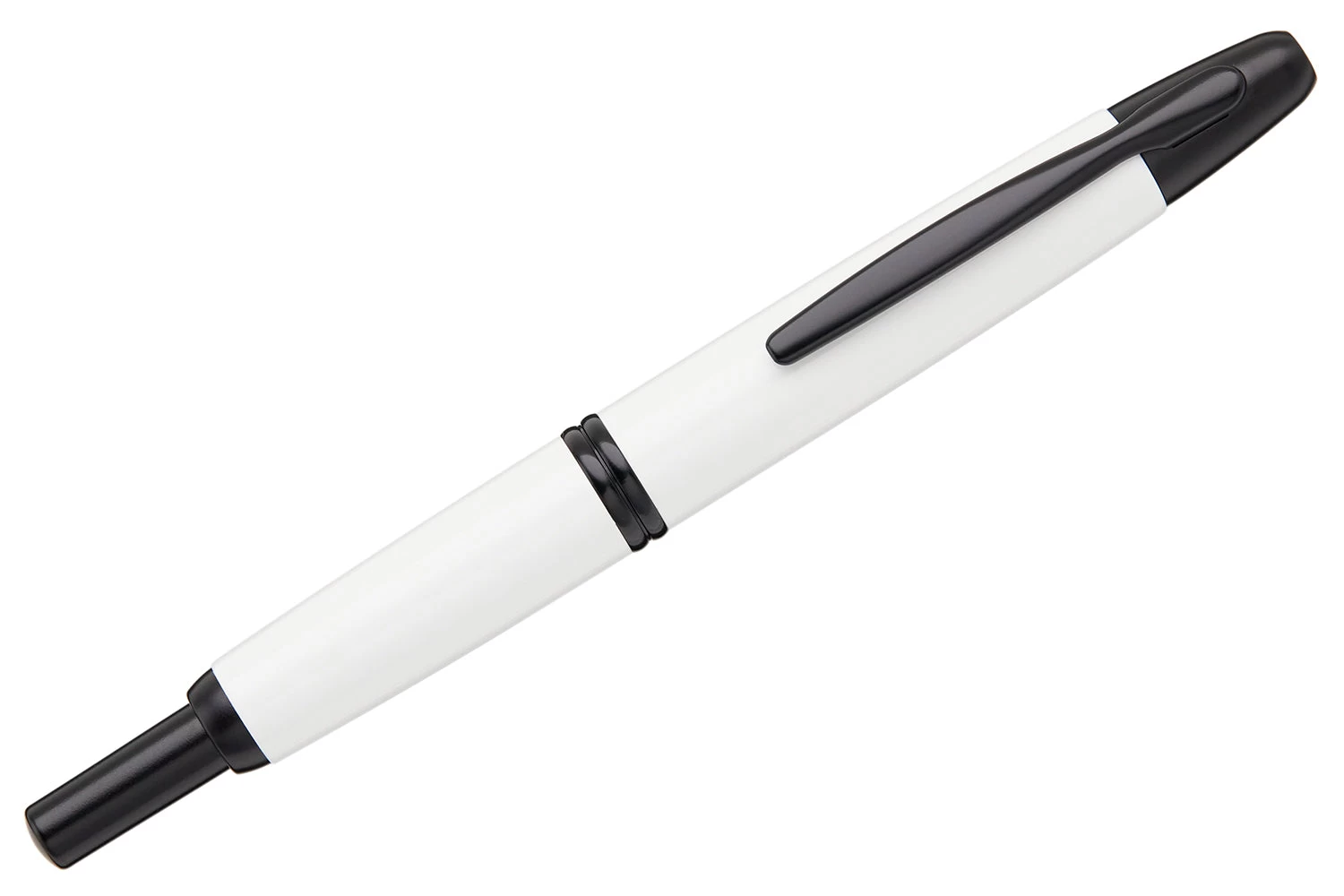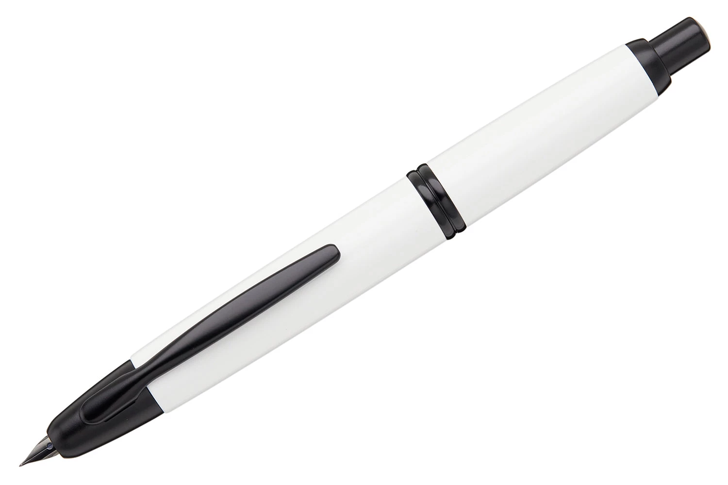 This modern Pilot Vanishing Point fountain pen has a shiny white barrel with black accents. This fountain pen comes with a retractable black ionized 18k gold nib – just click to expose or retract the nib. A hidden trap door helps keep the nib from drying out when not in use. A Pilot CON-40 converter is included with this pen, as well as a Pilot ink cartridge. A metal cartridge cap is also included for use with the ink cartridge. Each Vanishing Point fountain pen is beautifully merchandised in a black gift box.