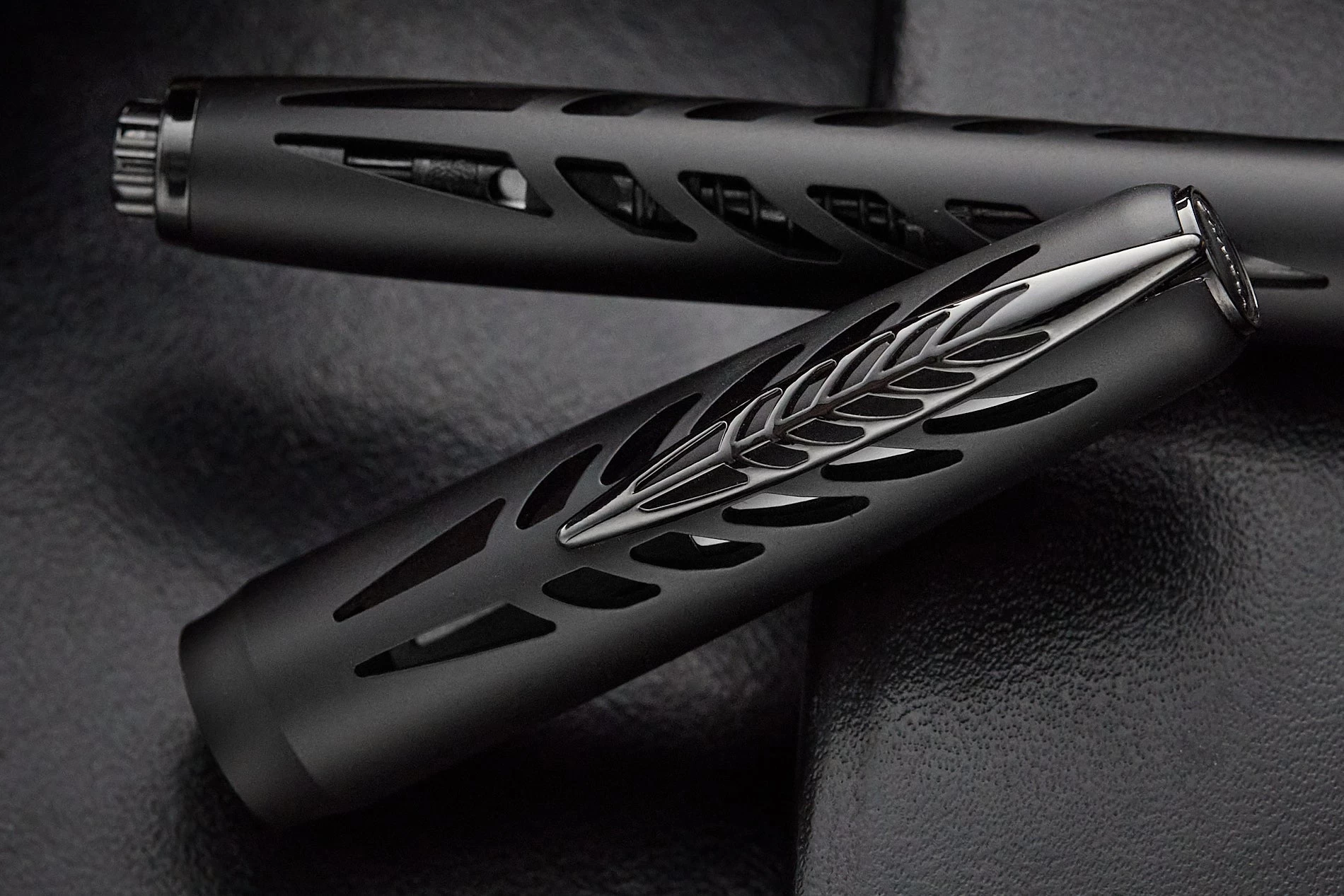 This matte black Aluminum fountain pen features multiple cuts with a black trim and black plated 14k gold nib.