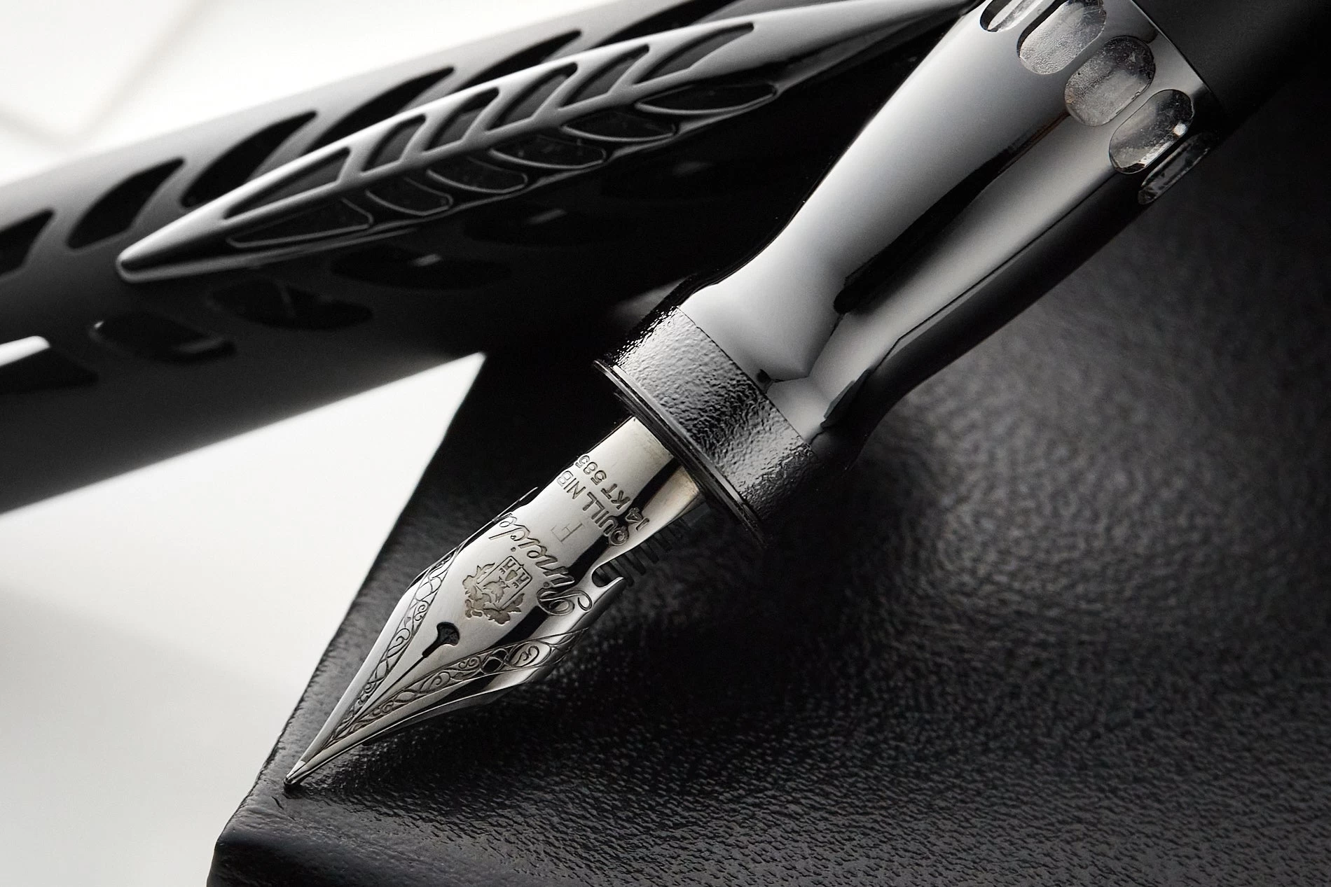 The clip is a skeletal feather where voids and solids play on the style of Arman, emphasizing the feather’s proportions, thus each pen contains the exact morphology of its accumulation or of its break.