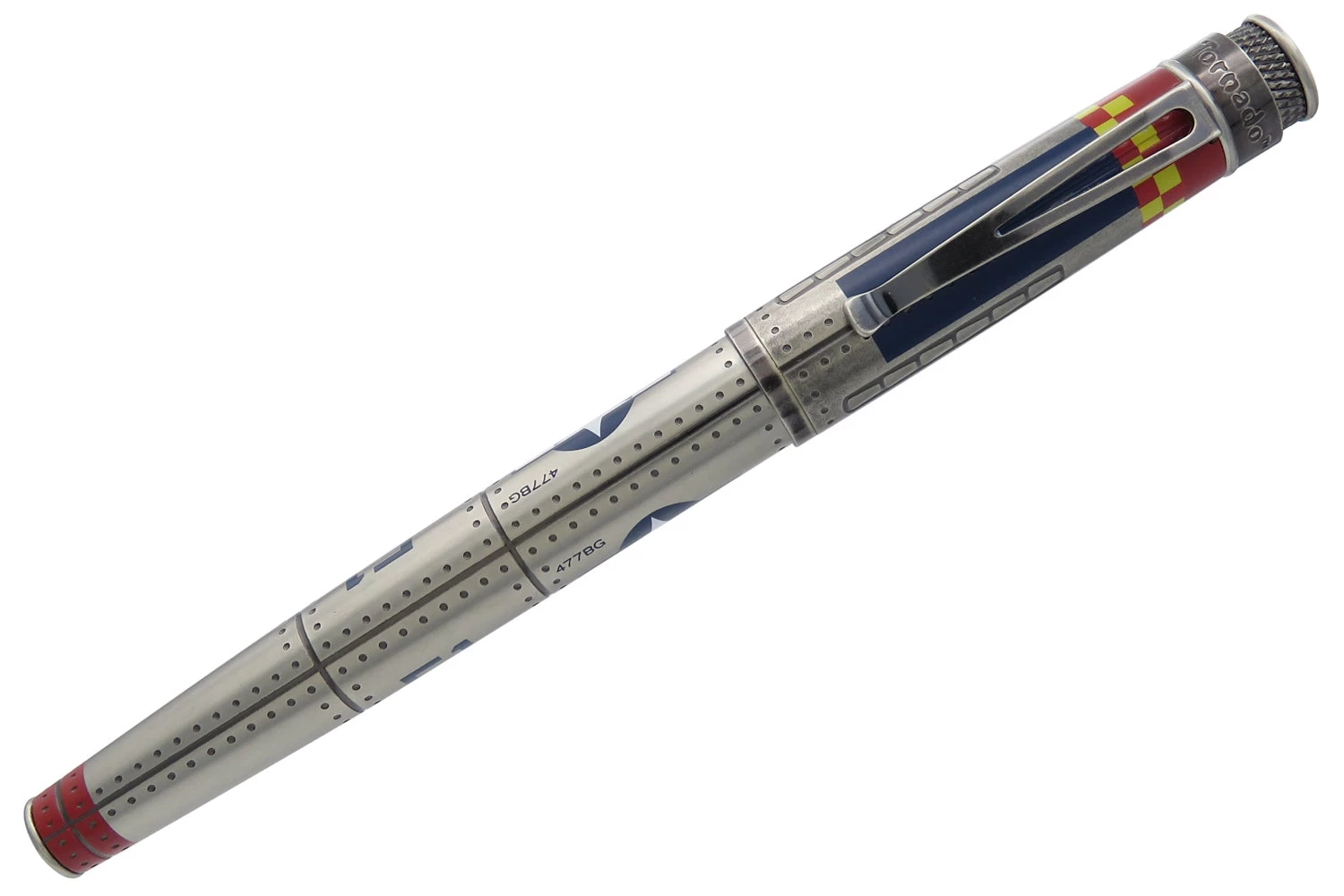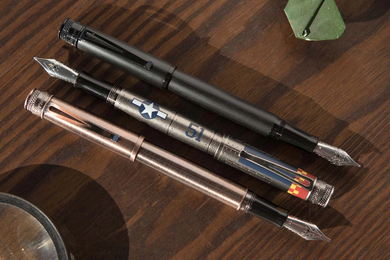 This Retro 51 Tornado fountain pen is acid-etched and printed to recreate the iconic WWII fighter plane. It features Retro 51’s newly designed fountain pen grip and nib. It fills via standard international cartridge/converter and has a smooth-writing unbranded JoWo #6 steel nib. It comes packaged in a tube that doubles as a pen stand, along with a converter and two black short standard international ink cartridges.