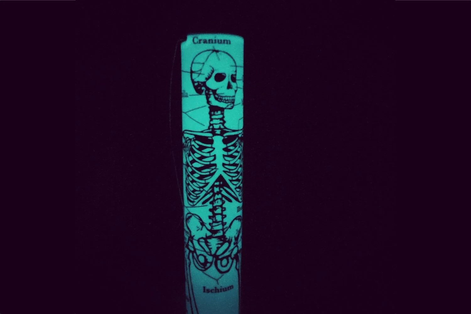 This Retro 51 Tornado rollerball pen features a glow in the dark barrel with skeleton print. It has stonewash trim. Each twist-action pen comes loaded with a black rollerball refill that flows with a medium stroke.