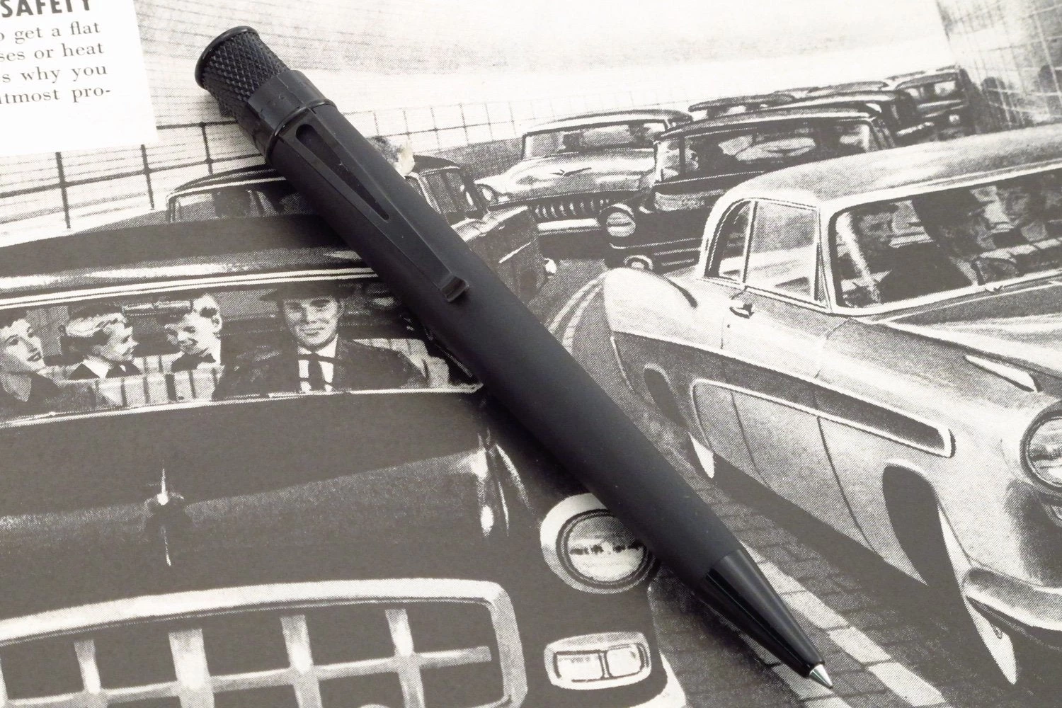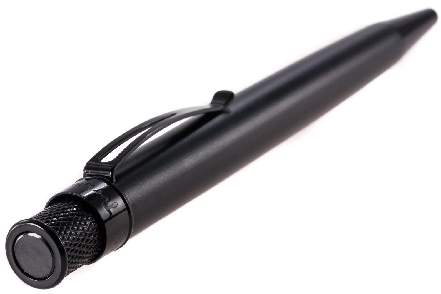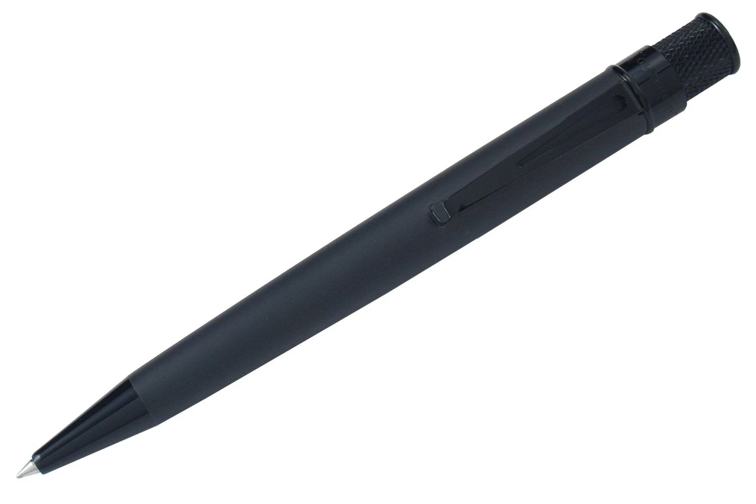 This stealthy Retro 51 Tornado rollerball pen features a matte black barrel with glossy black trim. Each twist-action pen comes loaded with a black rollerball refill that flows with a medium stroke.