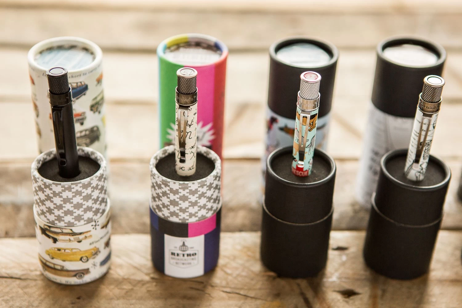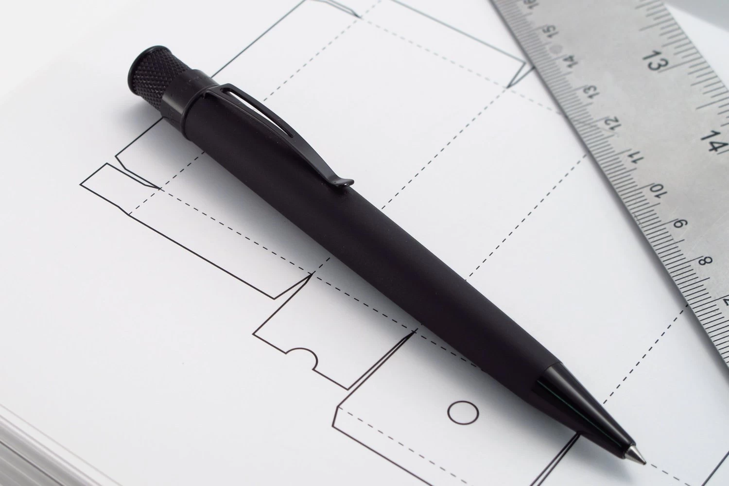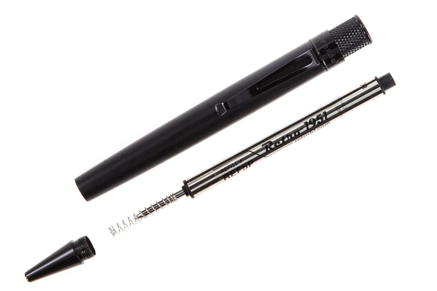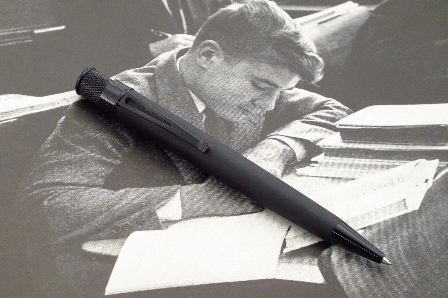 This stealthy Retro 51 Tornado rollerball pen features a matte black barrel with glossy black trim. Each twist-action pen comes loaded with a black rollerball refill that flows with a medium stroke.