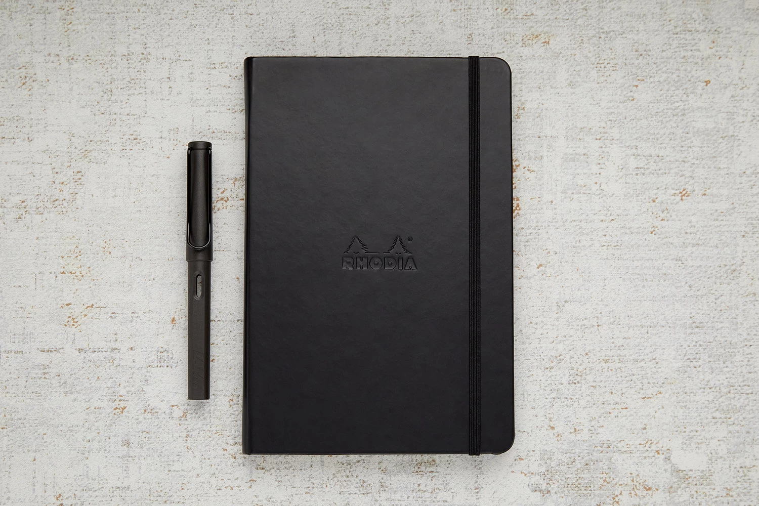 Known as the “Webbie”, the Rhodia Webnotebook is the choice for fountain pen users and everyday note taking. This A5-sized notebook has a black leatherette hard cover. It is filled with 96 sheets (192 pages) of premium 90g ivory Clairefontaine ruled paper. Lines are spaced 7mm apart. Other features include a ribbon marker, an elastic closure, an inner pocket for notes and cards, and elegant round corners.