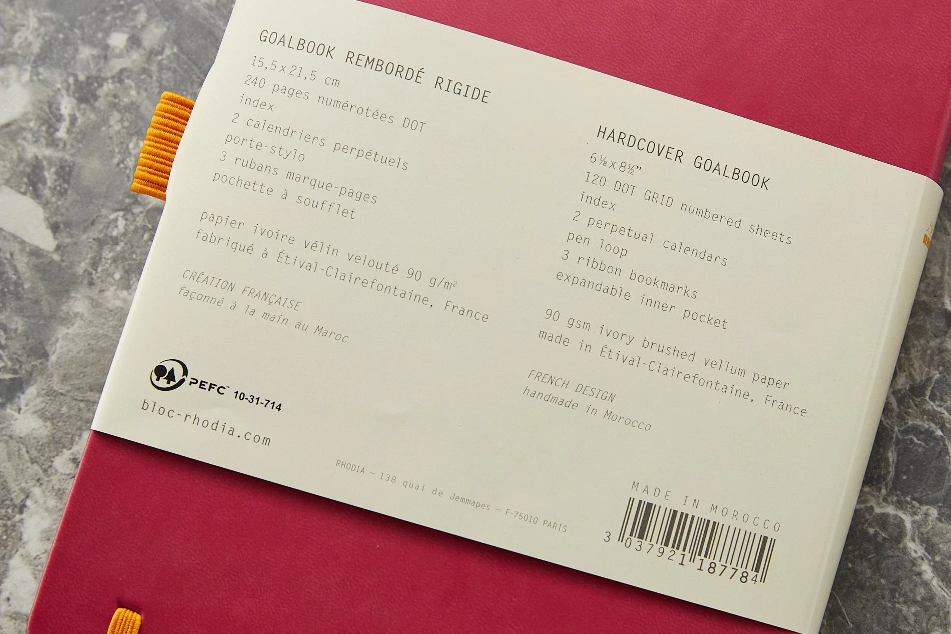 The Rhodia Goalbook’s features include a 6-page table of contents, an undated annual calendar, and undated monthly pages. Each notebook also features numbered pages, three ribbon bookmarks, an attached orange pen loop, an expanding back pocket, glued spine, and an orange elastic closure.