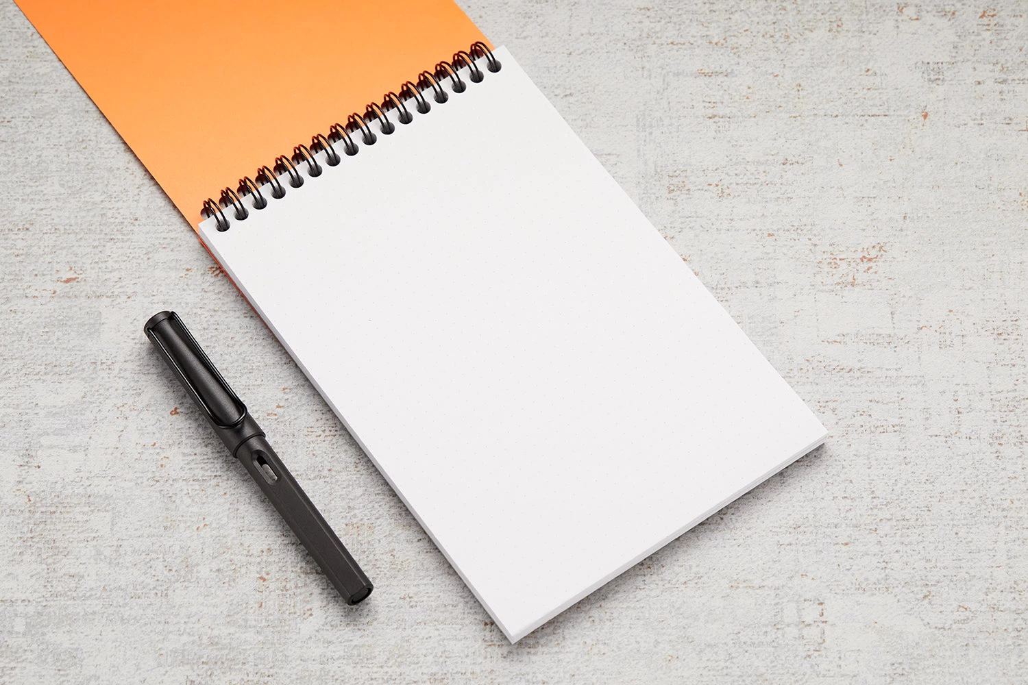 This A5-sized orange Rhodia top wirebound notepad features 80 sheets of extra white 80g acid-free, pH neutral 5mm dot grid paper. Each sheet is microperforated at the top for easy and clean removal. There is a hard cardboard back for writing support. These economical pads are a favorite of artists, designers, writers, and notebook fans for notes, sketching, and hand drafting. People love them for their grids, smooth paper, and iconic cover.