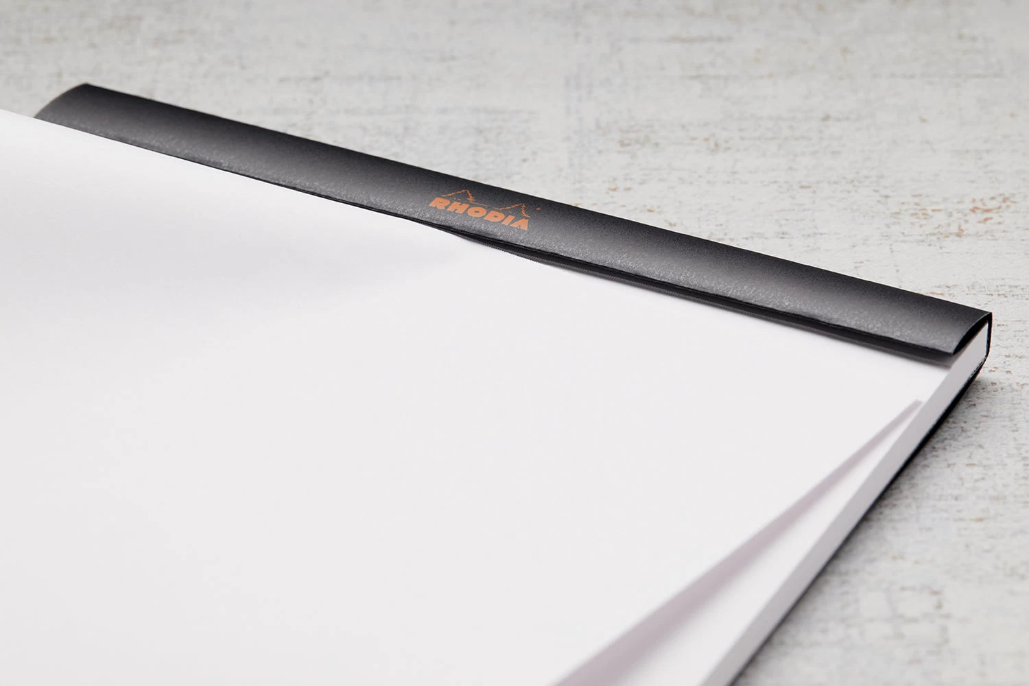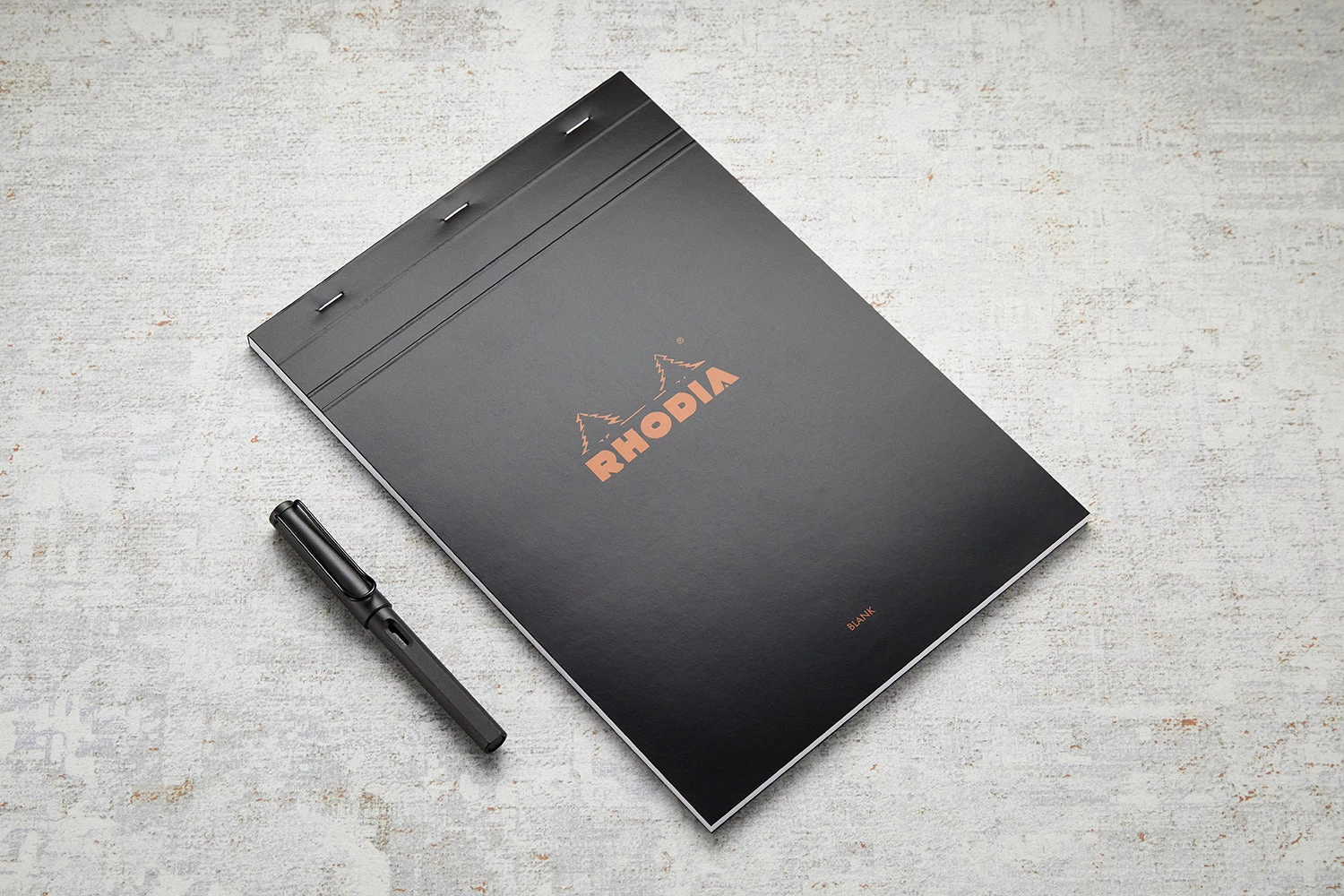 This A4-sized black Rhodia notepad features 80 sheets of extra white 80g acid-free, pH neutral blank paper. Each sheet is microperforated at the top for easy and clean removal. The top stapled cover folds back cleanly, and there is a hard cardboard back for writing support. These economical pads are a favorite of artists, designers, writers, and notebook fans for notes, sketching, and hand drafting. People love them for their grids, smooth paper, and iconic cover.