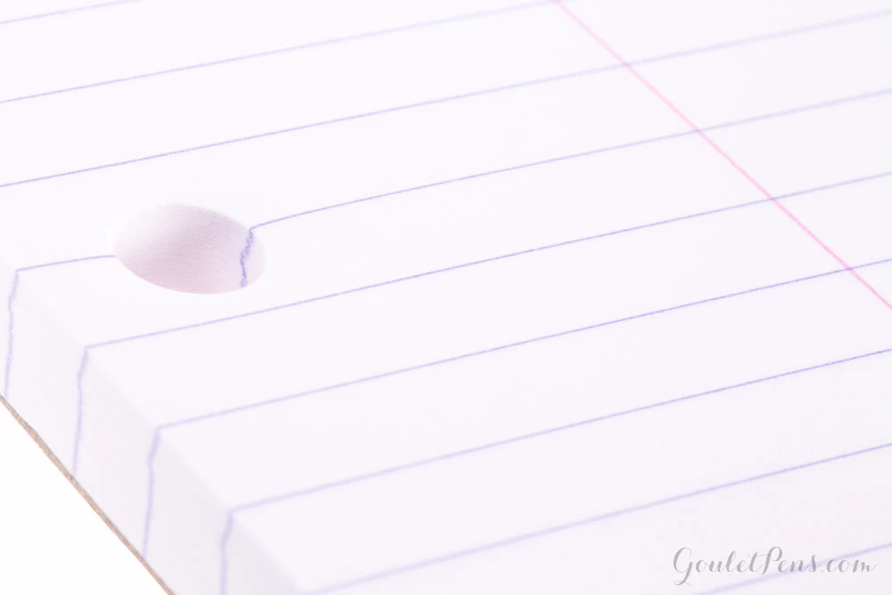 This A4-sized black three-hole punched Rhodia notepad features 80 sheets of extra white 80g acid-free, pH neutral ruled paper. Lines are spaced 7mm apart, and there is a red vertical margin line on the left. Each sheet is microperforated at the top for easy and clean removal. The top stapled cover folds back cleanly, and there is a hard cardboard back for writing support. These economical pads are a favorite of artists, designers, writers, and notebook fans for notes, sketching, and hand drafting. People love them for their smooth paper and iconic cover.