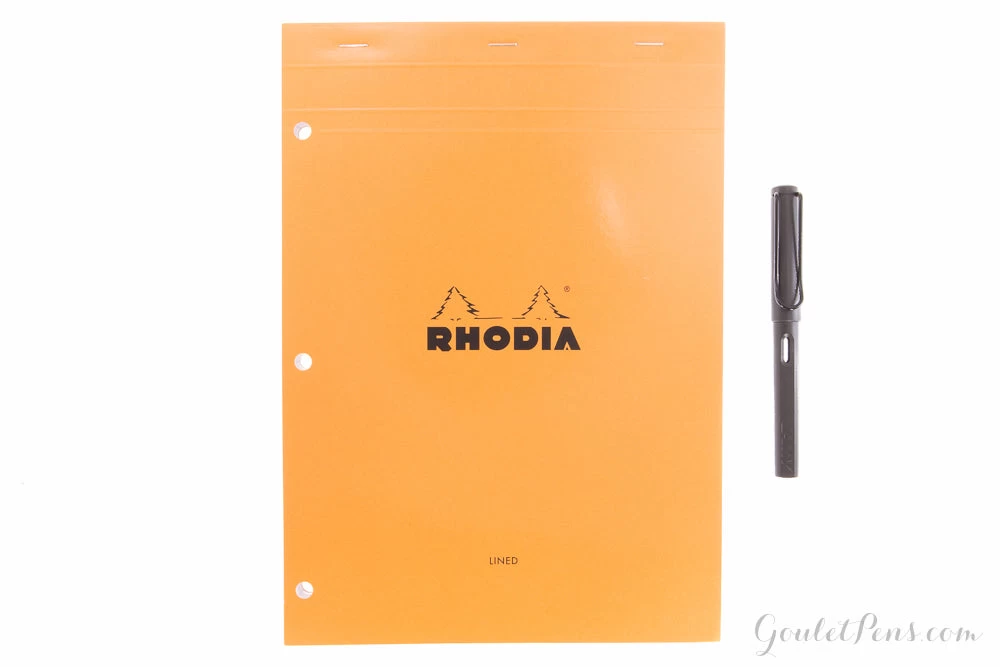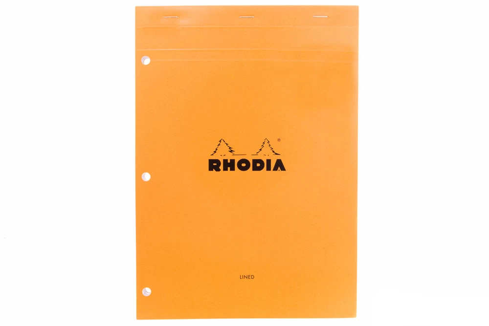 This A4-sized orange three-hole punched Rhodia notepad features 80 sheets of extra white 80g acid-free, pH neutral ruled paper. Lines are spaced 7mm apart, and there is a red vertical margin line on the left. Each sheet is microperforated at the top for easy and clean removal. The top stapled cover folds back cleanly, and there is a hard cardboard back for writing support. These economical pads are a favorite of artists, designers, writers, and notebook fans for notes, sketching, and hand drafting. People love them for their grids, smooth paper, and iconic cover.