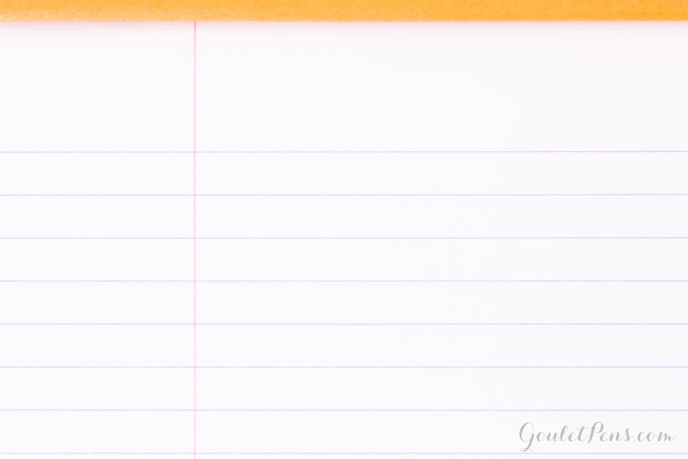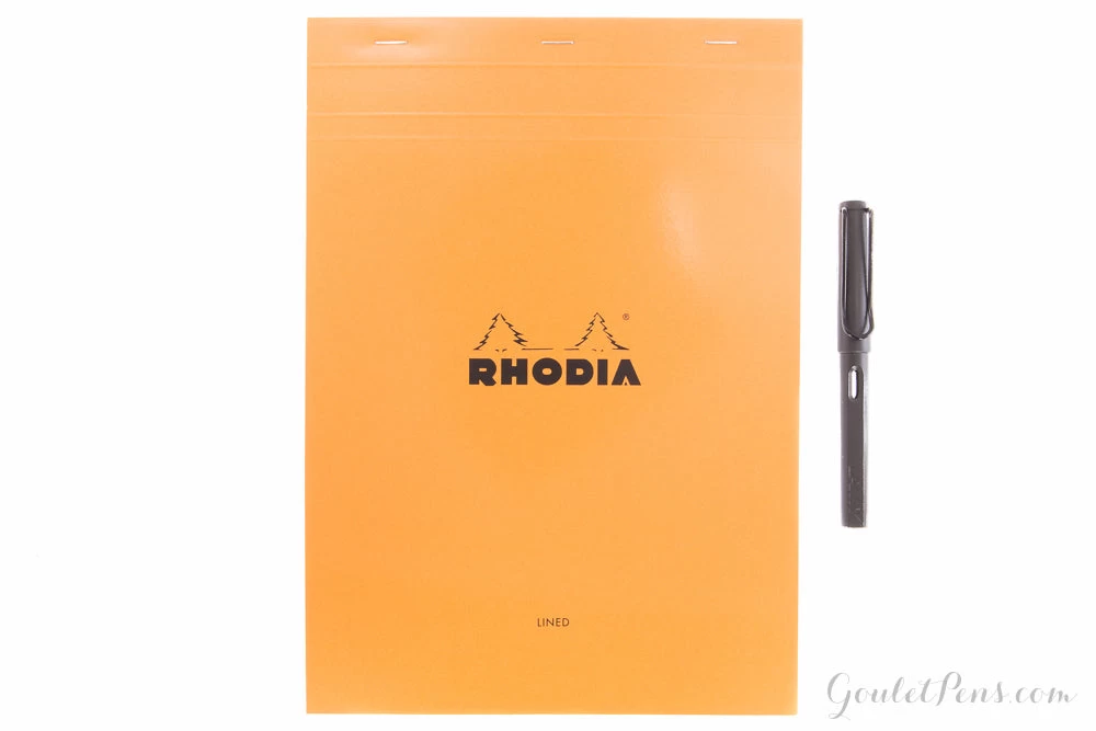This A4-sized orange Rhodia notepad features 80 sheets of extra white 80g acid-free, pH neutral ruled paper.Lines are spaced 7mm apart, and there is a red vertical margin line on the left. Each sheet is microperforated at the top for easy and clean removal. The top stapled cover folds back cleanly, and there is a hard cardboard back for writing support. These economical pads are a favorite of artists, designers, writers, and notebook fans for notes, sketching, and hand drafting. People love them for their smooth paper and iconic cover.