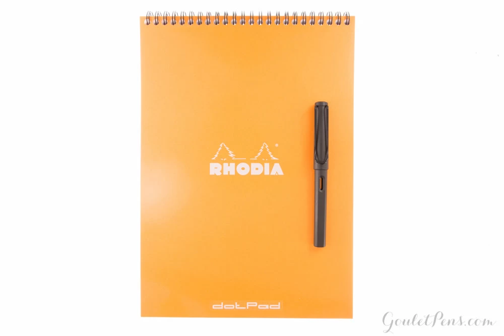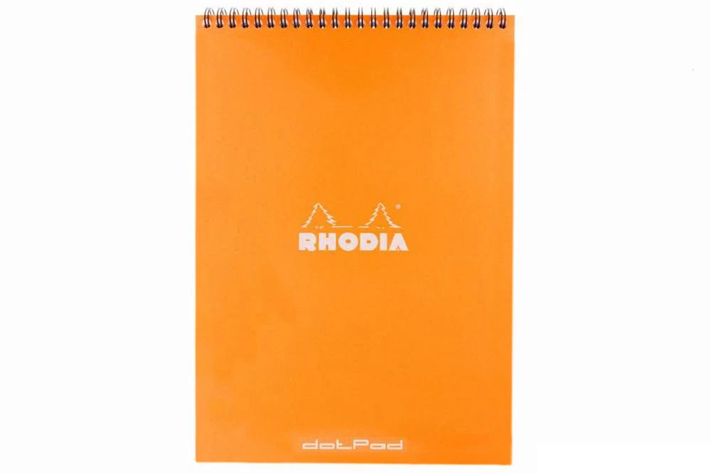 This A4-sized orange Rhodia top wirebound notepad features 80 sheets of extra white 80g acid-free, pH neutral 5mm dot grid paper. Each sheet is microperforated at the top for easy and clean removal. There is a hard cardboard back for writing support. These economical pads are a favorite of artists, designers, writers, and notebook fans for notes, sketching, and hand drafting. People love them for their grids, smooth paper, and iconic cover.