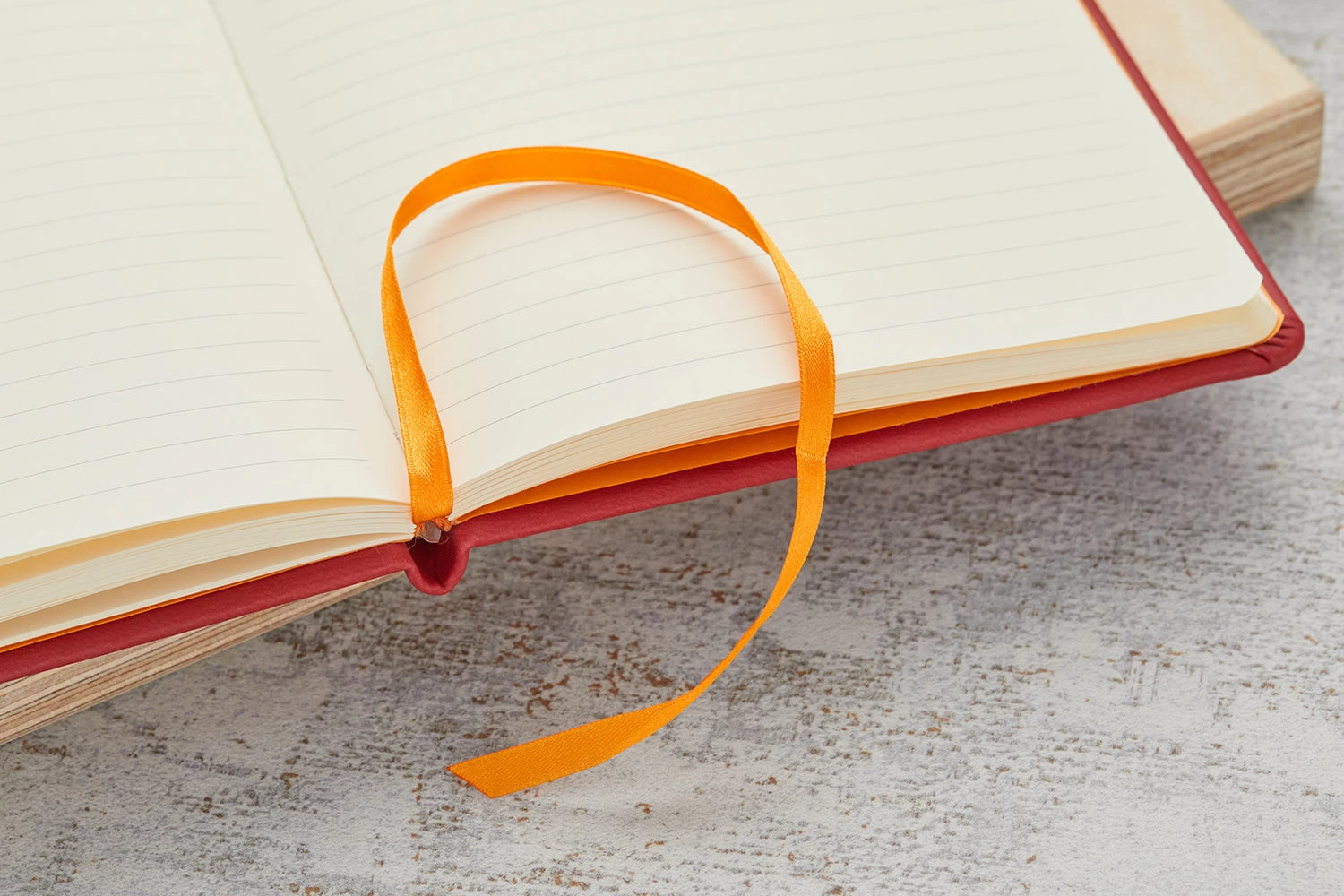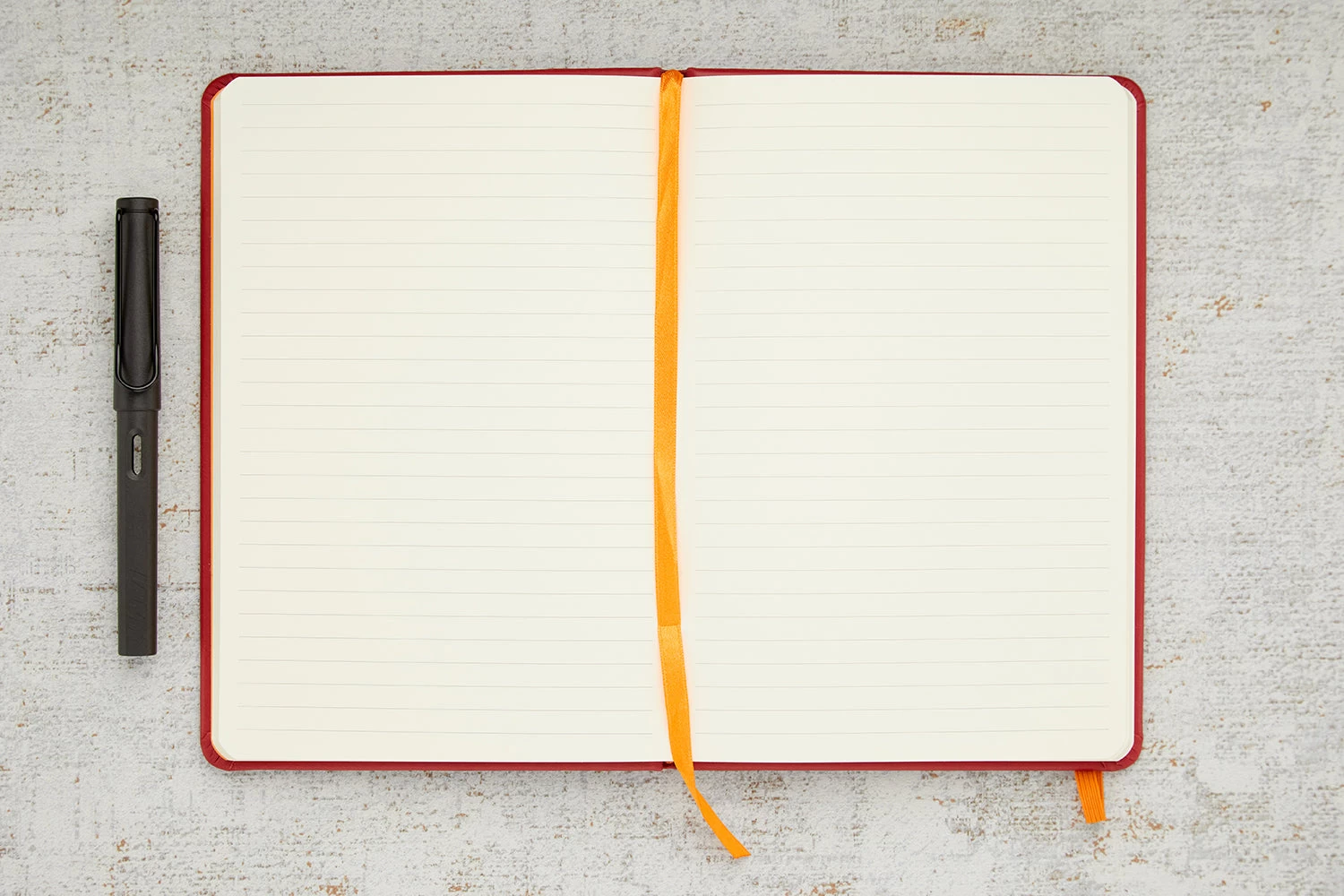 Known as the “Webbie”, the Rhodia Webnotebook is the choice for fountain pen users and everyday note taking. This A5-sized notebook has a poppy red leatherette hard cover. It is filled with 96 sheets (192 pages) of premium 90g ivory Clairefontaine ruled paper. Lines are spaced 7mm apart. Other features include a ribbon marker, an orange elastic closure, an inner pocket for notes and cards, and elegant round corners.