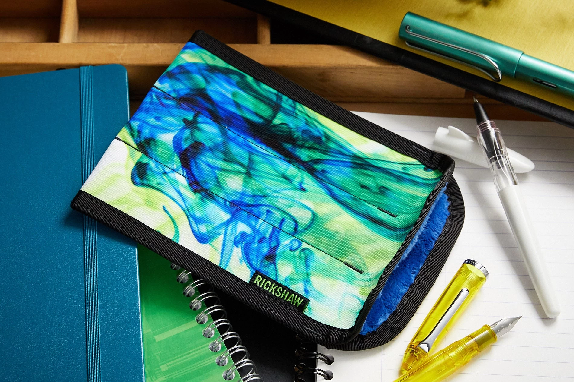 Rickshaw Bagworks pen sleeves are made in San Francisco. The exterior is Rickshaw’s DigiPrint™ polyester canvas, and the interior is Royal Plush™ polyester. Black nylon binding and thread. All materials are colorfast and machine washable.