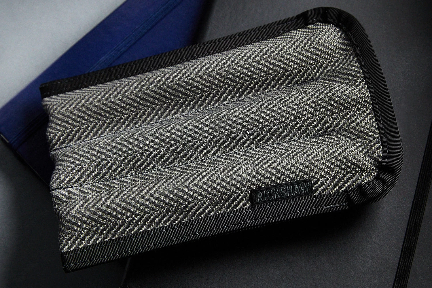 Protect your precious pens from the daily rough-and-tumble with these plush-lined sleeves. This Rickshaw Bagworks custom pen coozy features a tweed polyester canvas exterior material, with a super-soft graphite grey plush interior. This long pen coozy holds three pens.
