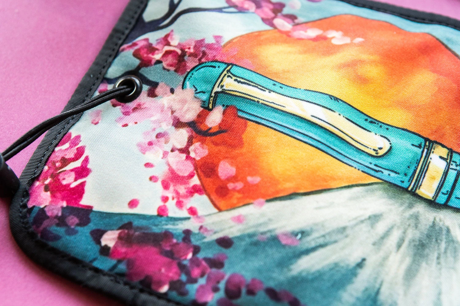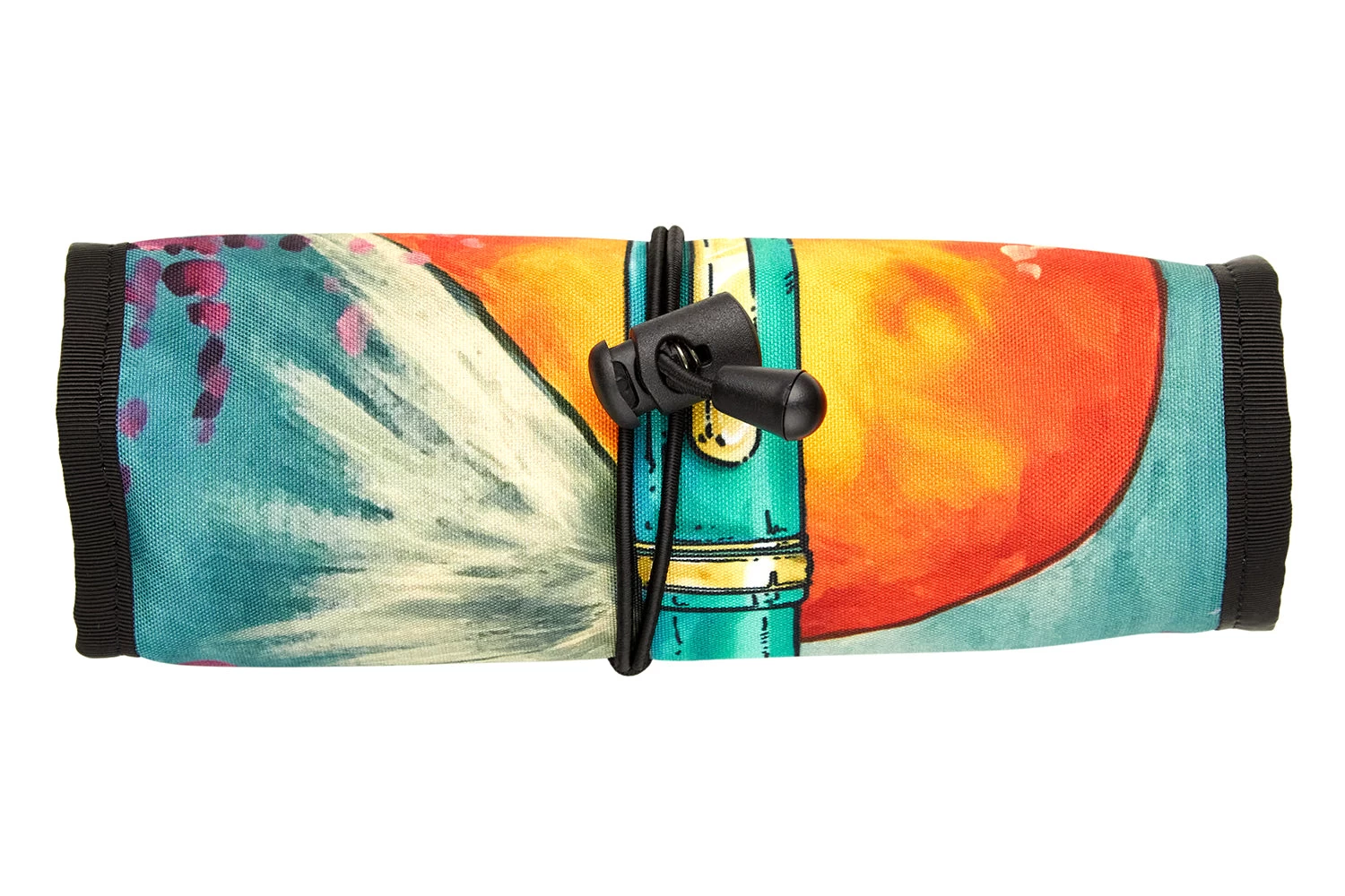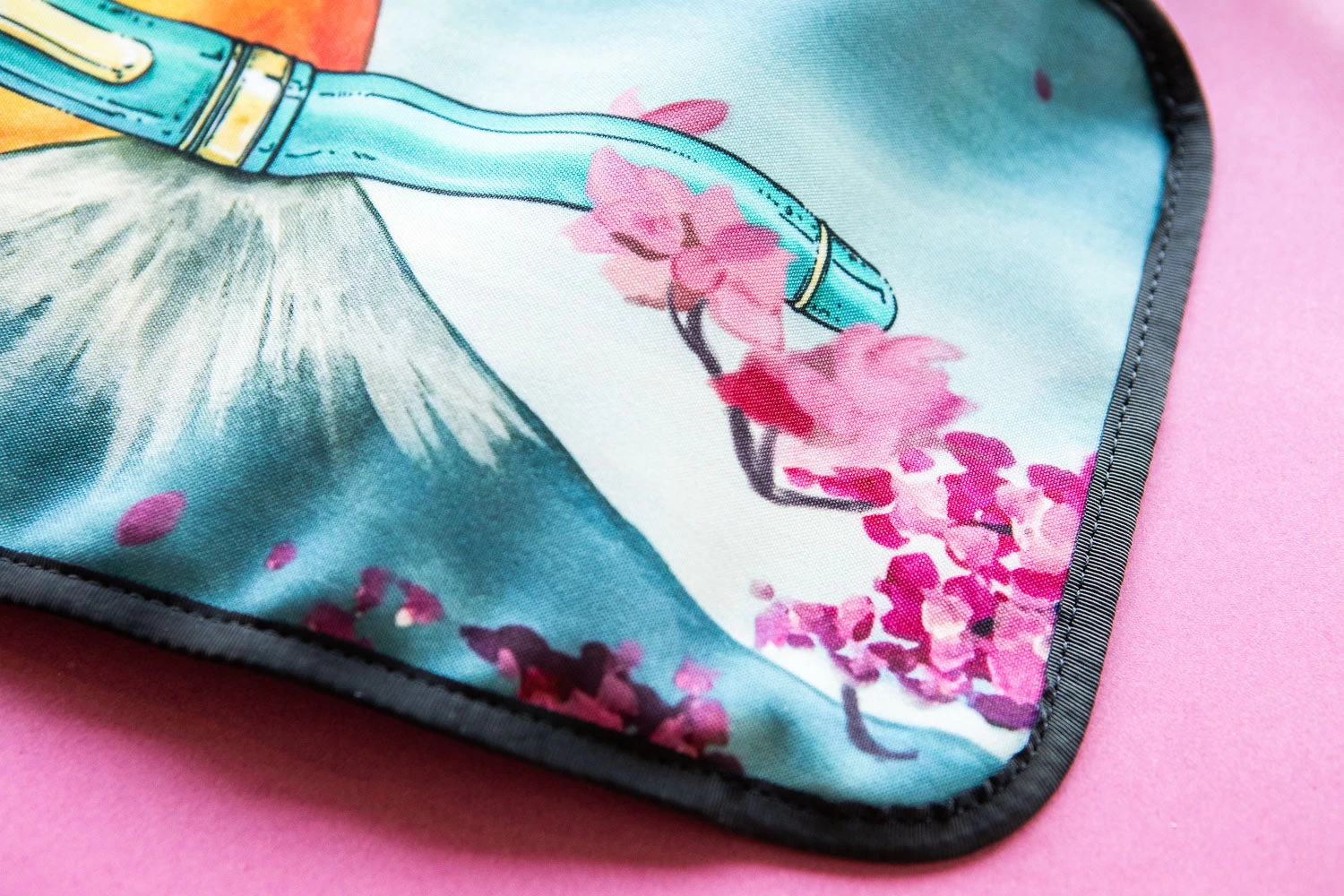 Protect your precious pens from the daily rough-and-tumble with this plush-lined pen. This Rickshaw Bagworks custom pen roll features a beautiful painting by Thales Medeiros of a fountain pen atop Mt. Fuji reprinted on a polyester canvas material, with a super-soft turquoise plush interior. Six generously-sized plush-lined slots accommodate most pens up to 5.8-inches in length. The elastic cord and cord-lock keep your pens snug and safely stored.