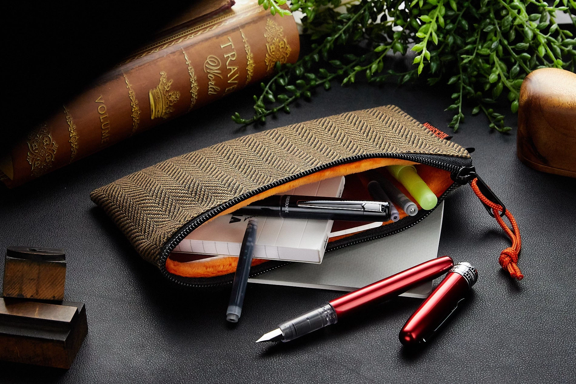 This Rickshaw Bagworks custom pen pouch features a brown tweed polyester canvas material, with a super-soft mandarin orange plush interior.