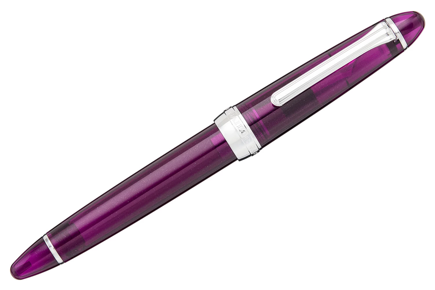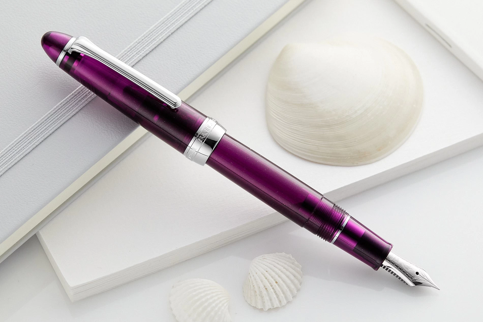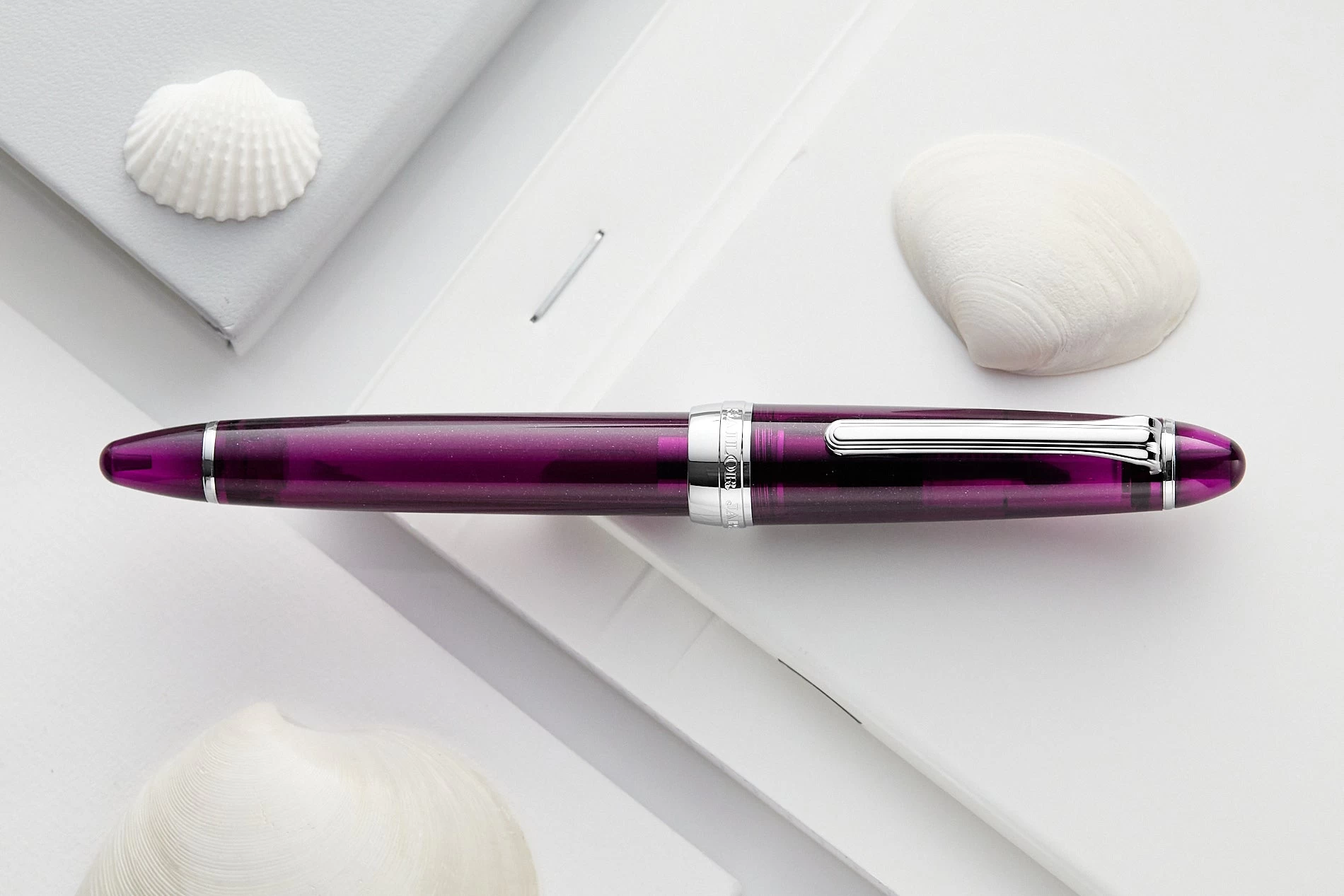 Violet Jellyfish has a beautiful translucent purple color body and comes with rhodium trim and a 14k gold nib with rhodium plating. The cap screws to open/close and can push to post onto the back of the barrel when writing. The 1911S comes with a Sailor proprietary converter as well as two proprietary Sailor Black ink cartridges.