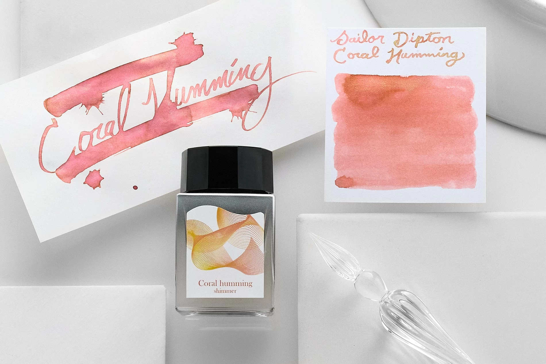 20ml square glass bottle of Sailor Dipton Coral Humming ink, a coral color with added gold shimmer. Each bottle contains iridescent particles that exhibit mesmerizing color shifts based on the angle and lighting, turning every piece of writing into a dynamic work of art.