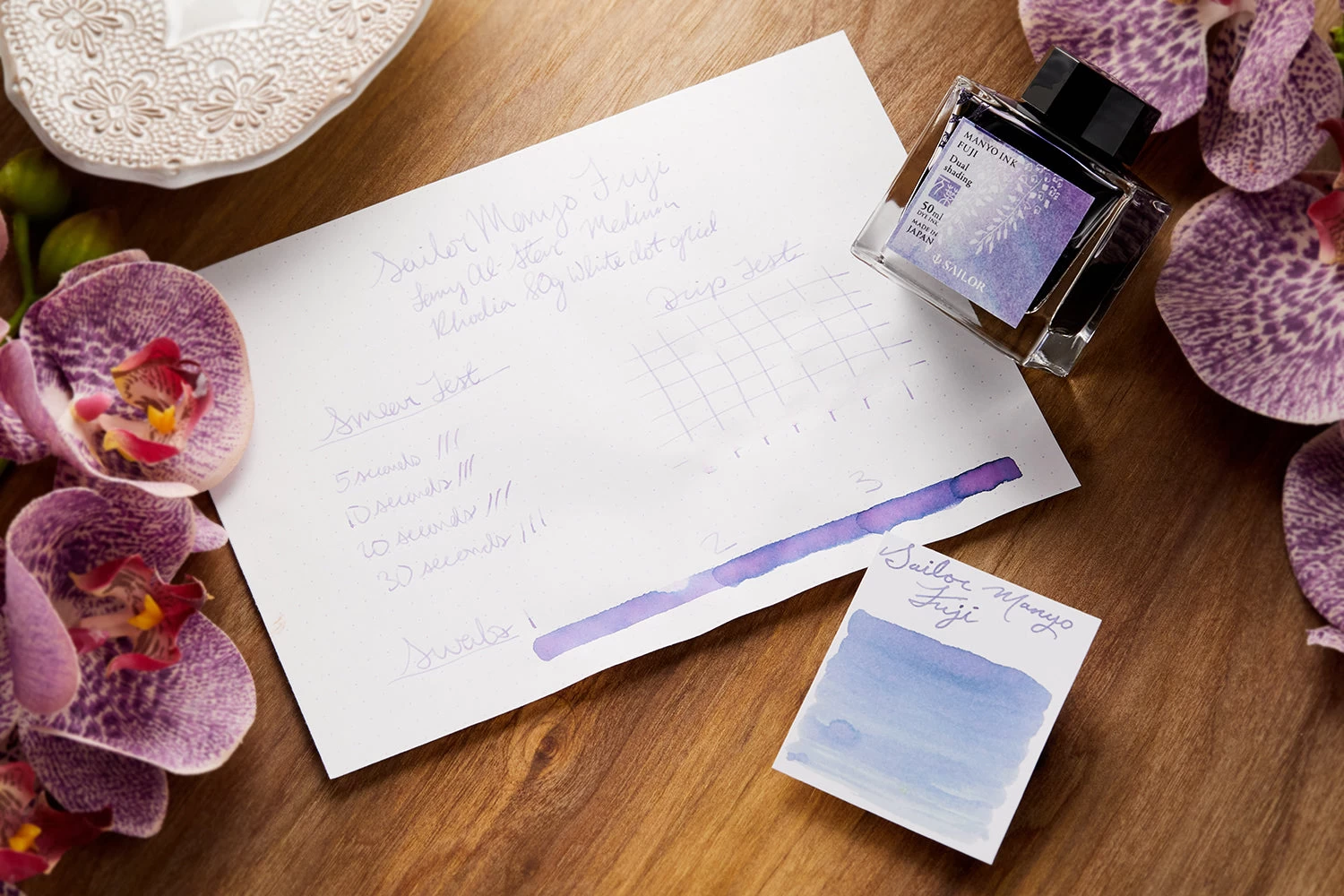 Fuji is a light amethyst purple that shades out to different purples. As part of the third release in the Manyo ink series, Fuji is a dual shading ink, which means it shades different colors than its base colors when pooling into areas of high and low concentration on the paper. Dual shading inks are really fascinating.