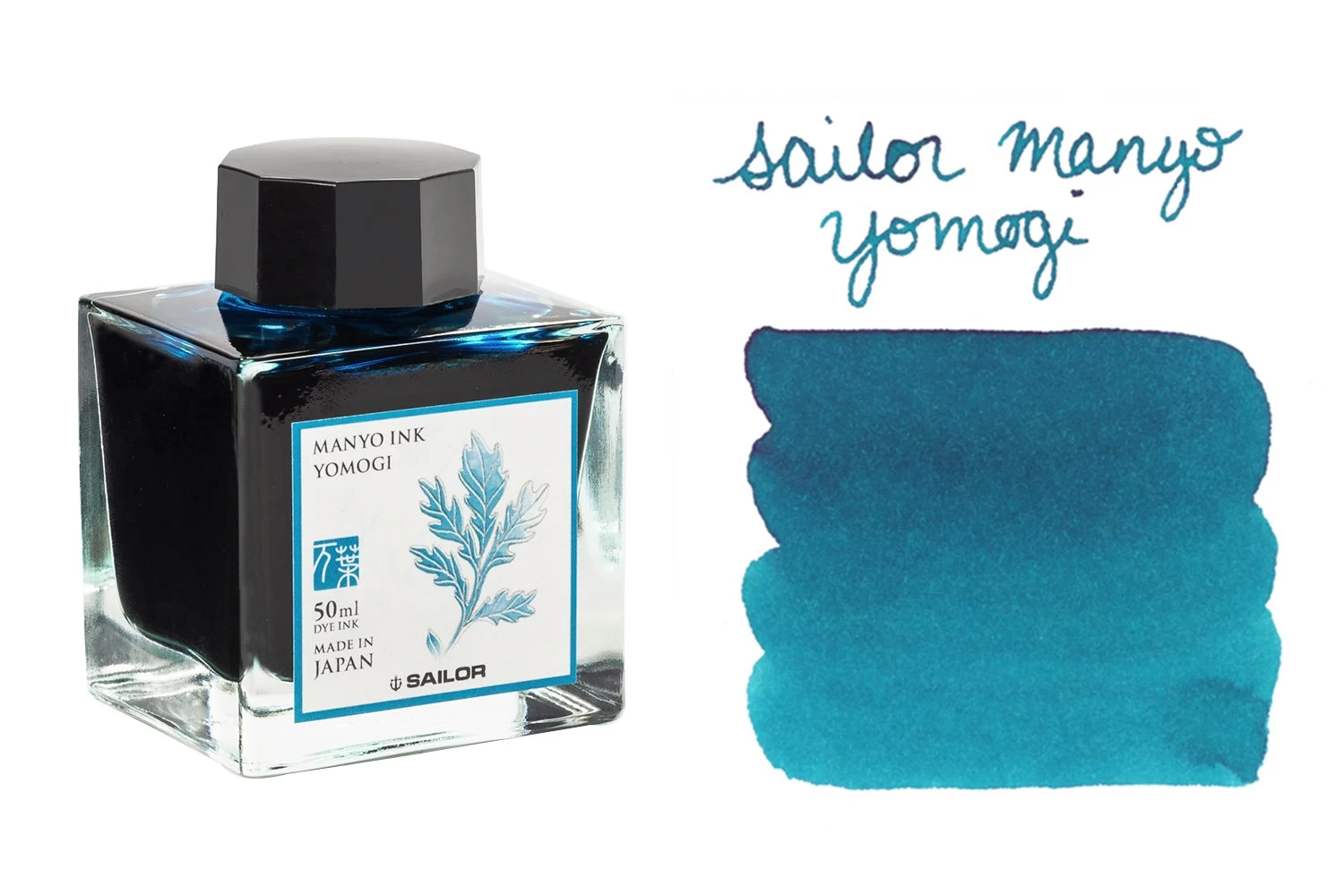 50ml square glass bottle of Sailor Manyo Yomogi teal fountain pen ink. This smooth-flowing water-based dye ink is specifically formulated to be safe for all fountain pens.