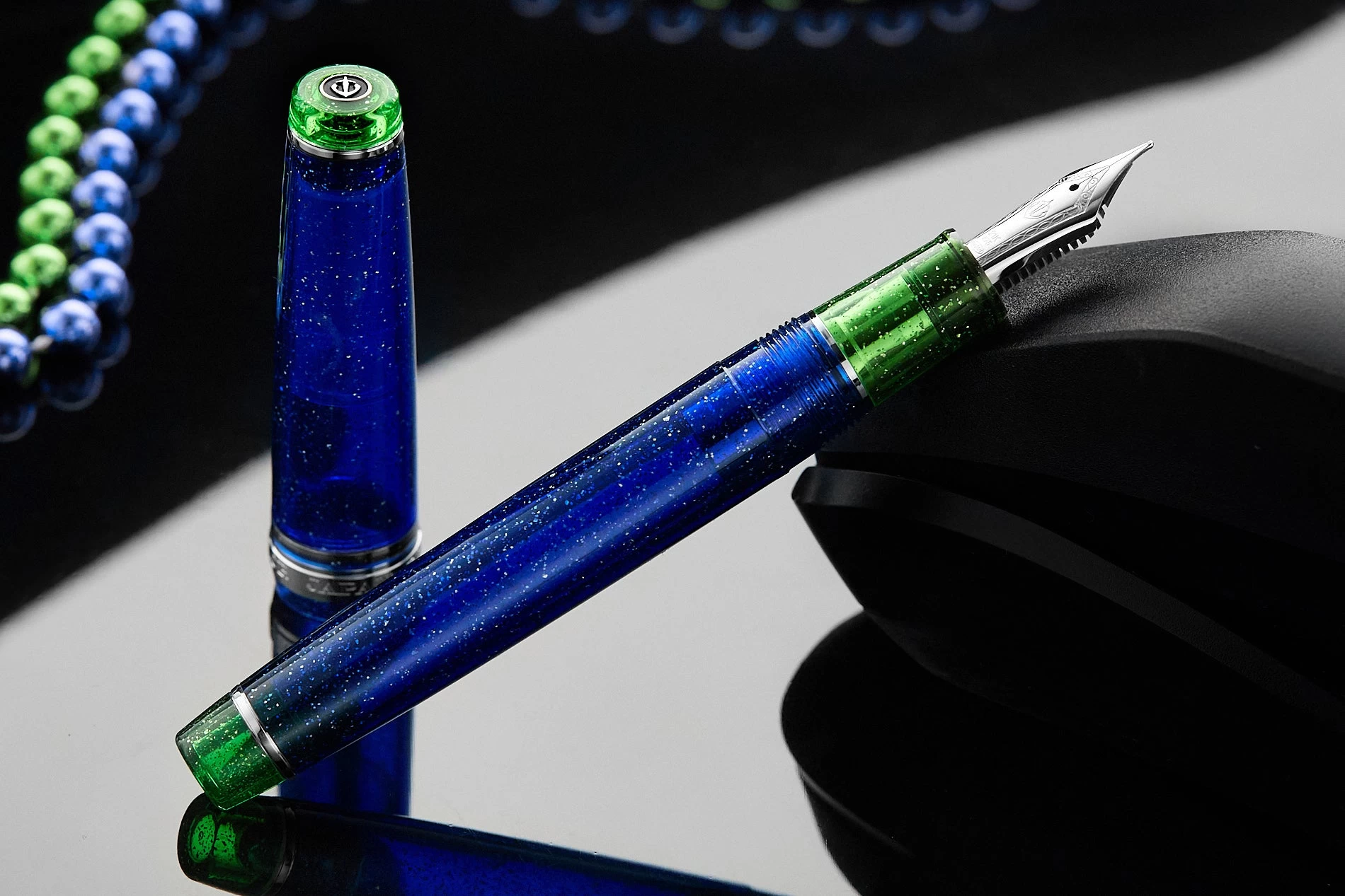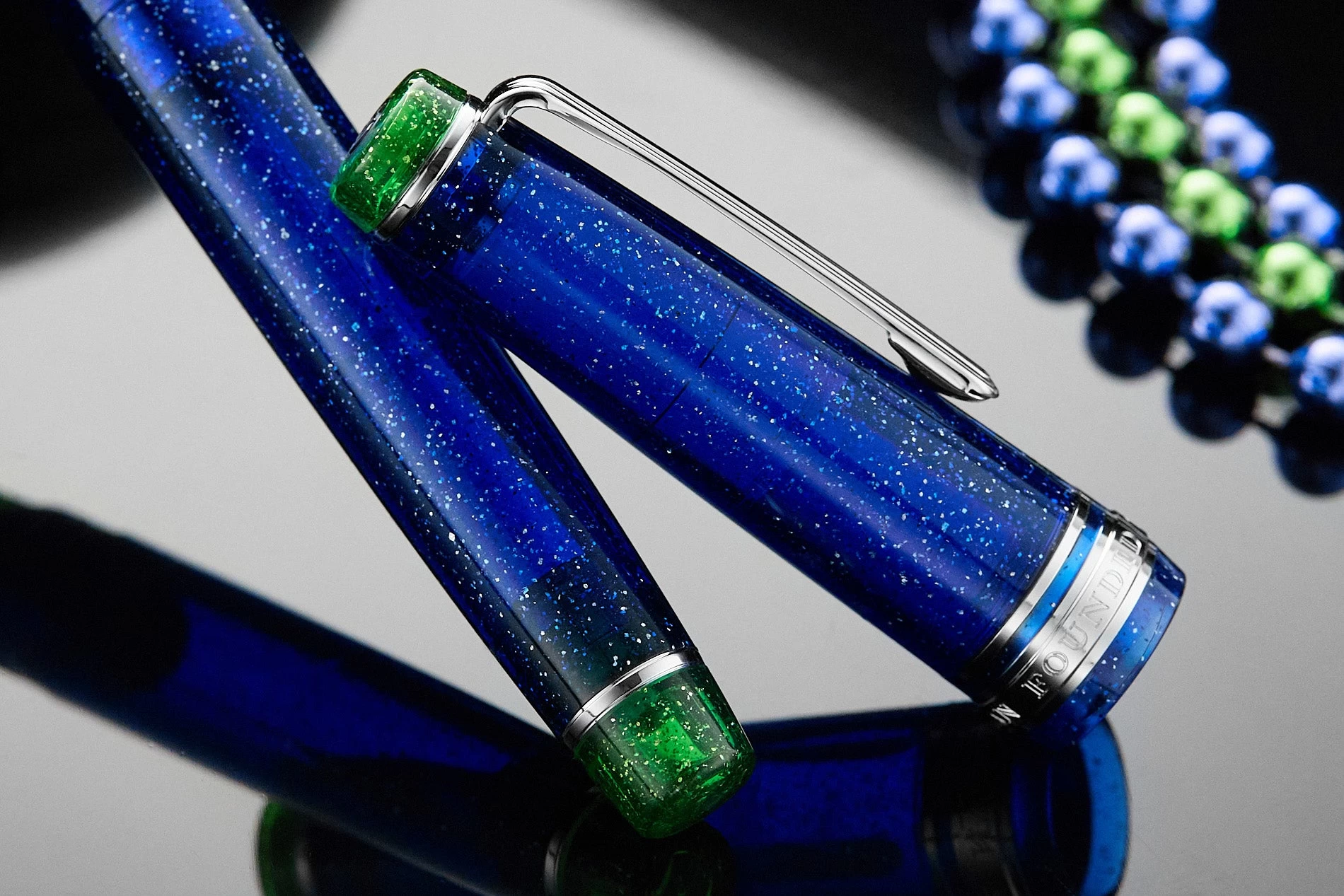 The second entry in our new Northern Lights Pro Gear collection, this fountain pen features a translucent glittering blue barrel and cap, accented by a translucent glittering green grip section and finials. The sparkling look is complemented by silver accents.