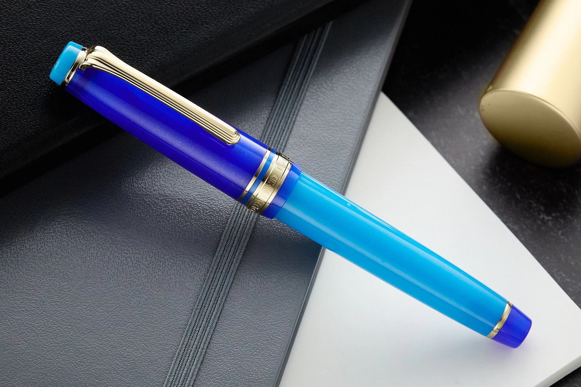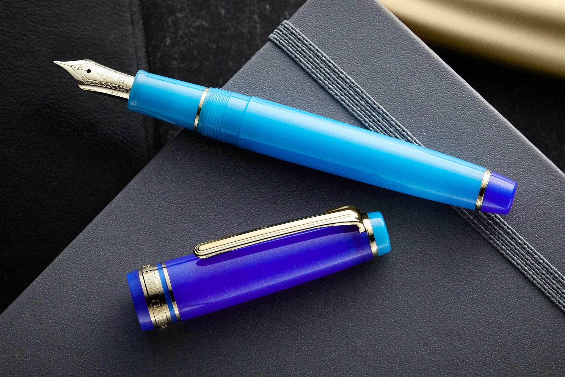 Like the light bursting from the endlessness of space, the light blue resin body and top finial glow against a deep space blue cap with metashine that glimmers like the light of distant stars. The bottom finial ties it together with more shimmering space blue to match the cap. And all of it is set against elegant gold-plated accents. The flat top cap features the Sailor anchor logo inset into the top finial.