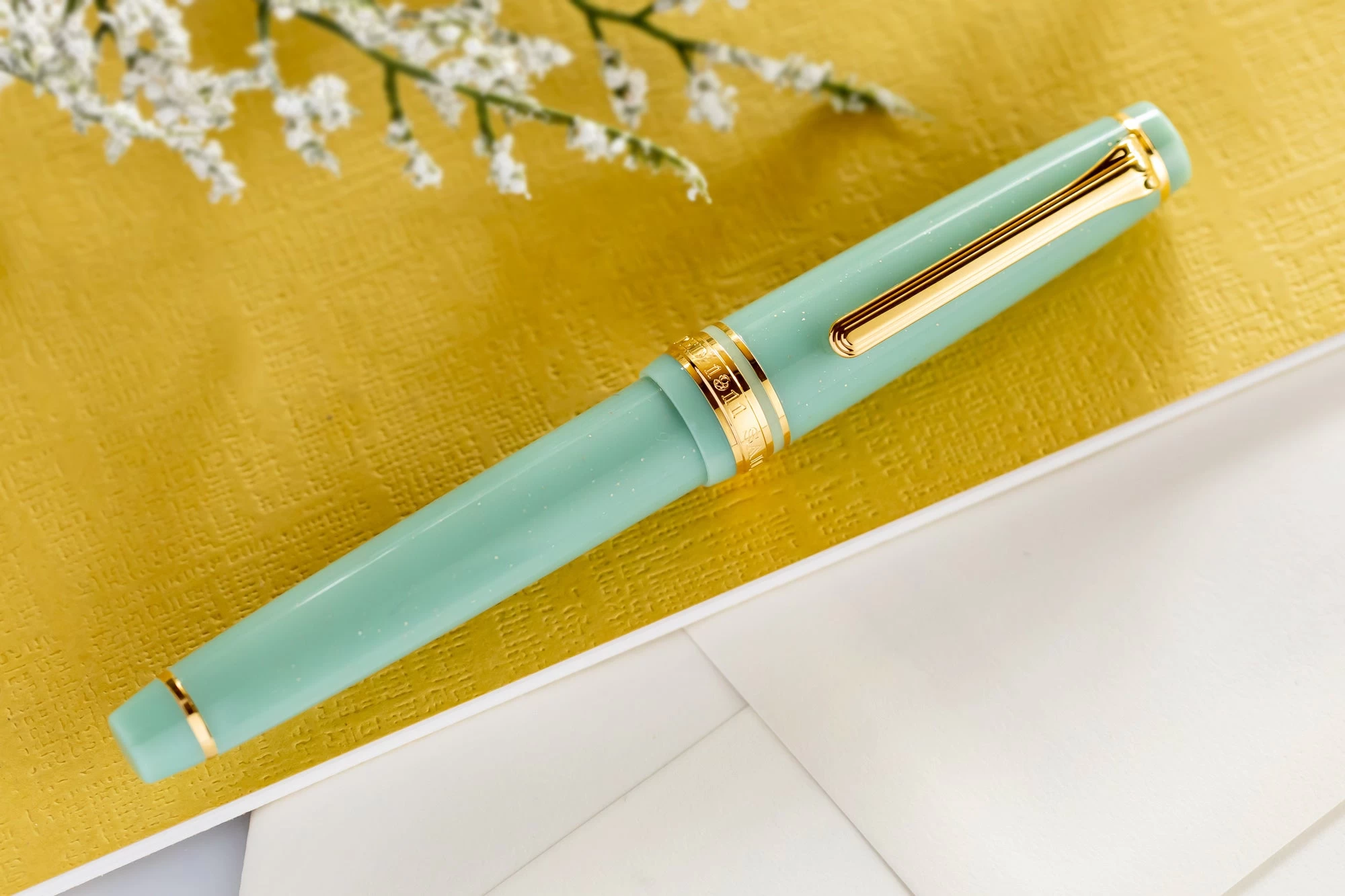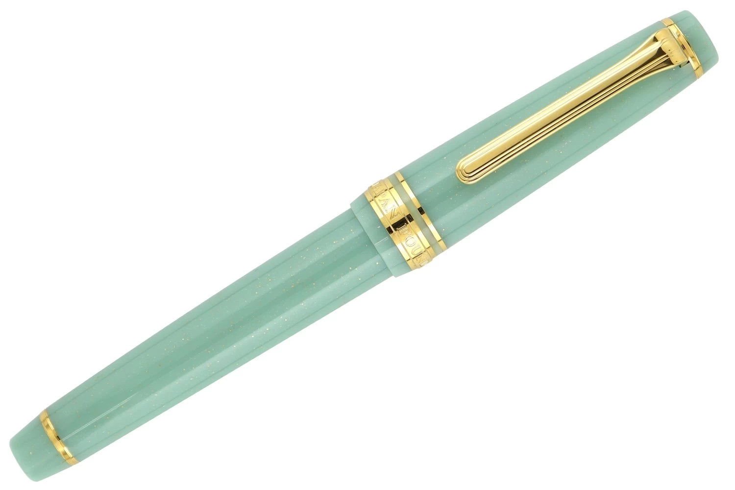 This Sailor Pro Gear Slim Dragon Palace fountain pen features a glittering mint pastel green resin barrel and cap, complemented by gold-plated accents. This is one of four colors as part of Sailor’s Shikiori Special Edition Japanese Fairy Tale collection. The flat top cap features the Sailor anchor logo inset into the top finial. It comes equipped with Sailor’s legendary 14k yellow gold nib in medium fine. The cap screws to open/close and can push to post onto the back of the barrel when writing. The Professional Gear Slim fountain pen comes with a Sailor proprietary converter as well as two proprietary Sailor Black ink cartridges.