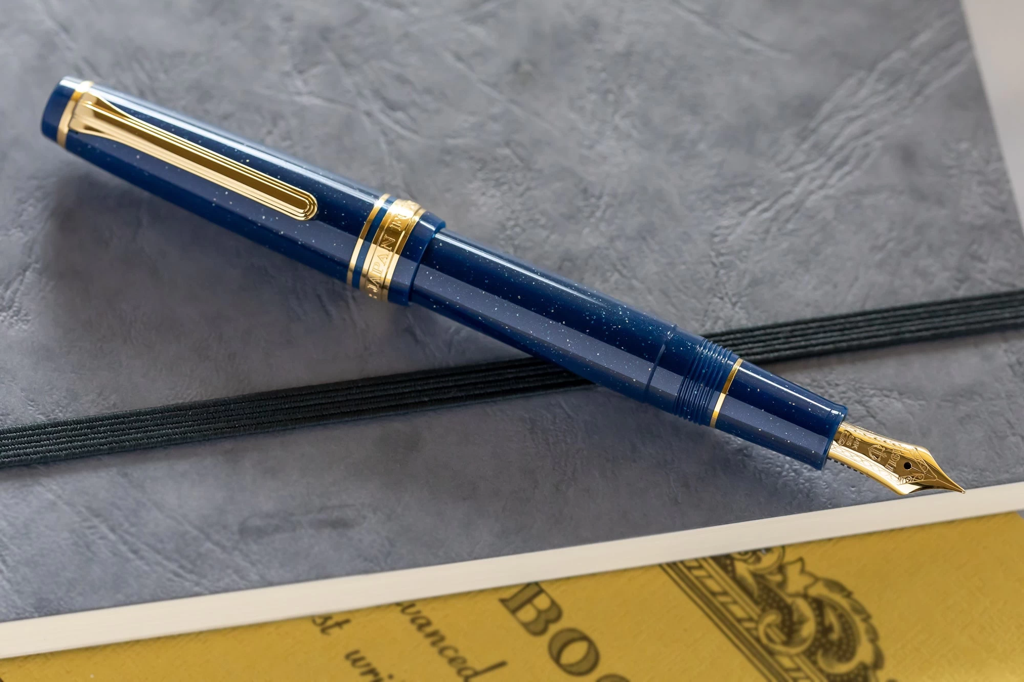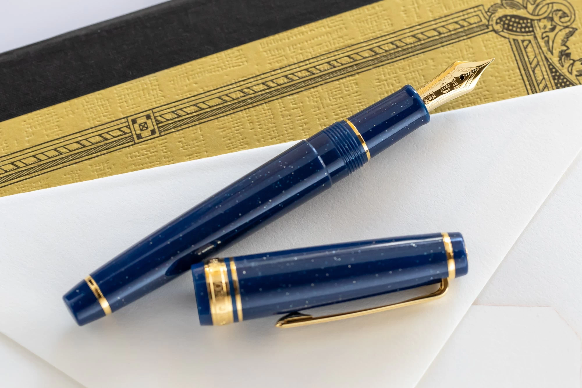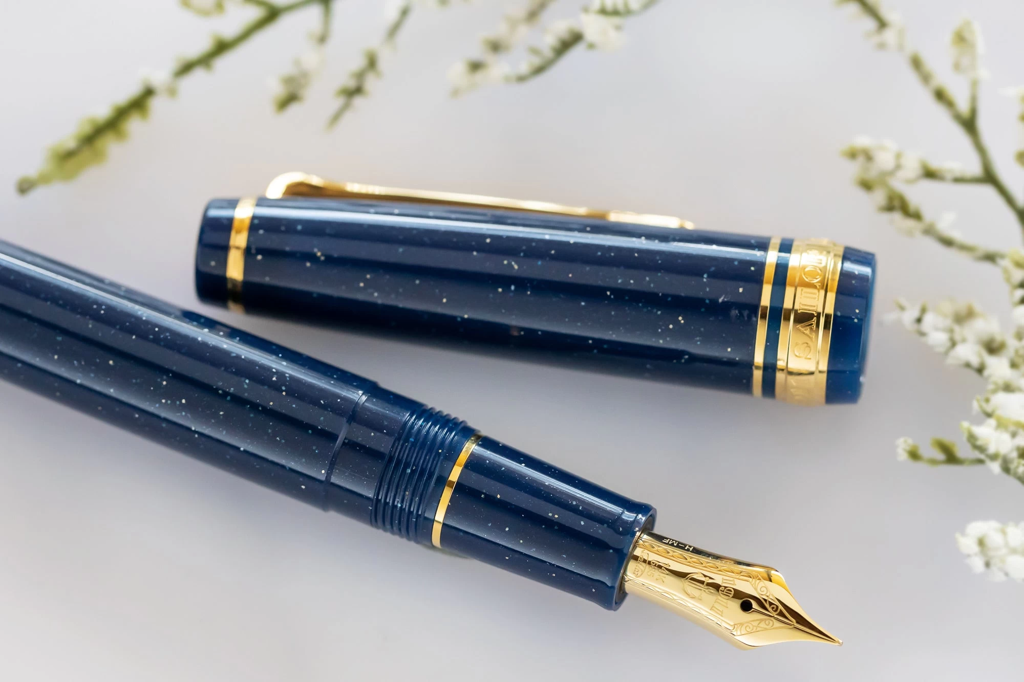 This Sailor Pro Gear Slim Vega fountain pen features a glittering navy blue resin barrel, cap, and finials, all complemented by gold-plated accents. This is one of four colors as part of Sailor’s Shikiori Special Edition Japanese Fairy Tale collection. The flat top cap features the Sailor anchor logo inset into the top finial. It comes equipped with Sailor’s legendary 14k yellow gold nib in medium fine. The cap screws to open/close and can push to post onto the back of the barrel when writing. The Professional Gear Slim fountain pen comes with a Sailor proprietary converter as well as two proprietary Sailor Black ink cartridges.