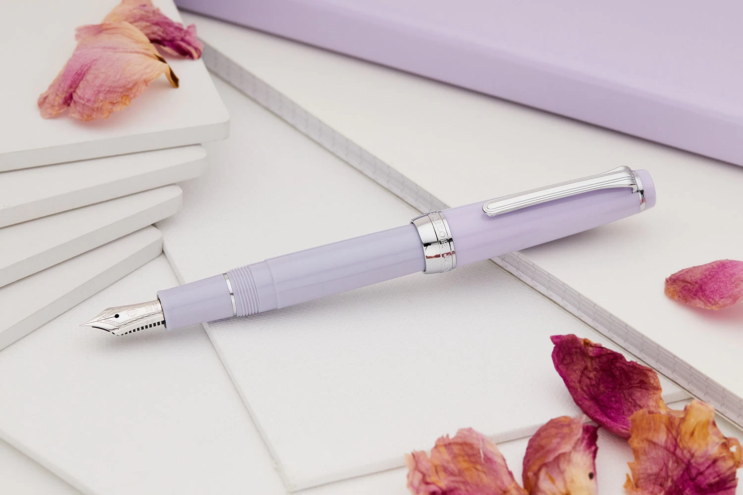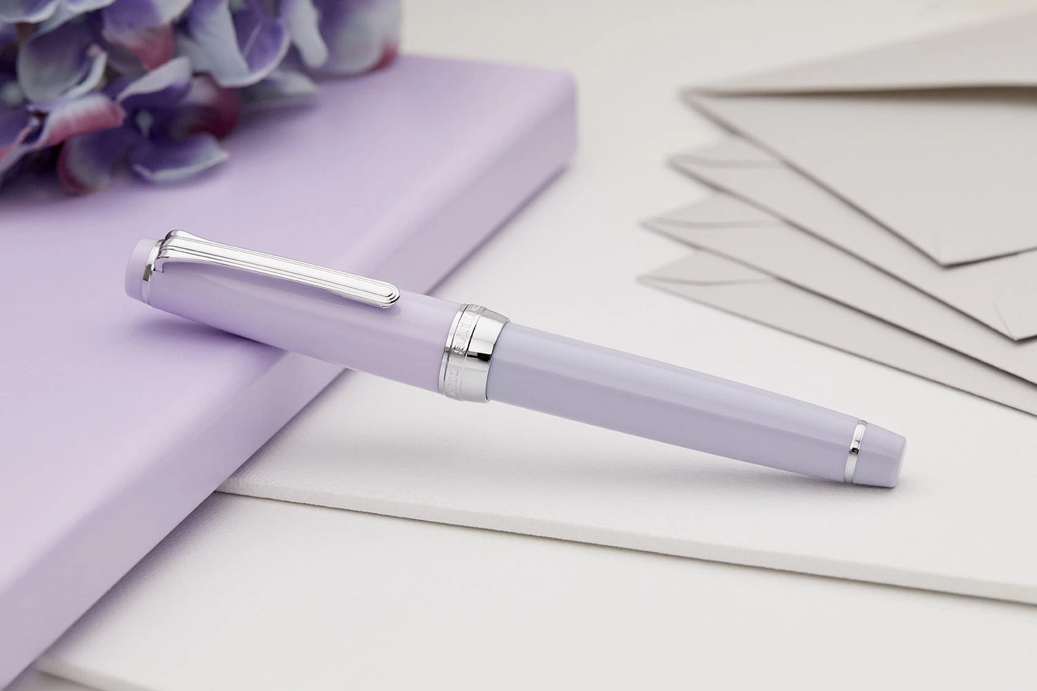 Introducing the third in Sailor’s annual release of the Pillow Book series – the Professional Gear Winter Sky. This special edition pen captures the feel of a fresh winter’s morning with the gentlest of lilac colors set against frosty, white gold accents.