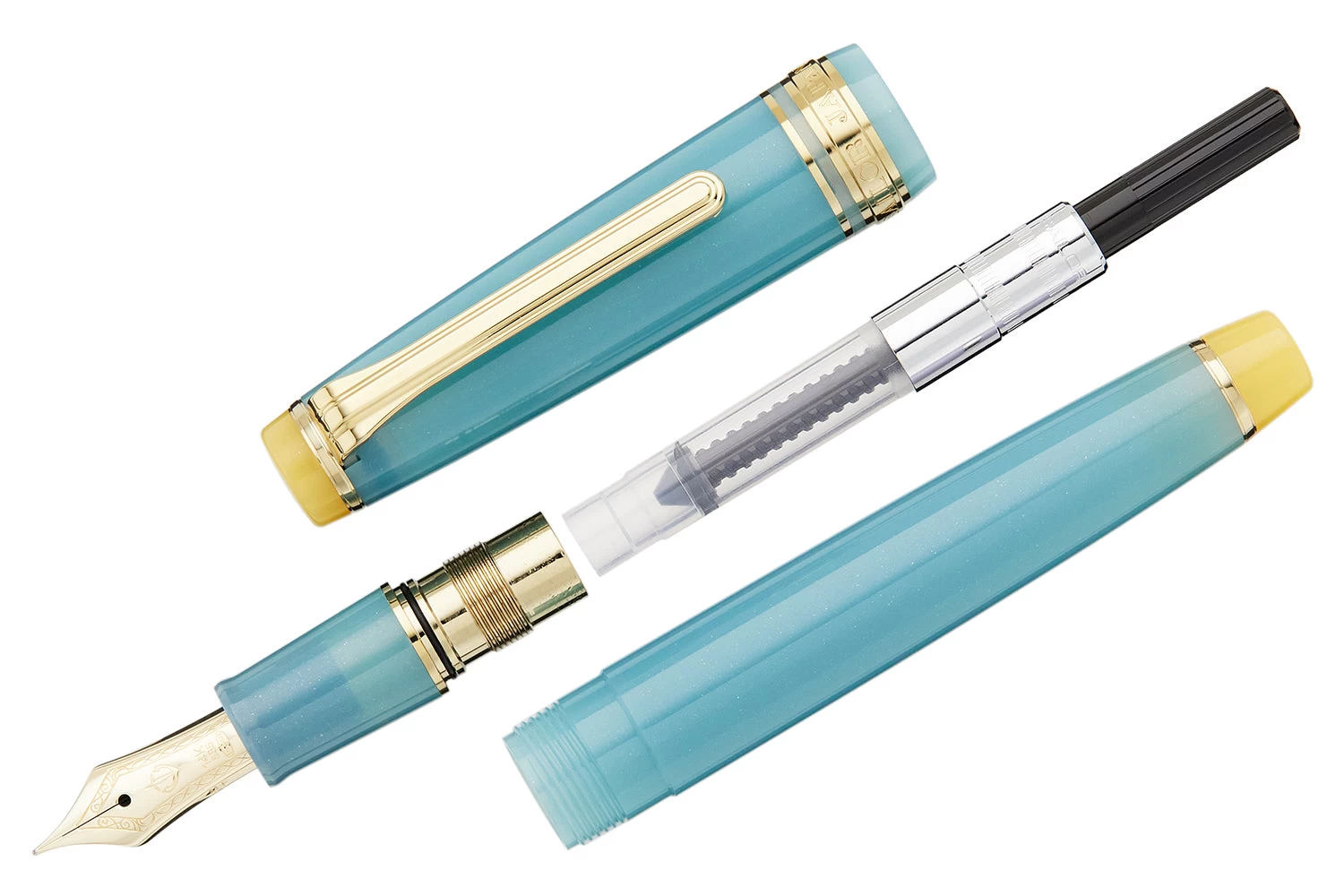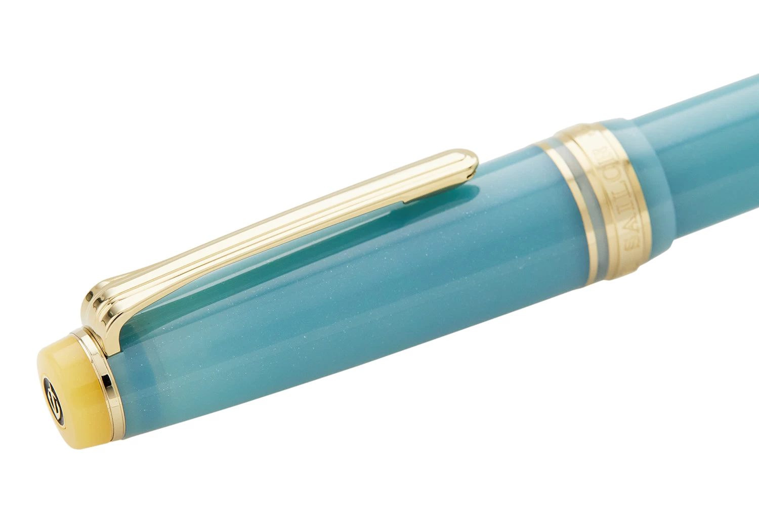 This fountain pen, Yuzuyu, is the essence of a yuzu citrus bath – a remedy said to ward off colds during the winter season – with a shimmering freshwater blue barrel set against yuzu yellow finials.
