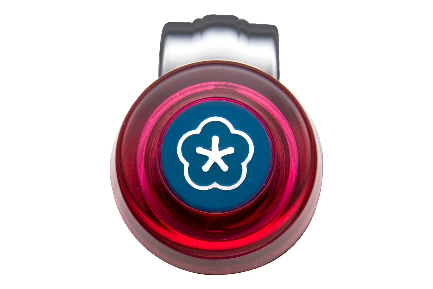 This Plum Pro Gear Slim fountain pen features a resin body inspired by the blue Sailor Manyo Yomogi ink, with finials inspired by the red Sailor Manyo Ume ink. It is complemented by silver trim, and the top finial features a star.