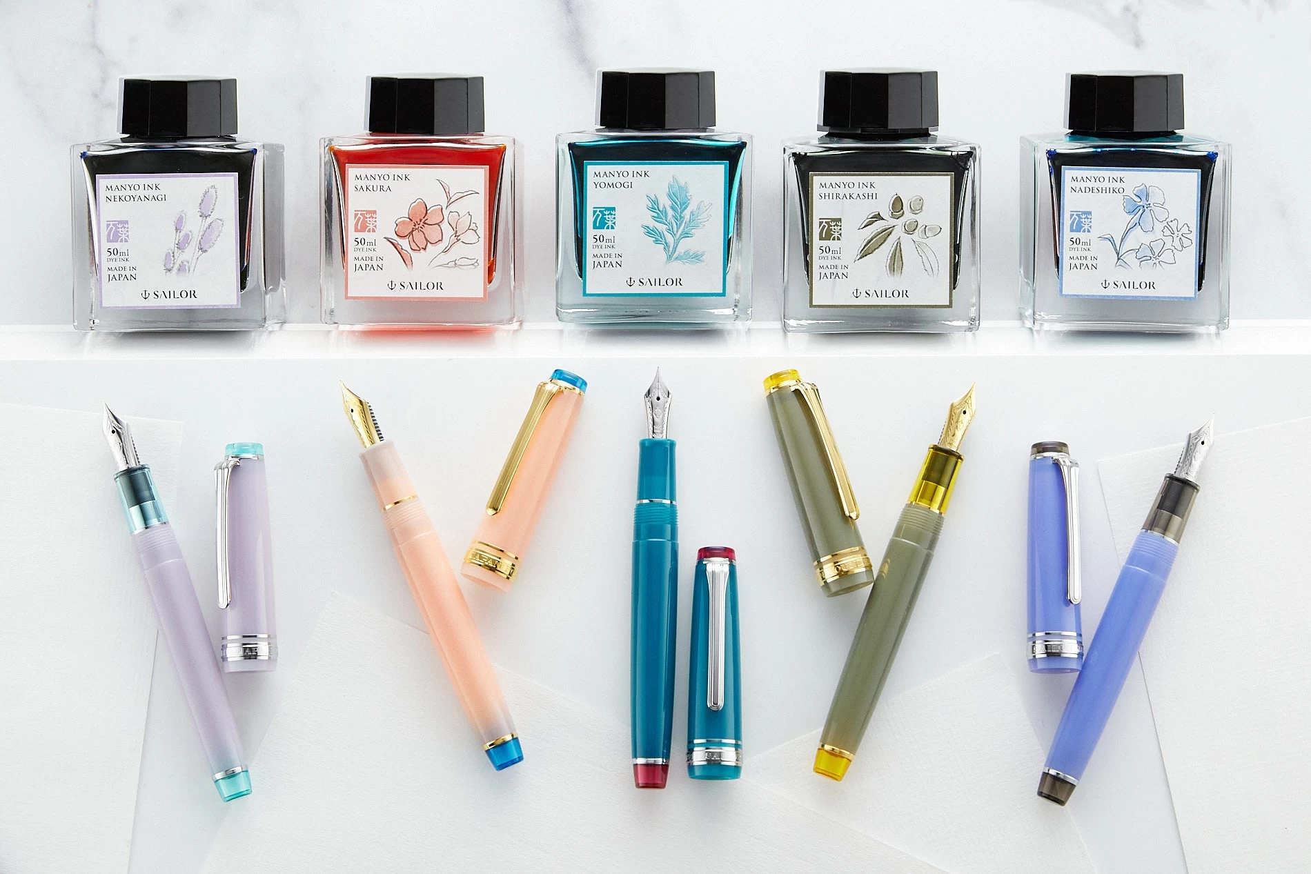 The companion pens to the much-loved Manyo inks are finally here! Each pen in the Special Edition Sailor Manyo Fountain Pen collection was inspired by two Manyo inks, resulting in exciting new color combinations with exclusive top finial designs.