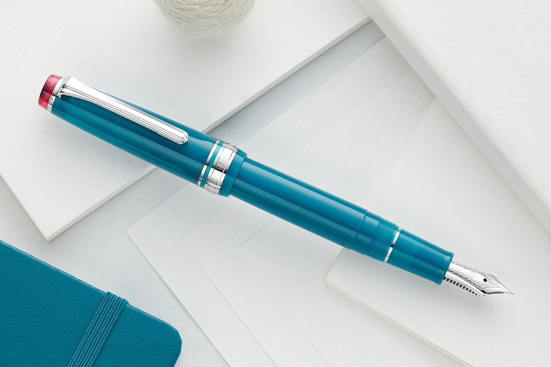 This fountain pen is sold as a set with an included 50ml bottle of Sailor Manyo Yomogi blue ink to match, as well as a cartridge converter.